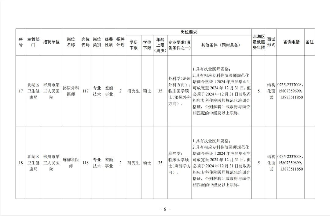 招聘岗位的专业、学历、学位及其他咨询:郴州市北湖区卫生健康局人事股或招聘单位(0735-2337008,15807359699,13873511850)。