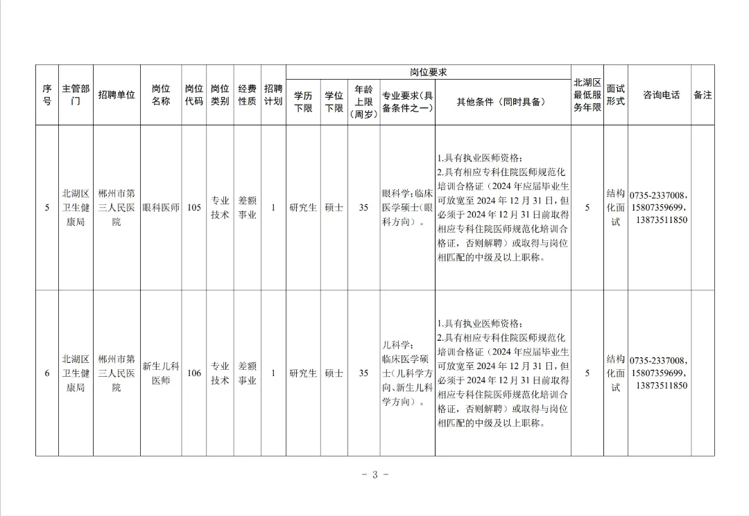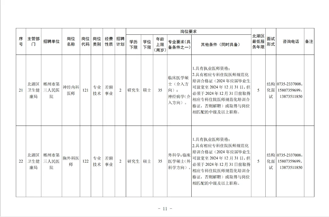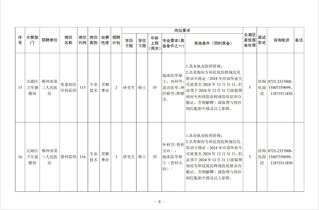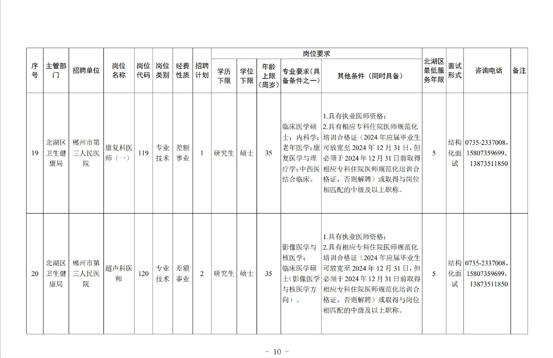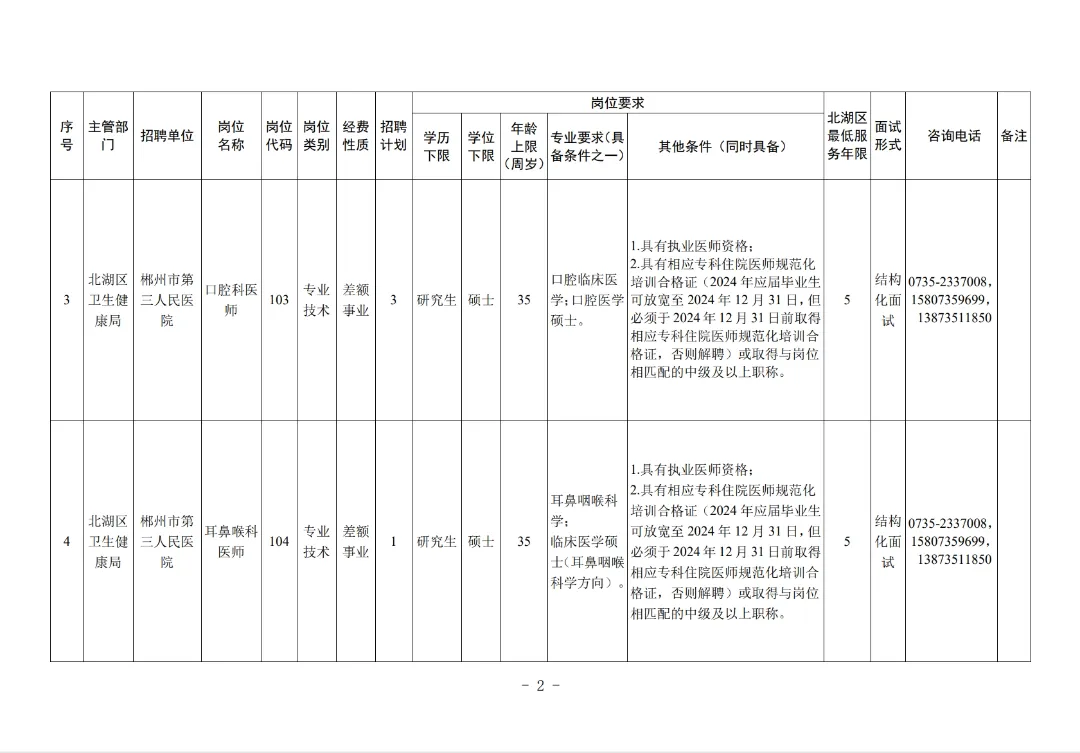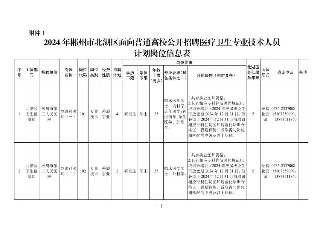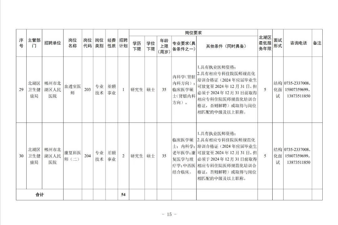 1.2024年郴州市北湖区面向普通高校公开招聘医疗卫生专业技术人员54名。招聘岗位、计划数及资格审查条件等详见《2024年郴州市北湖区面向普通高校公开招聘医疗卫生专业技术人员计划岗位信息表》(附件1,以下简称《岗位信息表》)。