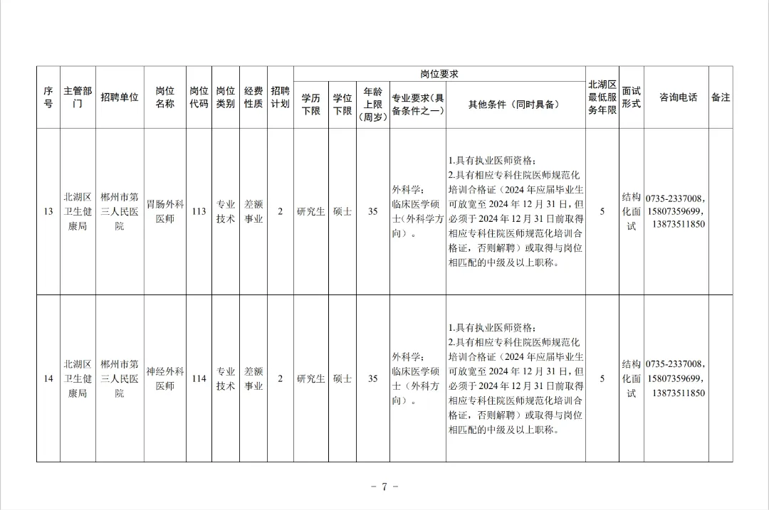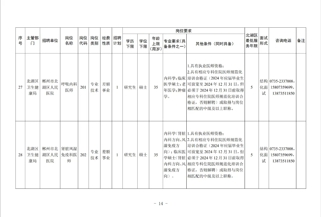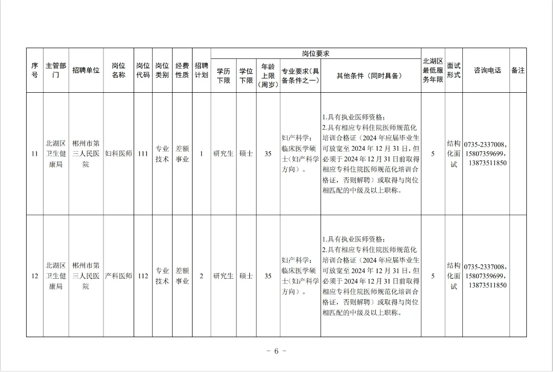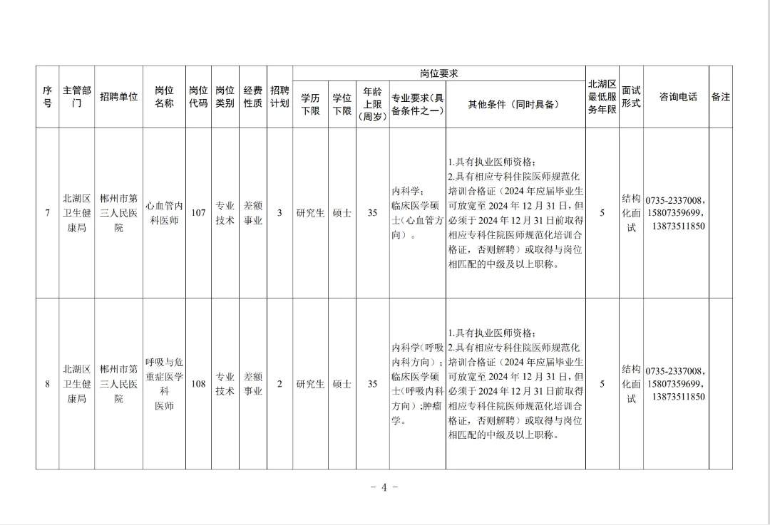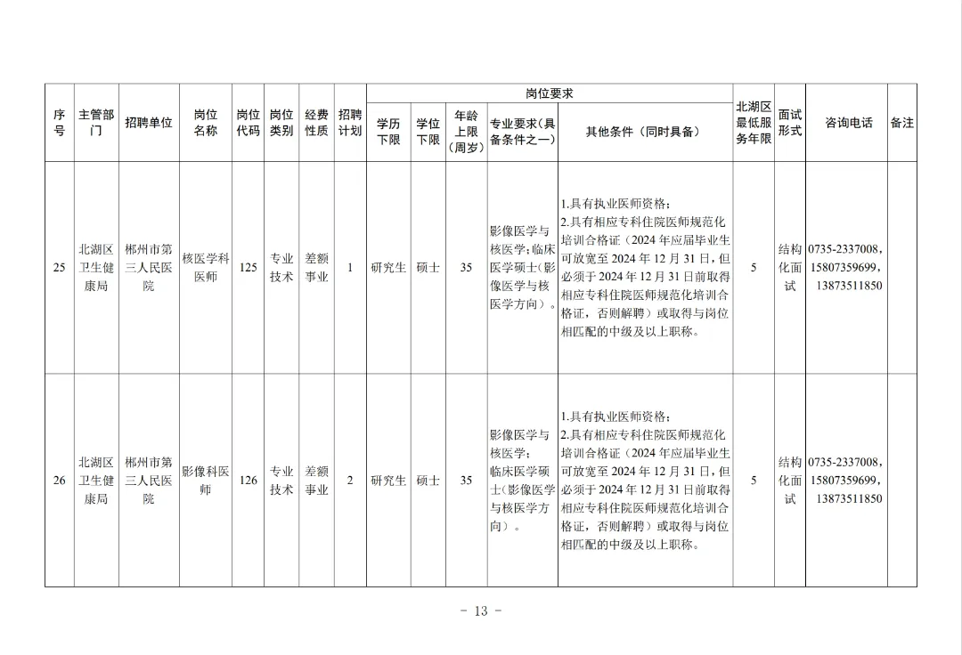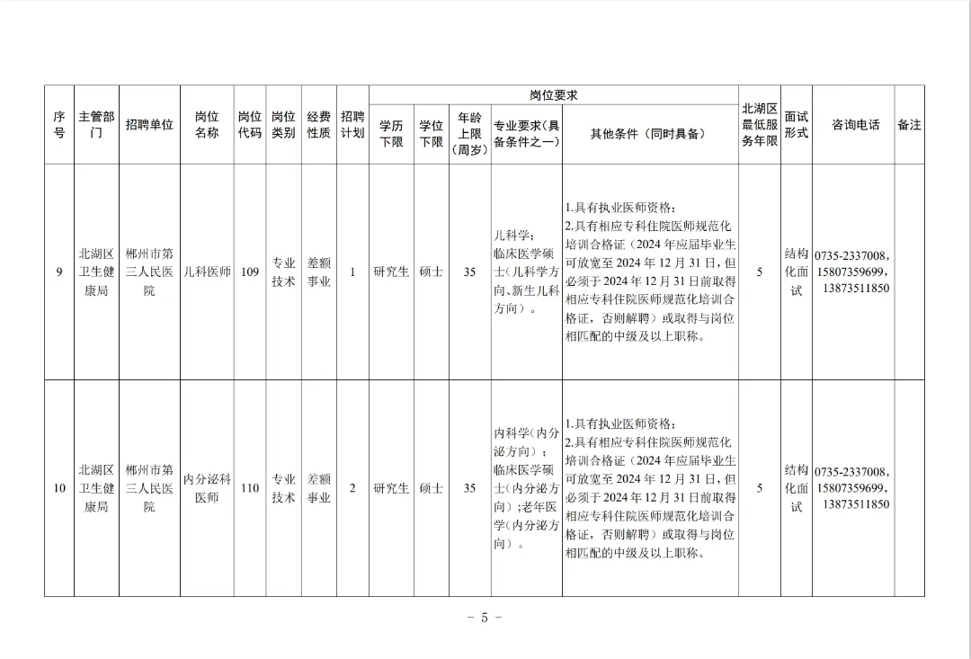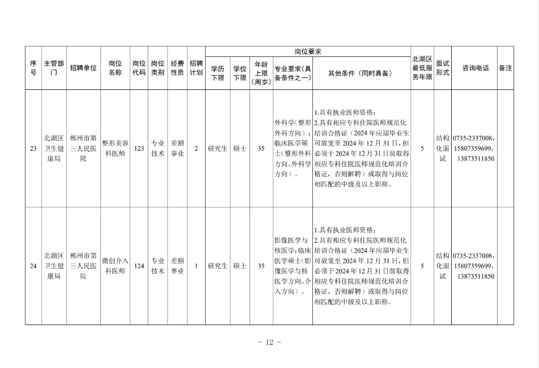 1.2024年郴州市北湖区面向普通高校公开招聘医疗卫生专业技术人员54名。招聘岗位、计划数及资格审查条件等详见《2024年郴州市北湖区面向普通高校公开招聘医疗卫生专业技术人员计划岗位信息表》(附件1,以下简称《岗位信息表》)。