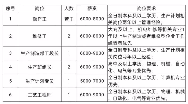6、机修2名,薪资7000-7500,持有焊工操作证,有相关工作经验者优先。