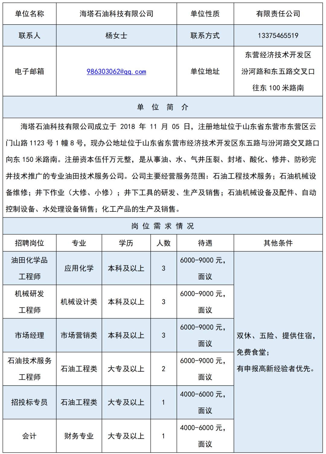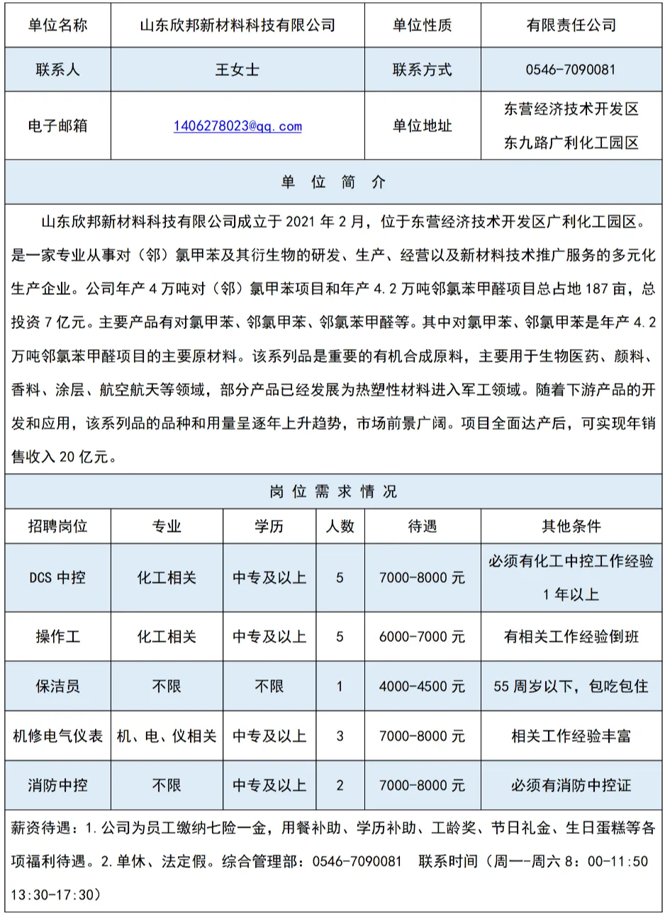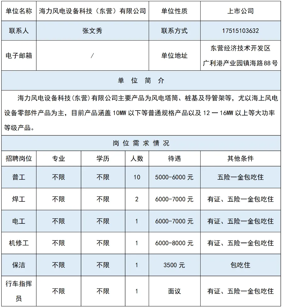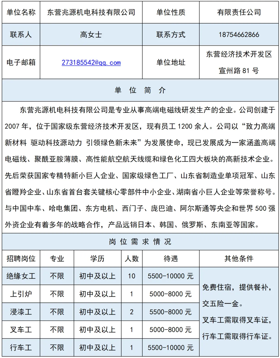 招聘操作工:要求男性,年龄60岁以下,能熟练操作切割机、磨光机、手电钻,日常工作配合钢结构、基建下料等辅助工作,能吃苦耐劳,试用期一个月,试用期工资6000,转正后根据工作能力再定工资,有电焊经验者工资可面谈。因工作需要,起航托管中心计划招收生活管理员一名,不要兼职,星期一到星期五上班,一个星期上(一天)早班6:50到,必须上,8点到下午2点半,晚班4:30到7:00左右可以选择不上,星期六星期天休息,西城济南路西五路实验小学旁边,要求:45周岁以内,对学生有爱心,有耐心,有责任心。要求:男性,55岁以下,没有职业病,有过叉车经验。待遇:一天三顿管吃,4人空调间管住,免费提供被褥枕头、劳保用品,全勤奖等,薪资6500-7200麦便利定位“社区生鲜超市”,分布于东营区域东城、西城、新区,现因经营发展需要诚聘以下岗位:其他福利:月休4天,8小时工作制,五险,餐补,节假日福利等。 店面工作地点:悦来康苑、金融小区、府前小区、万达高尔夫花园、瑞景国际公馆、华山小区、光明家园逸园、东方银座花园、华都世纪城,悦来新城,明月华庭以上地点可就近安排,其他地点详情电话咨询。推荐有奖,欢迎报名商贸公司招聘流通司机2名,月薪保底6000元,要求,男性,身体健康,吃苦耐劳,服从管理,月休三天,13854635668胜大超市锦华店厂家招聘促销员,每天100元加提成,13854635668另外,厂家招聘流通促销员东西城各招2名,每天100元,13854635668商贸公司招聘仓库配货员,月薪4200元,工作地点,钻井附近,13854635668夏季:7:30-11:00 13:30-17:00周六周日11--15:00,17--22:00需要服务人员女士,年龄:40周岁以下,五官端正、口齿伶俐、性格开朗,热爱美妆护肤,有相关销售经验者优先因是内招,不对外。工作时间灵活,工作量不大。根据内招安排上班。因幼儿园发展需求,面向社会公开招聘幼儿园教师1名。教师:学前教育毕业,有教师资格证,有教学经验者优先。 本店招收人才条件须身体健康,吃苦耐劳,有责任心!长期人员!要求长期!福利待遇:五险一金、餐补、交通补、月休6天、节日福利、年假。(早8:30上班)单位地址:东营市东七路与北一路交叉口东辰电力产业园工作内容:骑着三轮车给马路上共享电动车换电瓶/调车/找车/摆车计件工资,多劳多得,室外工作。不能适应室外工作和不会骑三轮车的不要联系我要求:18至55岁,能较熟练操作手机, 室外工作,能吃苦耐劳,服从公司管理。13287379865电话微信同号专业要求:专科及以上,计算机相关专业、数字传媒、电子商务等相关专业(有计算机基础)薪资待遇:工资+绩效(2000+绩效),三个月后综合3000+3、工作时间内容:每天早上4点-10点收各小区和办公区垃圾,下午没有特殊情况正常休息。4、要求:男女不限,B1证以上,年龄58岁以下,身体健康,工作长期稳定,有五年以上大车工作经验,开过垃圾清运车的优先。5、待遇:月休2天,交五险,月薪4000+,食宿自理