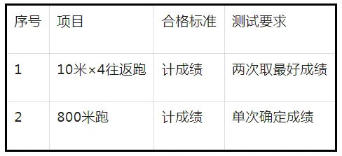 3.体能测试共设2个项目,分别为10米×4往返跑、1000米跑(女800米跑)。10米×4往返跑测评次数为2次(取最高成绩记入)、1000米跑(女800米跑)测评次数为1次。