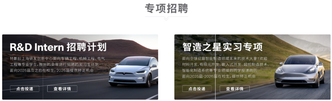 除了这两种招聘外,特斯拉这次还放出了两种专项招聘,想要跟进项目或者自身能力较强的同学们也可以往这里看看