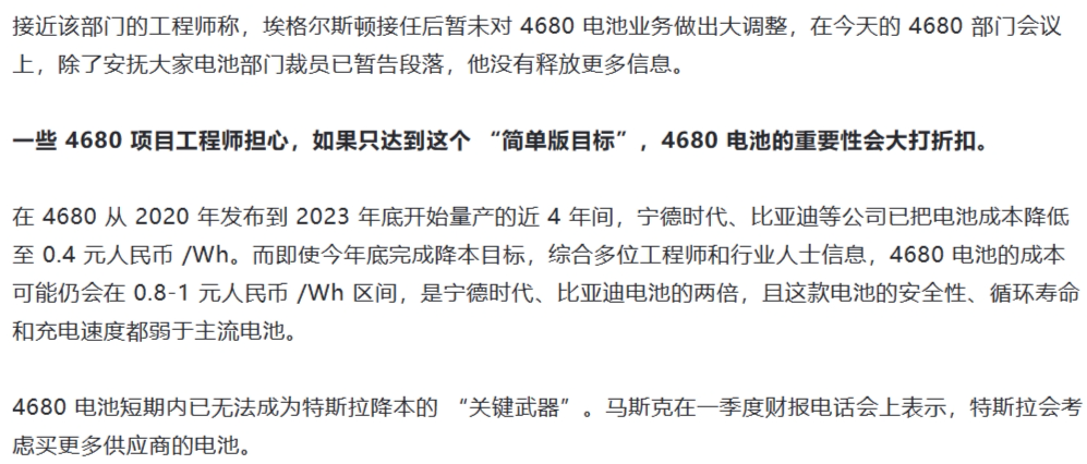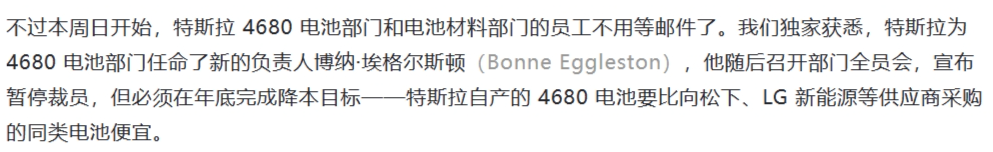 当特斯拉大规模的裁员开始后,特斯拉内部员工也是人心惶惶,甚至没有收到离职邮件的员工也都在等邮件。不过随即特斯拉便又宣布 4680 电池部门和电池材料部门的员工不用等邮件了。根据huxiu报道,特斯拉为 4680 电池部门任命了新的负责人Bonne Eggleston,并且必须在年底完成降本目标—特斯拉自产的 4680 电池要比向松下、LG 新能源等供应商采购的同类电池便宜。