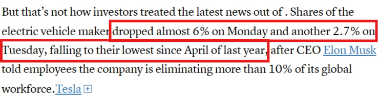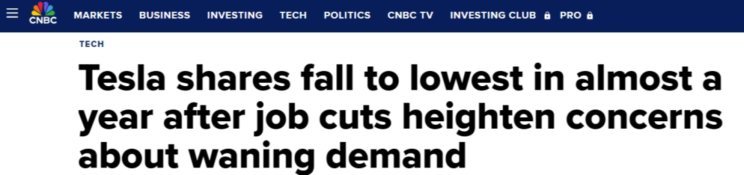 但是在特斯拉大规模裁员后,好像事情并没有像马斯克预计的方向发展...在特斯拉裁员后,特斯拉的股价就开始了下跌。它的股价先是下跌近6%,后一天又下跌2.7%,跌至去年4月以来的最低水平