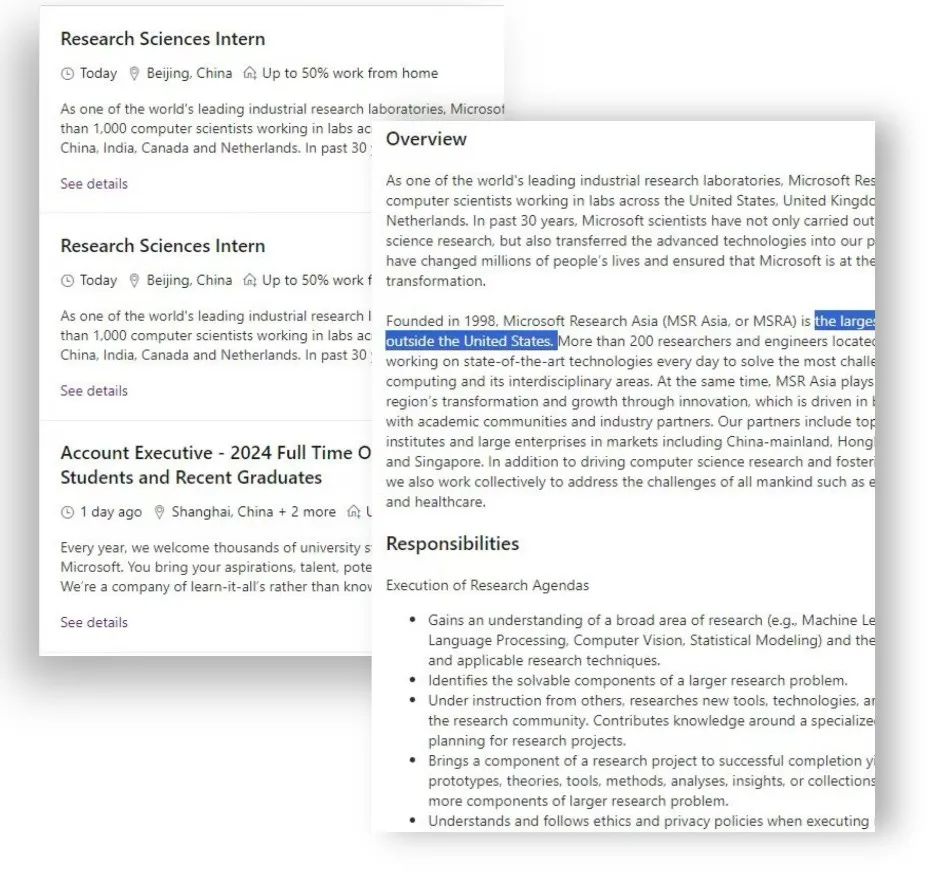 对于已经打算回国就业的留学生们来说,中国地区的岗位选择也非常丰富。与美国地区不同的是,中国地区开放的岗位主要集中在微软亚洲研究院(除美国外微软最大的研究实验室)和MCAPS部门(制造、供应链、信息服务)。因此,岗位选择就不止局限于理工科啦,金融服务、工商管理、零售等相关专业的同学也有岗位可投~