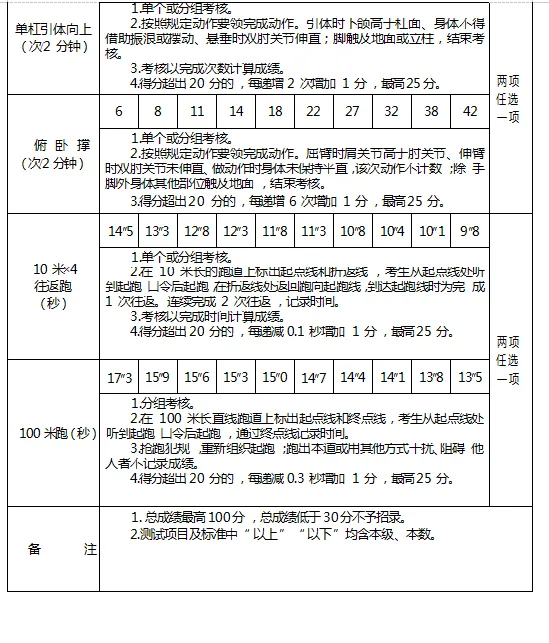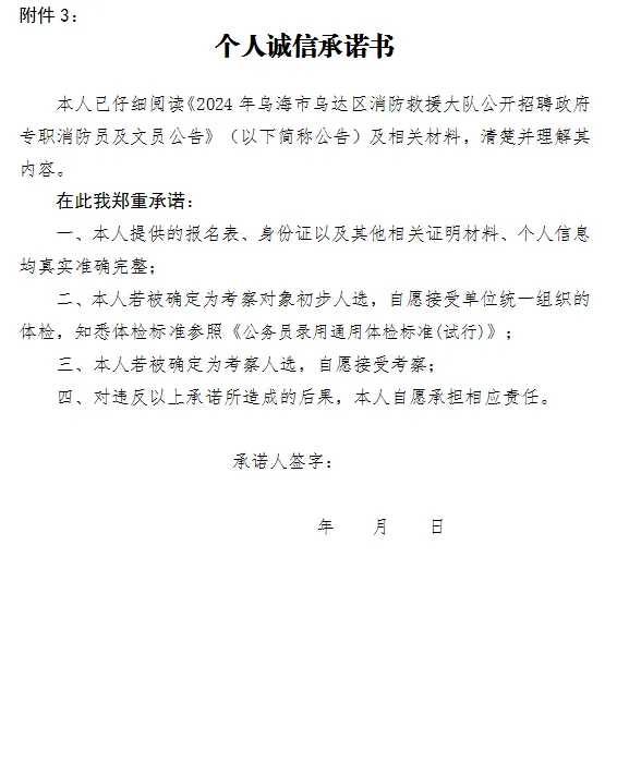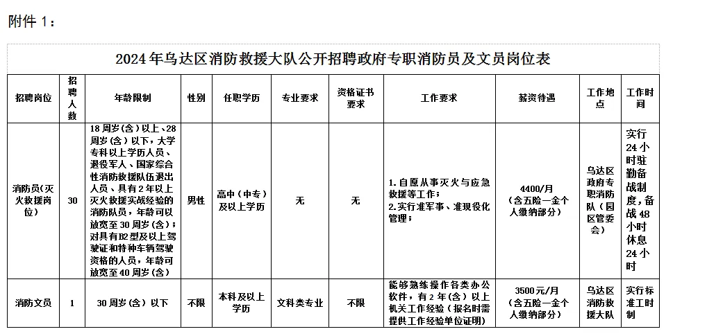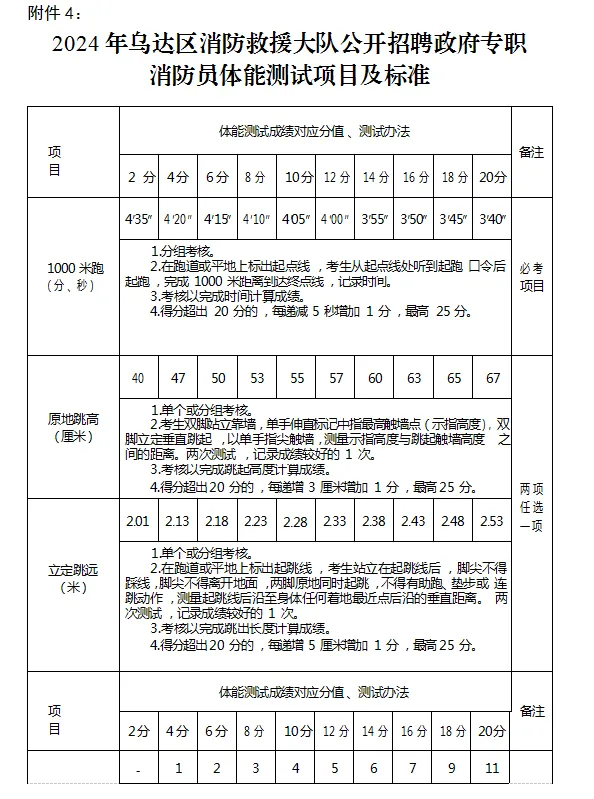 回复“招聘”查看更多招聘岗位 乌海市乌达区消防救援大队面向社会公开招聘30名政府专职消防员及1名消防文员乌海市乌达区消防救援大队委托内蒙古众达人力资源有限责任公司面向社会公开招聘30名政府专职消防员及1名消防文员,现将有关事项公告如下:(二)坚持德才兼备、以德为先;重操守、重能力的原则。(一)招聘计划:本次面向社会公开招聘政府专职消防员30名,均为灭火救援岗位人员;大队消防文员1名,从事消防监督检查辅助、档案资料整理、文秘写作等工作。(二)具体岗位及条件:详见《2024年乌达区消防救援大队公开招聘政府专职消防员及文员岗位表》(见附件1)。2.遵守中华人民共和国宪法和法律,拥护中国共产党领导和社会主义制度;3.铸牢中华民族共同体意识,自觉维护民族团结进步;4.品行端正,具有履行职责所需的身心素质和工作能力;(1)国家综合性消防救援队伍退出人员(不含辞退、开除);(5)具有B2及以上驾驶证和特种车辆驾驶资格的人员。1.参加非法组织、邪教组织或者从事其他危害国家安全活动的;2.编造、散布有损国家声誉的言论或者信息,反对党的理论和路线方针政策,违反国家法律法规的;6.被开除公职、开除军籍或者因违纪违规被辞退解聘的;11.全日制在校学生(不含2024年应届毕业生);招聘程序包括信息发布、资格审查与报名、体能测试、心理测试、面试、考察政审、体检、公示、聘用。(一)本次招聘公告在内蒙古云智慧考务中心、乌海市消防微信公众号、乌达区微信公众号、内蒙古众达人力资源微信公众号上进行发布。1.报名时间从2024年5月30日起至6月3日止(双休日不休息)。每日上午9:00-12:00;下午15:00-18:00。报名地点:内蒙古众达人力资源有限责任公司(市文体中心外围西侧)。联系电话:0473-2665036;131349890181.报考人员须在规定的时间内报名,并携带本人身份证、户口簿、学历证书、教育部电子注册备案表或中国高等教育学历认证报告、退伍证、国家综合性消防救援队伍退出消防员登记表或原单位工作证明、具有2年以上灭火救援实战经验的消防队员工作经历证明、以及其他岗位要求的相关证书原件和复印件,近期同底2寸免冠彩照3张,并认真填写报名表(见附件2),凡报考消防文员岗位人员需要缴纳80元报名费。2.报考人员在填写简历时,须完整填写从高中(中专)毕业至今的所有经历,时间不能断开或空缺。3.资格初审与报名工作同步进行,通过资格初审的,不得再报考其他岗位。4.报考人员报名前应认真阅读《公告》并签署个人诚信承诺书(见附件3),每名应聘人员限报一个岗位。考生报名时须按照公布的报考条件和岗位要求,如实填写报名信息。如个人填报信息失真、不符合报考条件和岗位要求,由此造成的一切后果,责任自负。资格审查贯穿招聘工作全过程,在招聘各环节发现应聘人员不符合招聘资格条件的,均可以取消其报考资格或者聘用资格。 5.资格初审对于符合报考条件的报考者,不得拒绝报名;对不符合报考条件的报考者,应当说明理由。考生对审查意见存在异议的,在审查意见提出后的1个工作日内与工作人员咨询并确认,未在规定时间内提出异议的不予受理。1.消防员岗位考试内容为体能测试、心理测试、面试。体能测试、心理测试、面试及资格复审,具体时间、地点及有关要求另行通知,请考生及时关注众达人力资源微信公众号及保持手机畅通。消防员招聘人数与实际报考人数比例应达到1:2方可开考。文员招聘人数与实际报考人数比例应达到1:3方可开考。未达到开考比例,根据实际情况,经本次招聘领导小组研究后,采取延长报名时间、相应核减招聘人数或适当调整开考比例等方式确定开考情况。体能测试工作由乌达区消防救援大队负责组织实施。报考人员须携带本人有效期内居民身份证件(居民身份证或临时身份证)参加体能测试。体能测试具体时间、地点等要求通过众达人力资源微信公众号或预留联系电话另行通知。(1)测试项目及标准。体能测试参照《国家综合性消防救援队伍消防员招录体能测试、岗位适应性测试项目及标准》执行,共分为四个项目:1000米跑(必考项)、原地跳高或立定跳远(两项任选一项)、单杠引体向上或俯卧撑(两项任选一项)、10米×4往返跑或100米跑(两项任选一项)(具体项目分值、标准及注意事项见附件4)。(2)体能测试成绩确认及公布。体能测试满分为100分,合格线为30分。体能测试每项结束后,现场公布成绩,报考人员在成绩登记表上签字确认成绩,如对测试结果有异议的需在测试现场提出,由工作小组成员负责仲裁。每项体能测试只有一次机会,不设置补测环节。体能测试成绩未达到合格线或未按规定时间参加体能测试的,视为体能测试不合格。体能测试成绩在众达人力资源微信公众号上公示。(3)注意事项。体能测试属于剧烈运动,因个人身体等原因无法坚持体能测试的以及患有心脏病、高血压、肝功能异常等疾病等不适合剧烈运动的应聘人员,应慎重选择,确保自身安全。如坚持参加体能测试发生意外,后果由报考人员承担。体能测试合格者,进入心理测试环节。应聘人员须携带本人有效期内居民身份证件(居民身份证或临时身份证)参加心理测试。心理测试成绩在众达人力资源微信公众号进行公示。(1)测试方式。心理测试采用“国家综合性消防员招录心理测试系统”进行,测试采