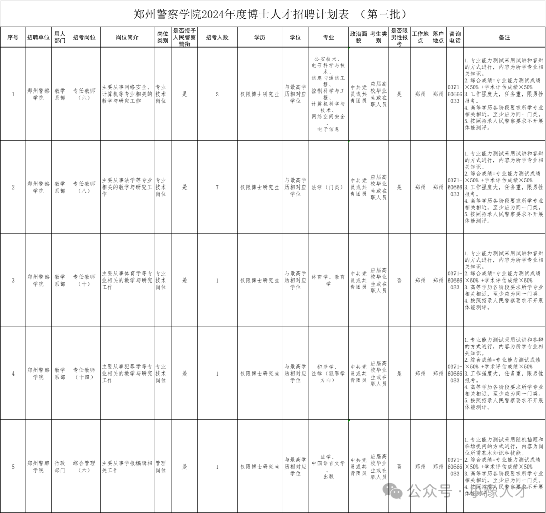 按照《郑州警察学院2024年度人才招聘公告》,博士研究生岗位采用“分批测试、计划额招满为止”的方式开展招聘工作,在博士人才招聘第一批、第二批测试中完成招聘计划的岗位不再进行后续招聘。根据前期招聘情况,经研究决定对博士人才招聘未满岗位进行补录(第三批),报名截止时间6月6日,测试工作于6月12日开展,现将有关事项通知如下: 一、 招聘岗位及人数 第三批招聘共5个岗位,拟招聘工作人员13名。具体职位信息及资格条件详见《郑州警察学院2024年度博士人才招聘计划表(第三批)》。
