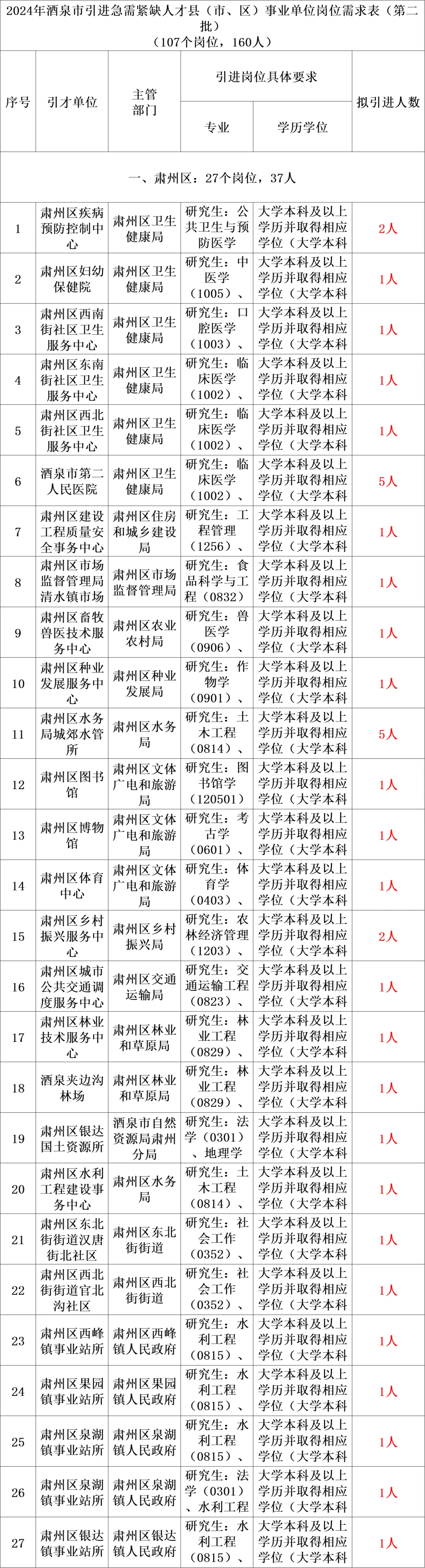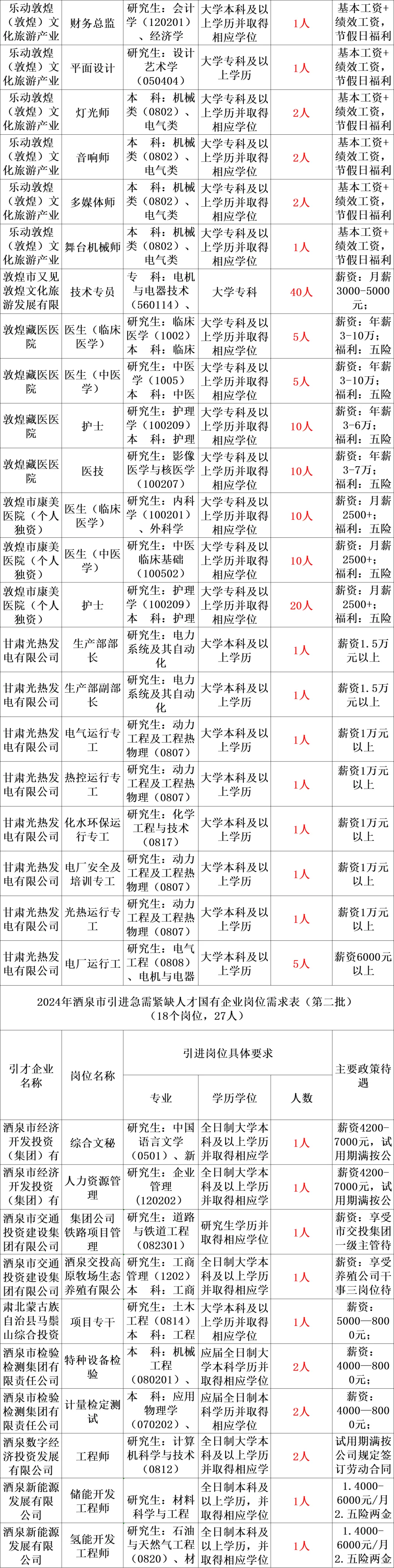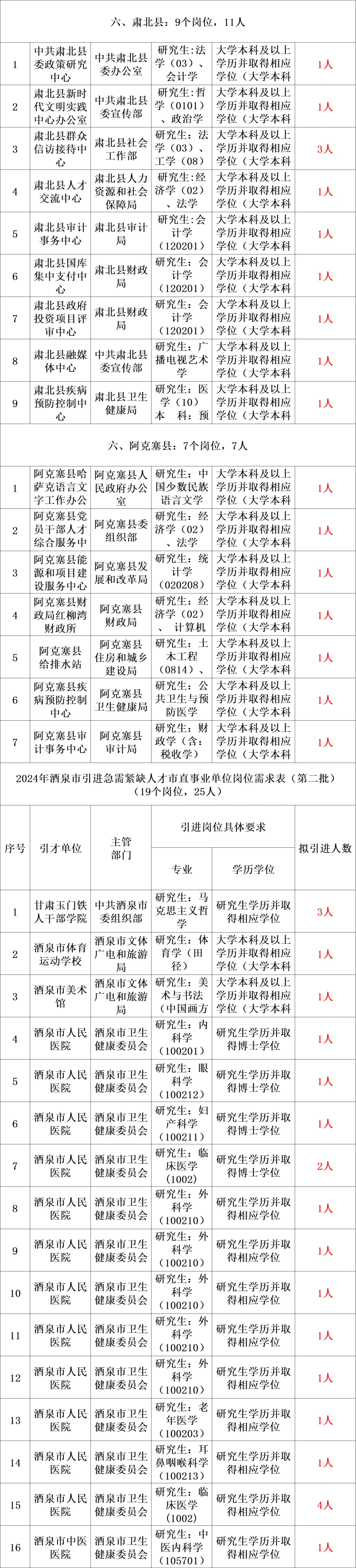 2024年甘肃省酒泉市 引进急需紧缺人才(第二批)公告 为贯彻落实党的二十大及省委、市委人才工作会议精神,深入实施人才强市战略,优化人才队伍结构,助力全市经济社会高质量发展,根据事业单位公开招聘有关规定和《酒泉市急需紧缺高层次人才引进管理办法(修订)》,决定开展2024年酒泉市第二批公开引进急需紧缺人才工作,现就有关事项公告如下: 一、引进计划 本批次拟引进符合岗位条件要求的各类人才1051名,其中市直事业单位25名,县(市、区)事业单位160名,市县国有企业27名,中央、省属驻酒企业和市县民营企业839名,具体岗位及要求详见附件。 二、引进对象(2024年酒泉市引才高校范围详见附件5) 1.卫生健康系统引进对象 “双一流”建设高校、省部共建及省、自治区、直辖市属重点医学类院校本科及以上学历医学类专业毕业生。 2.其他事业单位引进对象 (1)“双一流”建设高校本科及以上学历毕业生; (2)普通高校硕士研究生及以上学历毕业生。 3.“高精尖”人才引进对象 全日制博士研究生或正高级职称人员。 4.留学人员引进对象 QS世界大学排名前500名高校本科及其他国外大学研究生学历并取得教育部留学服务中心出具的国外学历学位认证书人员。 三、资格条件 (一)基本条件 1.具有中华人民共和国国籍,遵守宪法和法律,拥护中国共产党领导和社会主义制度。 2.必须有正确的政治立场和政治态度,认真学习习近平新时代中国特色社会主义思想,树牢“四个意识”,坚定“四个自信”,坚决做到“两个维护”,自觉践行社会主义核心价值观,爱党爱国爱社会主义,有理想抱负和家国情怀,甘于为国家和人民服务奉献。 3.具有良好的品行,服从工作分配,履行事业单位工作人员义务,遵守事业单位工作纪律。 4.具有正常履职的身体条件和心理素质,符合聘用体检标准。 5.应聘人员资格复审须同时取得毕业证和学位证。 6.年龄要求:应聘人员年龄应符合岗位简表中明确的年龄要求(截止时间2024年5月31日)。 7.法律、法规规定的其他条件。 8.符合公告中引进岗位的具体要求和其他要求。 (二)有下列情况之一的,不受理应聘 1.在校期间有违法违纪违规行为、学术不端和道德品行问题的。 2.曾因犯罪受过刑事处罚,在校或者工作期间受过处分,涉嫌违纪违法正在接受审查调查尚未作出结论的。 3.被开除中国共产党党籍、被开除公职的。 4.在各级单位招考中被认定有舞弊等严重违反录用纪律行为的。 5.被依法列为失信联合惩戒对象的。 6.人事(学籍)档案审核中发现影响聘用情形的。 7.公务员(含参照管理单位工作人员)及事业单位工作人员辞退未满5年的。 8.与引进单位领导成员有夫妻关系、直系血亲关系、三代以内旁系血亲关系以及近姻亲关系的。 9.酒泉市及所辖县(市、区)在编在岗的人员(含三支一扶”、进村进社等各类项目人员、服务期内的“各类订单定向生”、委托培养生)。 10.法律法规规定不得录用为事业单位工作人员的其他情形人员。 11.在职攻读学历(学位)人员,以及网络学院和成人教育学院毕业生。 (三)专业条件 应聘人员须具备岗位简表中明确的专业要求,专业条件设置为具体专业的,仅限于该专业的人员报考;专业条件设置为专业类的,则该专业类所包含的专业均为符合报考专业,专业名称以专业目录(附件4)为准。 有以下情形的按对应要求执行: 1.因参考目录不一致,应聘人员所学专业与岗位简表中所列目录不完全一致的,在同一门类专业目录下的以用人单位给出的标准为准,不属于同一门类专业目录的,不得报考(如:“信息与计算科学”专业与“计算机科学与技术”专业,虽然字面意思相近,但不属于同一类别,不能混淆)。 2.因国家教育行政主管部门专业更名(专业代码变更)导致所学专业与招聘专业名称不同,但确属同一专业的可报名,应聘人员需提供就读院校出具的证明材料或者教育部相关文件。 3.应聘人员留学期间所学专业未列入国家教育行政部门颁布的学科专业目录,但与招聘专业学习内容(研究方向)一致的,经用人单位研究同意的可报名(应聘人员须提供就读高校出具的一致性证明,并经国内第三方机构公正翻译)。 4.应聘人员因所在院校开设专业名称与国家教育行政部门颁布的学科专业目录名称不一致,但经所在院校书面证明确属同一专业的可报名。 四、引进程序 (一)报名 本次引才报名采取现场报名和网络报名相结合的方式进行,每名应聘人员限报1个岗位。报名不收取任何费用。 (一)现场报名。2024年6月4日上午10:00-12:00在南京大学仙林校区(南京市栖霞区仙林大道163号)学生就业指导中心302,举行“才聚酒泉·筑梦飞天”专场引才宣介活动,应聘人员持报名材料在宣介活动现场报名。现场报名的应聘人员必须同时在网上提交报名材料。 (二)网络报名。2024年6月4日9:00至6月14日18:00,市、县(市、区)事业单位和国有企业的应聘人员可通过网络报名。网络报名路径包括手机移动客户端和电脑PC端两种方式。 A.手机移动客户端:请在微信中搜索“酒泉人才”微信小程序或扫描下方小程序二维码,进入小程序后点击“人事考试”模块,选择对应公告进行报名。 B.电脑PC端:在电脑浏览器地址栏中输入“https://www.jqrc.net”进入酒泉人才网,点击进入“人事考试”栏目并选择对应公告进行报名。 应聘人员需提供以下材料: (1)《2024年酒泉市公开引进急