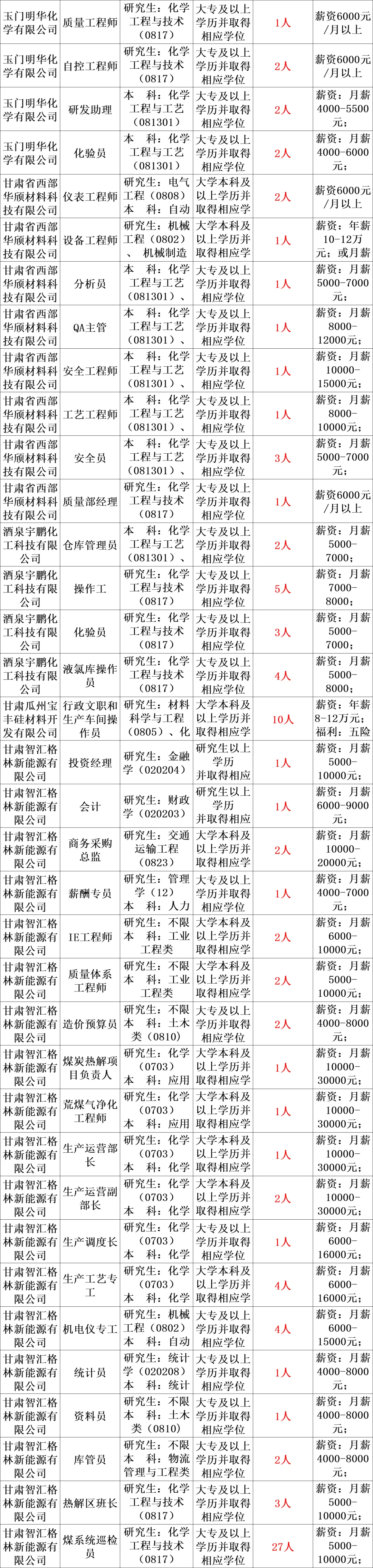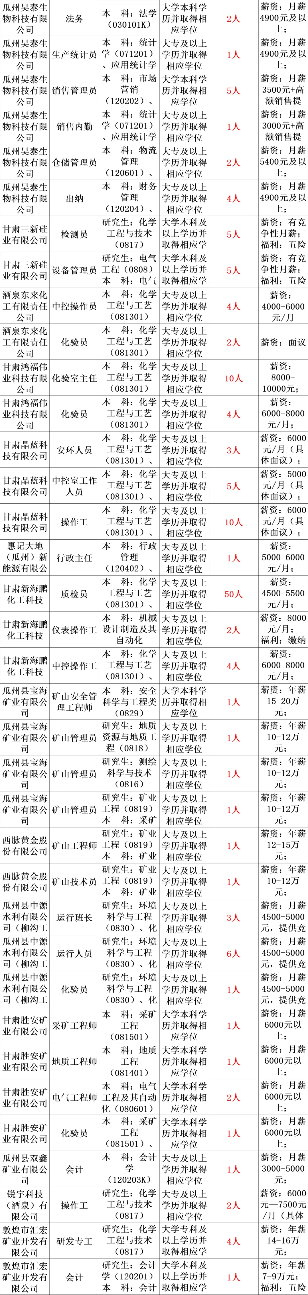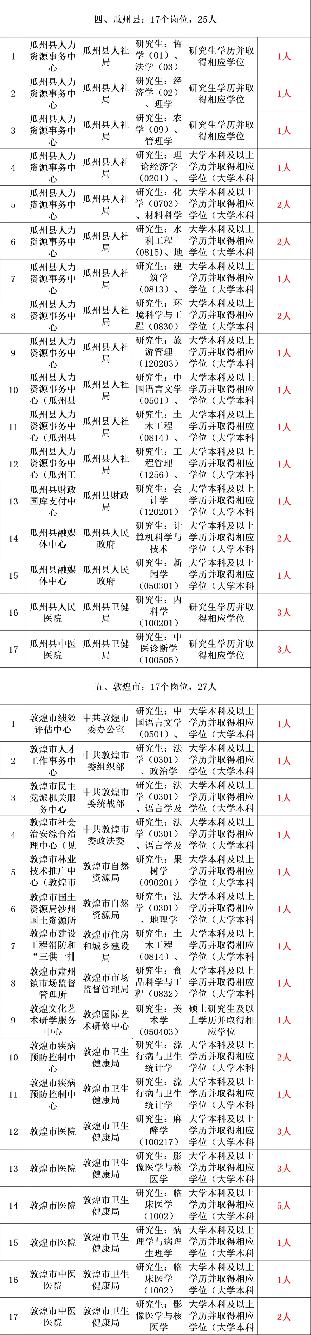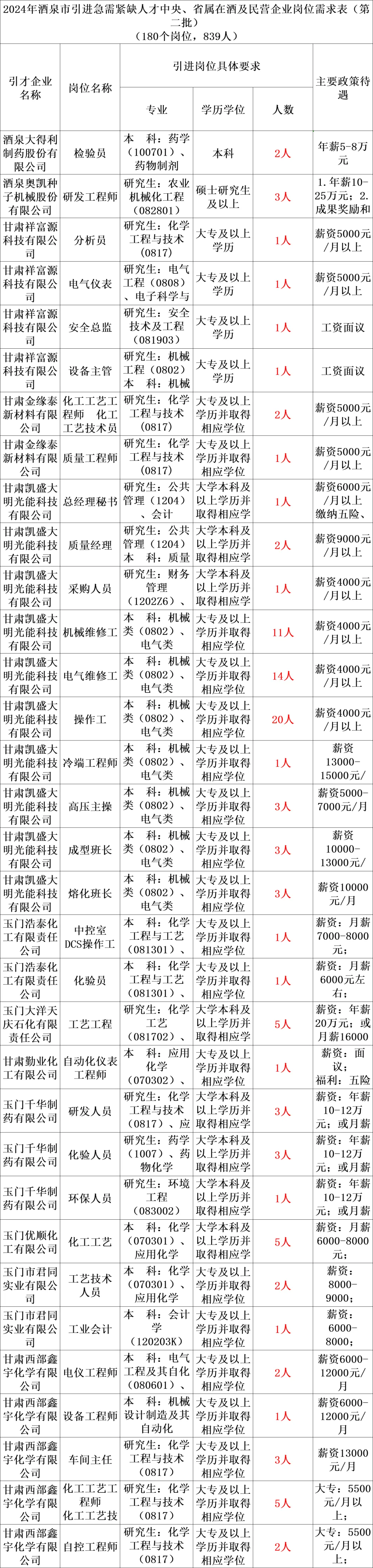 2024年甘肃省酒泉市 引进急需紧缺人才(第二批)公告 为贯彻落实党的二十大及省委、市委人才工作会议精神,深入实施人才强市战略,优化人才队伍结构,助力全市经济社会高质量发展,根据事业单位公开招聘有关规定和《酒泉市急需紧缺高层次人才引进管理办法(修订)》,决定开展2024年酒泉市第二批公开引进急需紧缺人才工作,现就有关事项公告如下: 一、引进计划 本批次拟引进符合岗位条件要求的各类人才1051名,其中市直事业单位25名,县(市、区)事业单位160名,市县国有企业27名,中央、省属驻酒企业和市县民营企业839名,具体岗位及要求详见附件。 二、引进对象(2024年酒泉市引才高校范围详见附件5) 1.卫生健康系统引进对象 “双一流”建设高校、省部共建及省、自治区、直辖市属重点医学类院校本科及以上学历医学类专业毕业生。 2.其他事业单位引进对象 (1)“双一流”建设高校本科及以上学历毕业生; (2)普通高校硕士研究生及以上学历毕业生。 3.“高精尖”人才引进对象 全日制博士研究生或正高级职称人员。 4.留学人员引进对象 QS世界大学排名前500名高校本科及其他国外大学研究生学历并取得教育部留学服务中心出具的国外学历学位认证书人员。 三、资格条件 (一)基本条件 1.具有中华人民共和国国籍,遵守宪法和法律,拥护中国共产党领导和社会主义制度。 2.必须有正确的政治立场和政治态度,认真学习习近平新时代中国特色社会主义思想,树牢“四个意识”,坚定“四个自信”,坚决做到“两个维护”,自觉践行社会主义核心价值观,爱党爱国爱社会主义,有理想抱负和家国情怀,甘于为国家和人民服务奉献。 3.具有良好的品行,服从工作分配,履行事业单位工作人员义务,遵守事业单位工作纪律。 4.具有正常履职的身体条件和心理素质,符合聘用体检标准。 5.应聘人员资格复审须同时取得毕业证和学位证。 6.年龄要求:应聘人员年龄应符合岗位简表中明确的年龄要求(截止时间2024年5月31日)。 7.法律、法规规定的其他条件。 8.符合公告中引进岗位的具体要求和其他要求。 (二)有下列情况之一的,不受理应聘 1.在校期间有违法违纪违规行为、学术不端和道德品行问题的。 2.曾因犯罪受过刑事处罚,在校或者工作期间受过处分,涉嫌违纪违法正在接受审查调查尚未作出结论的。 3.被开除中国共产党党籍、被开除公职的。 4.在各级单位招考中被认定有舞弊等严重违反录用纪律行为的。 5.被依法列为失信联合惩戒对象的。 6.人事(学籍)档案审核中发现影响聘用情形的。 7.公务员(含参照管理单位工作人员)及事业单位工作人员辞退未满5年的。 8.与引进单位领导成员有夫妻关系、直系血亲关系、三代以内旁系血亲关系以及近姻亲关系的。 9.酒泉市及所辖县(市、区)在编在岗的人员(含三支一扶”、进村进社等各类项目人员、服务期内的“各类订单定向生”、委托培养生)。 10.法律法规规定不得录用为事业单位工作人员的其他情形人员。 11.在职攻读学历(学位)人员,以及网络学院和成人教育学院毕业生。 (三)专业条件 应聘人员须具备岗位简表中明确的专业要求,专业条件设置为具体专业的,仅限于该专业的人员报考;专业条件设置为专业类的,则该专业类所包含的专业均为符合报考专业,专业名称以专业目录(附件4)为准。 有以下情形的按对应要求执行: 1.因参考目录不一致,应聘人员所学专业与岗位简表中所列目录不完全一致的,在同一门类专业目录下的以用人单位给出的标准为准,不属于同一门类专业目录的,不得报考(如:“信息与计算科学”专业与“计算机科学与技术”专业,虽然字面意思相近,但不属于同一类别,不能混淆)。 2.因国家教育行政主管部门专业更名(专业代码变更)导致所学专业与招聘专业名称不同,但确属同一专业的可报名,应聘人员需提供就读院校出具的证明材料或者教育部相关文件。 3.应聘人员留学期间所学专业未列入国家教育行政部门颁布的学科专业目录,但与招聘专业学习内容(研究方向)一致的,经用人单位研究同意的可报名(应聘人员须提供就读高校出具的一致性证明,并经国内第三方机构公正翻译)。 4.应聘人员因所在院校开设专业名称与国家教育行政部门颁布的学科专业目录名称不一致,但经所在院校书面证明确属同一专业的可报名。 四、引进程序 (一)报名 本次引才报名采取现场报名和网络报名相结合的方式进行,每名应聘人员限报1个岗位。报名不收取任何费用。 (一)现场报名。2024年6月4日上午10:00-12:00在南京大学仙林校区(南京市栖霞区仙林大道163号)学生就业指导中心302,举行“才聚酒泉·筑梦飞天”专场引才宣介活动,应聘人员持报名材料在宣介活动现场报名。现场报名的应聘人员必须同时在网上提交报名材料。 (二)网络报名。2024年6月4日9:00至6月14日18:00,市、县(市、区)事业单位和国有企业的应聘人员可通过网络报名。网络报名路径包括手机移动客户端和电脑PC端两种方式。 A.手机移动客户端:请在微信中搜索“酒泉人才”微信小程序或扫描下方小程序二维码,进入小程序后点击“人事考试”模块,选择对应公告进行报名。 B.电脑PC端:在电脑浏览器地址栏中输入“https://www.jqrc.net”进入酒泉人才网,点击进入“人事考试”栏目并选择对应公告进行报名。 应聘人员需提供以下材料: (1)《2024年酒泉市公开引进急