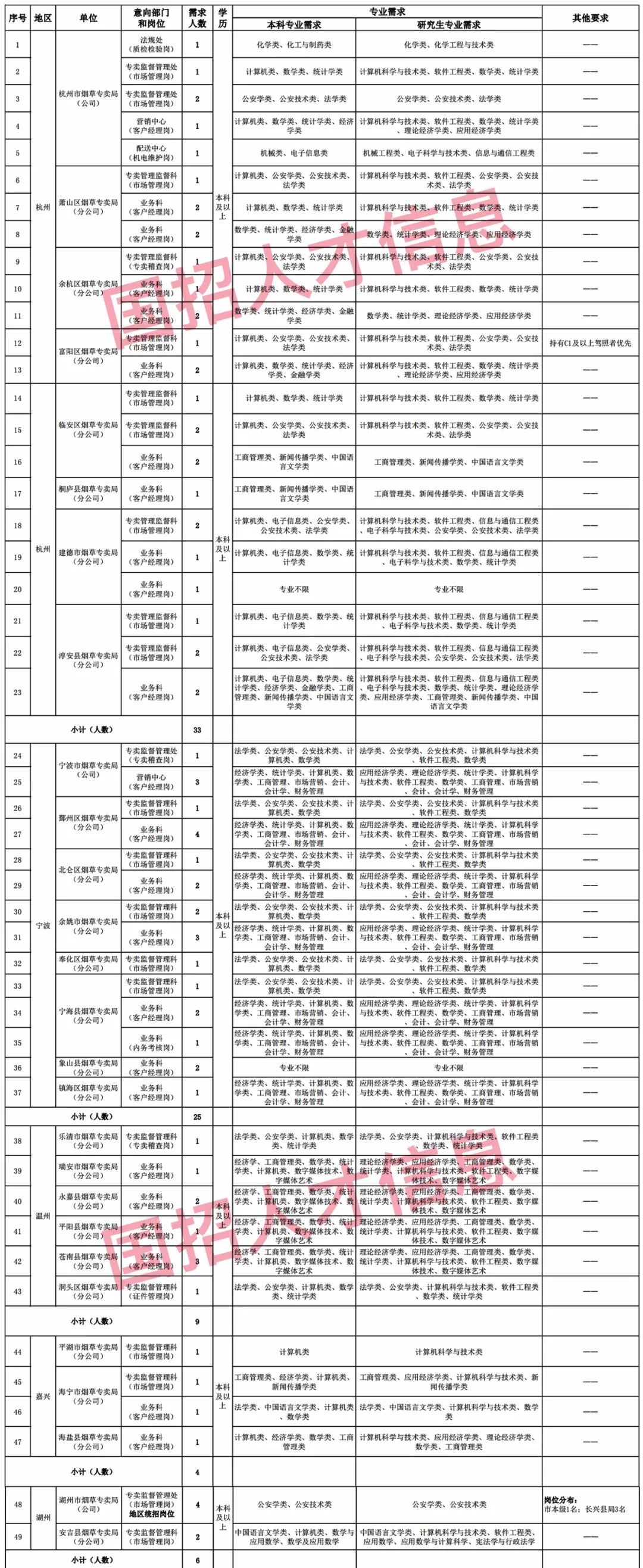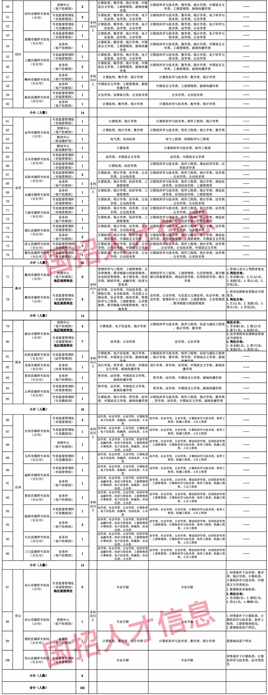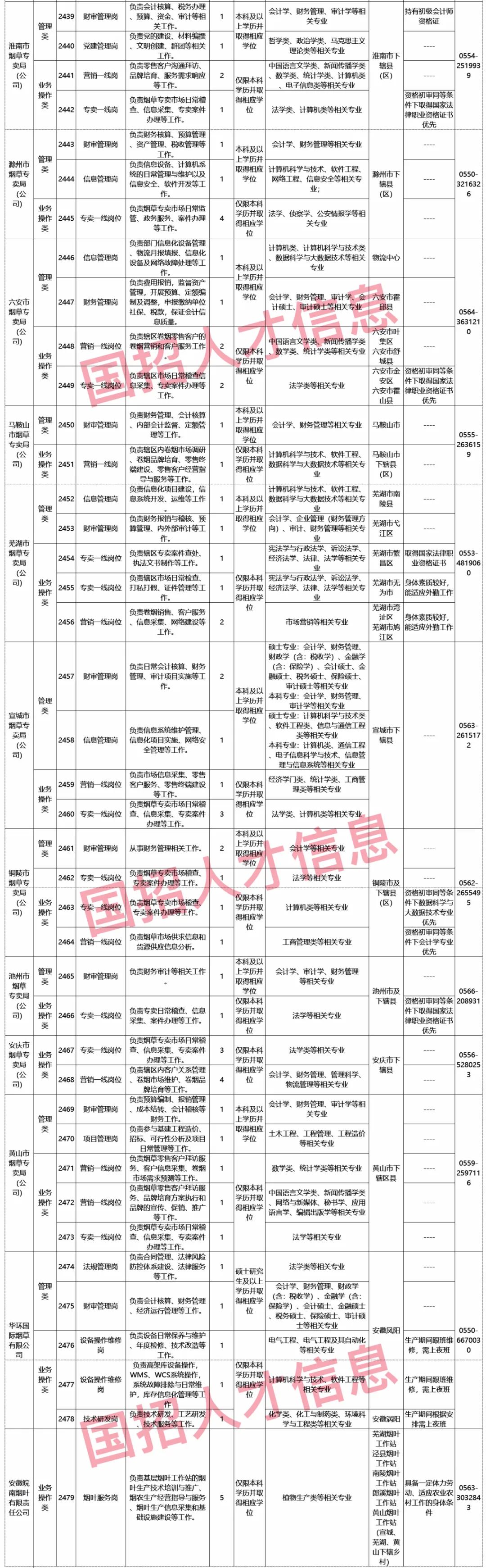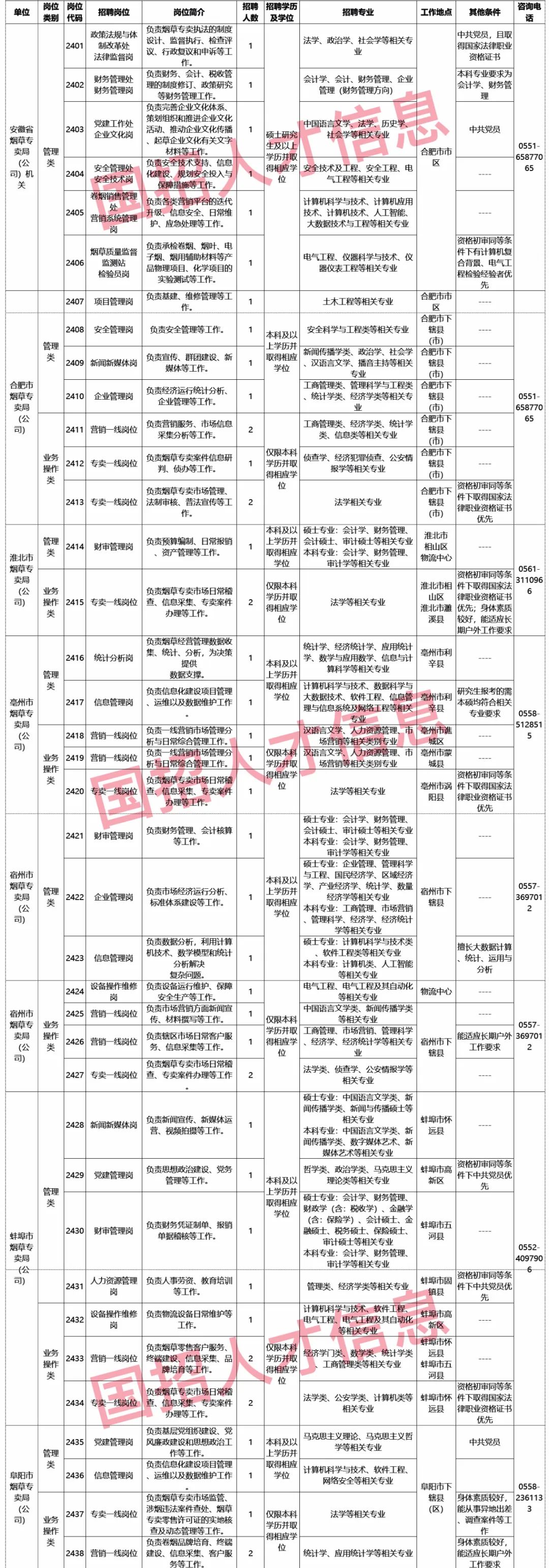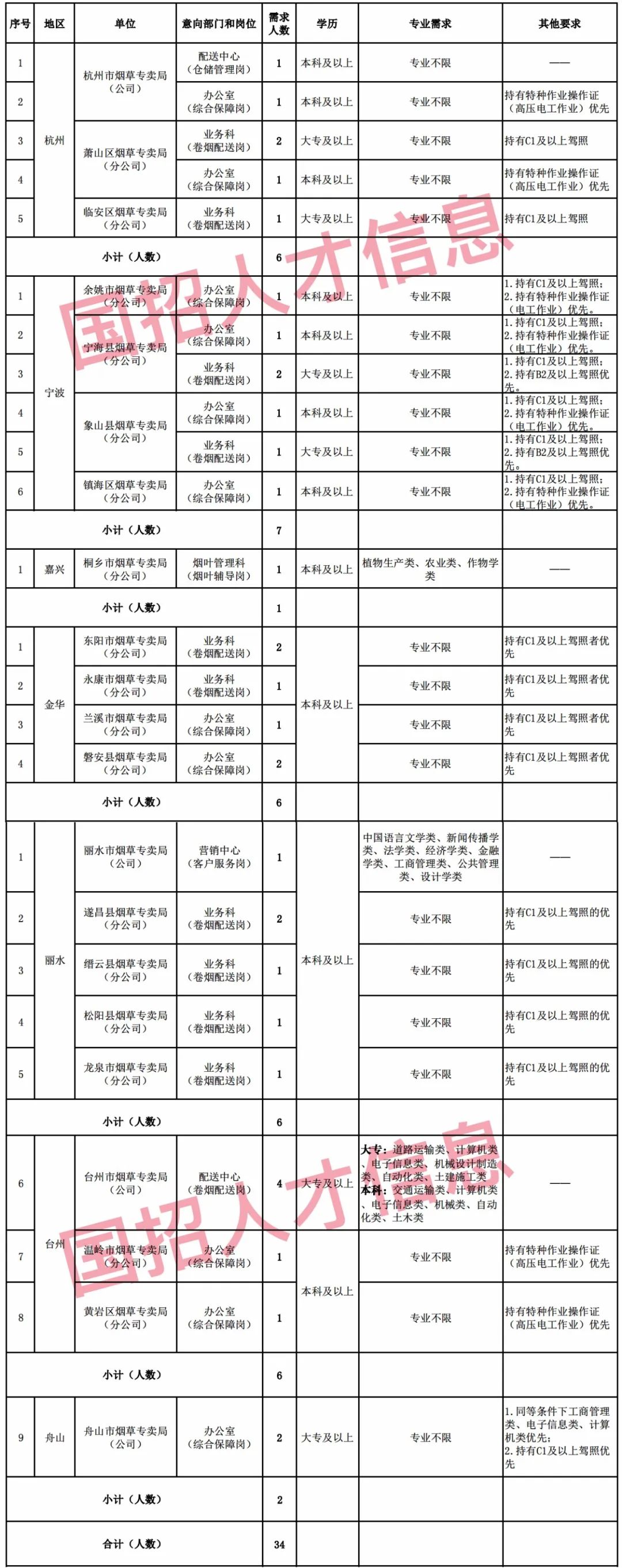 1、162人!浙江省烟草专卖局(公司)2024年业务类岗位招聘公告(6.7) 2、34人!浙江省烟草专卖局(公司)2024年生产操作类岗位招聘公告(6.7) 3、安徽省烟草专卖局(公司)2024年度招聘公告(6.12) 162人!浙江省烟草专卖局(公司) 2024年业务类岗位招聘公告 根据行业发展需要,浙江省烟草专卖局(公司)开展2024年业务类岗位招聘工作。现将有关事项公告如下: 一、招聘岗位 本次共计招聘162人,具体招聘单位、岗位及相关要求,详见《浙江省烟草专卖局(公司)2024年业务类岗位招聘计划表》附件1。 二、招聘对象 (一)2024年全国普通高等院校统分统招应届毕业生、并取得相应的学历、学位证书; (二)国(境)外院校毕业生须提供教育部门出具的学历学位认证材料 (须在2023年8月1日至2024年7月31日期间毕业); (三)按国家有关规定,国家统一招生的普通高校毕业生在择业期(2022届、2023届)内未落实工作单位,其户口、档案、组织关系仍保留在原毕业学校或者保留在各级毕业生就业主管部门(毕业生就业指导服务中心)、各级人才交流服务机构和各级公共就业服务机构的毕业生,可按应届高校毕业生对待(完成教育部门学历学位认证的国(境)外院校毕业生要求同上)。