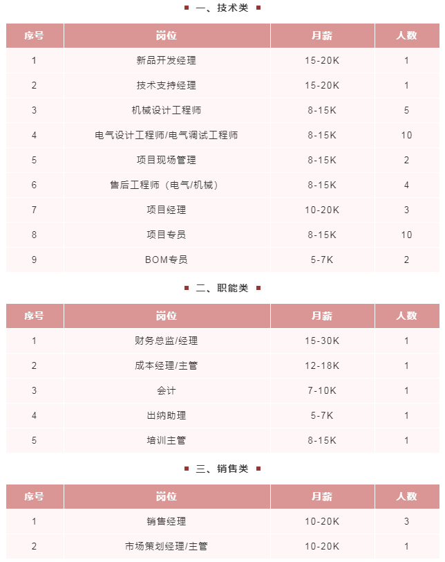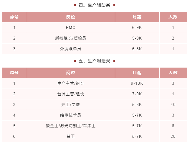 中山市嘉誉塑胶制品有限公司 招聘岗位: 外贸经理 15K-25K、外贸项目负责人 8K-20K、业务项目负责人 6K-12K、项目工程师 10K-15K、工程师助理 4K-6K、QE工程师 9K-15K、产品设计师 6K-12K、生管跟单员 4.5K-5.5K、注塑组长 8K-10K、注塑换模员 6K-7.5K、喷漆操作员 6K-8K、印刷手 7K-8K、普工 5.5K-6.5K 岗位亮点: ★带薪休假:法定节假日、婚假、产假、带薪年假、带薪病假等。 岗位报名方式