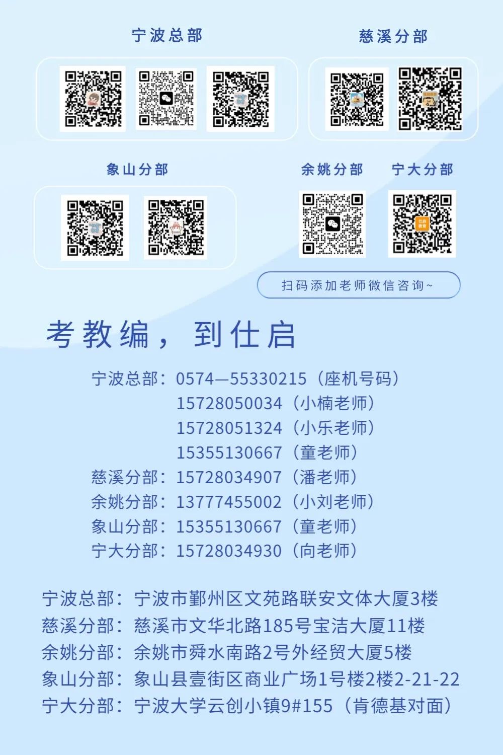 2023年9月-2024年6月 宁波12区(县)教师编制招考公告汇总 宁波市直属 ◆ ◆ ◆ ◆ ◆ ◆ ◆ ◆ ◆ ◆ 鄞州区 ◆ ◆ ◆ ◆ 高新区 ◆ ◆ 前湾新区 ◆ ◆ 江北区 ◆ 江北区教育局2024学年第一批事业编制教师公开招聘公告【23年10月27日,20名】 ◆ ◆ ◆ 海曙区 ◆ ◆ ◆ ◆ 镇海区 ◆ ◆ ◆ ◆ ◆ 北仑区 ◆ ◆ ◆ ◆ ◆ ◆ ◆ 奉化区 ◆ ◆ ◆ ◆ 余姚市 ◆ ◆ ◆ ◆ 慈溪市 ◆ ◆ ◆ ◆ ◆ 象山县 ◆ ◆ ◆ ◆ ◆ 宁海县 ◆ ◆ ◆ ◆ ◆