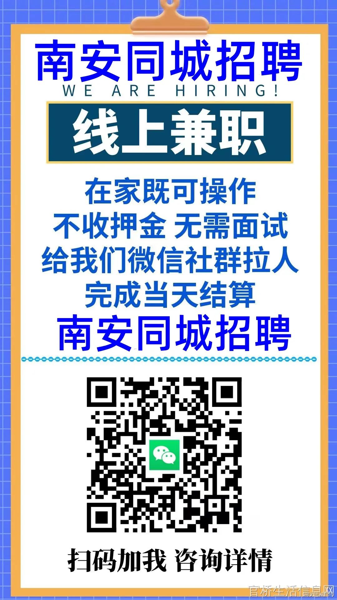 ▼ 【兼职工/临时工】 企业名称:南安同城招聘 工作介绍: 主要工作就是在微信上给我们南安同城招聘的官方企业微信社群拉人,根据群人数结算 拉50人-25元 拉100人-60元 拉150人-100元 拉200-150元 上不封顶 另外拉客服进南安本地群有红包 100-200人 3元 200-300人 4元 300-400人 5元 400-500人 7元 无需面试,不限渠道方法,在家可做,拉完直接结算。 微信号:nanantongcheng1 (南安同城招聘:nanantongcheng1)