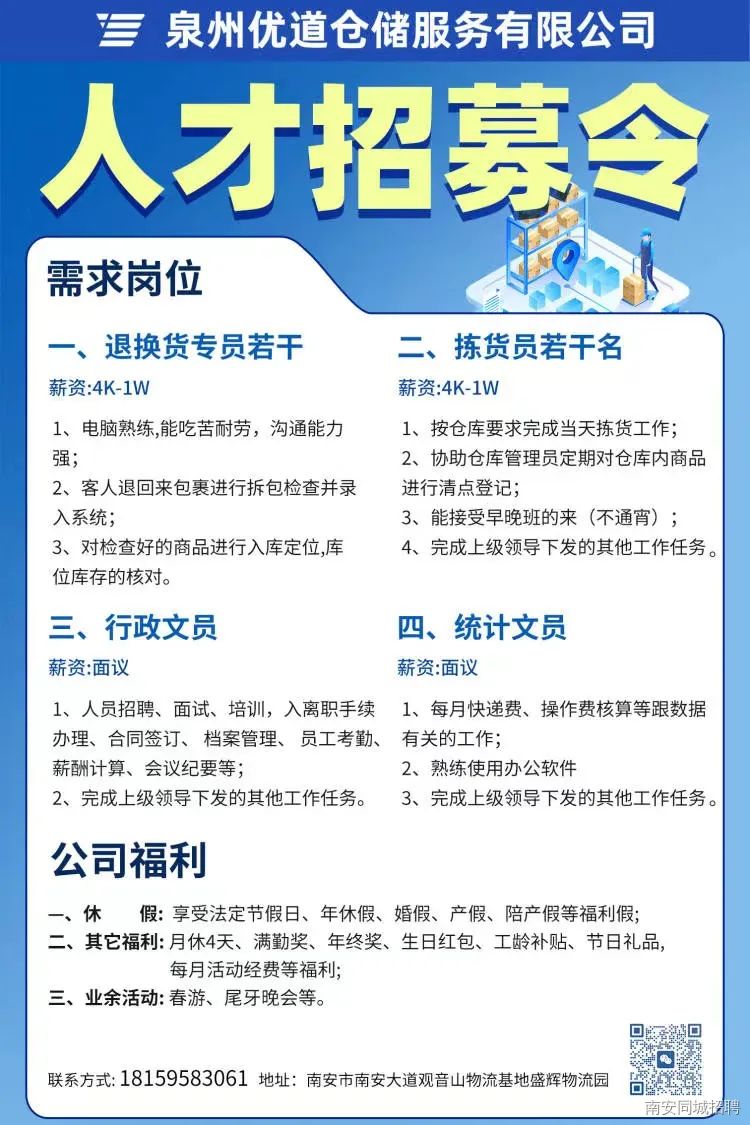 ▼ 【骑手/司机/送货/物流/快递/分拣/装卸】 优道仓储因业务量大,现需招聘以下岗位: 招统计文员1名,薪资范围4-4.5k; 招拣货员,退换货专员等若干人,薪资范围4k-1w左右,有意向者可电联咨询。 联系电话☎ 18159583061(微信同号) 地址:南安大道观音山物流基地盛辉物流园4号楼 (18159583061:18159583061)