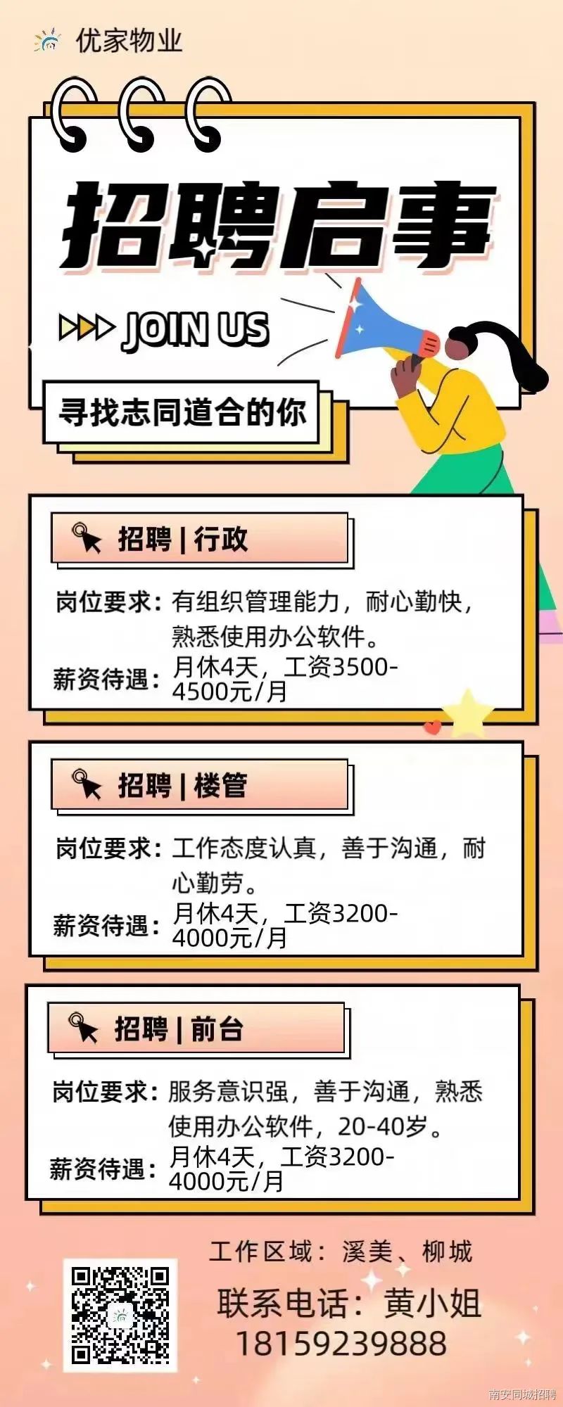 ▼ 【其他招聘】 优家物业招聘: 行政,岗位要求:有组织管理能力,耐心勤快, 熟悉使用办公软件。 薪资待遇:月休4天,工资3500-4500元/月