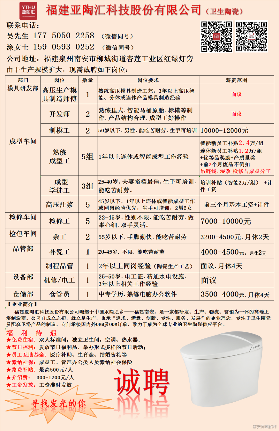 ▼ 【普工/技工】 亚陶汇卫浴 急招 补瓷工1名, 工资4000元8小时月休2天 仓管员1名,工资3500-4000元,8小时月休4天 杂工2名 能吃苦耐劳 3500-4500元,8小时月休2天有加班费 地址:南安市柳城杏莲工业区红绿灯 ☎17750502258(微信同号) (诚聘-吴世敏-17750502258:17750502258)