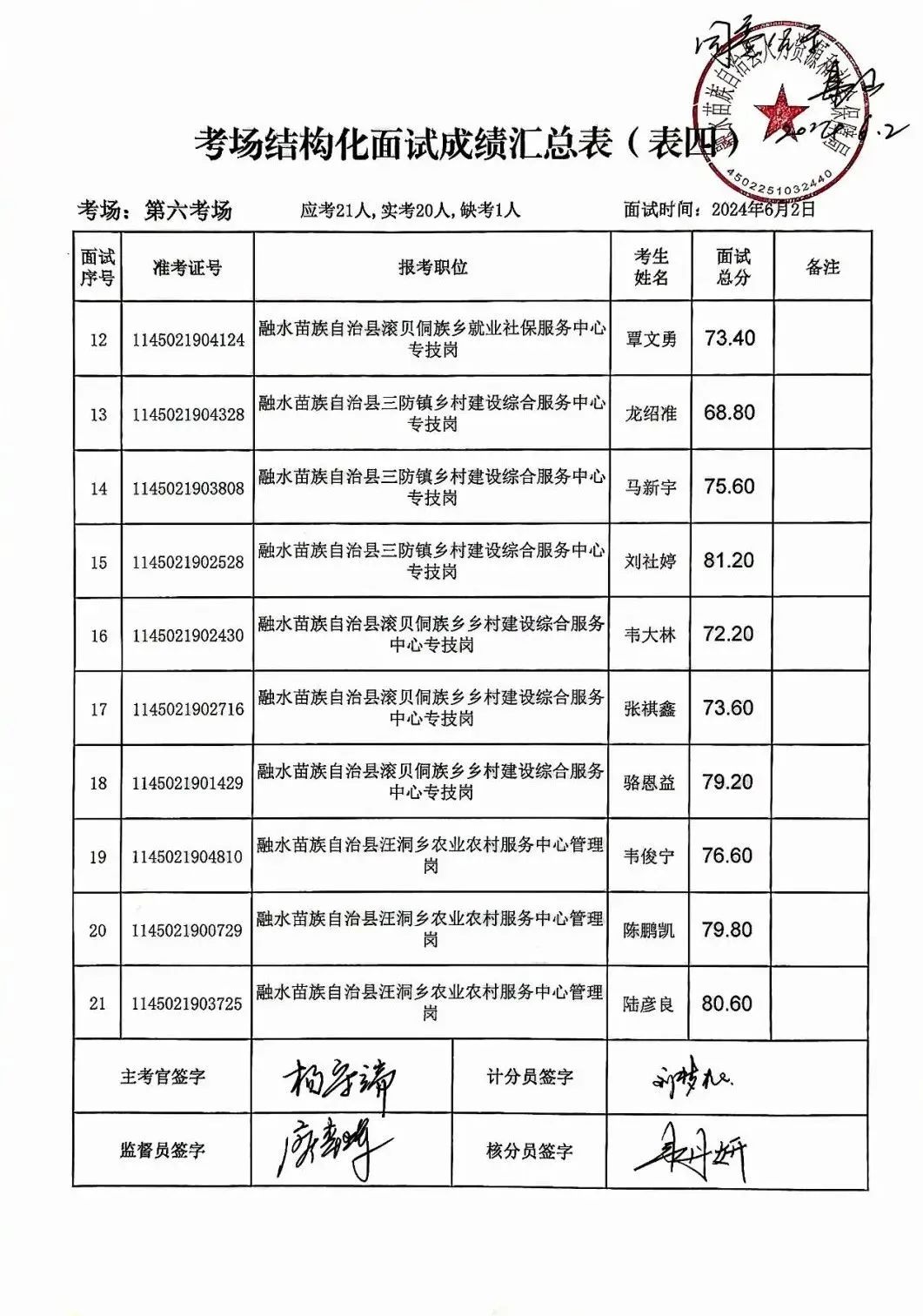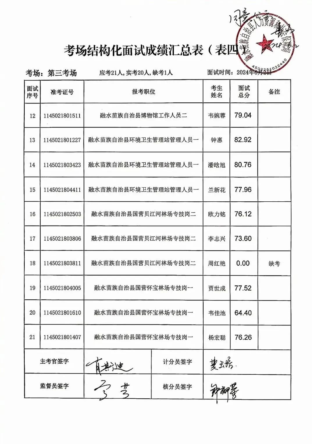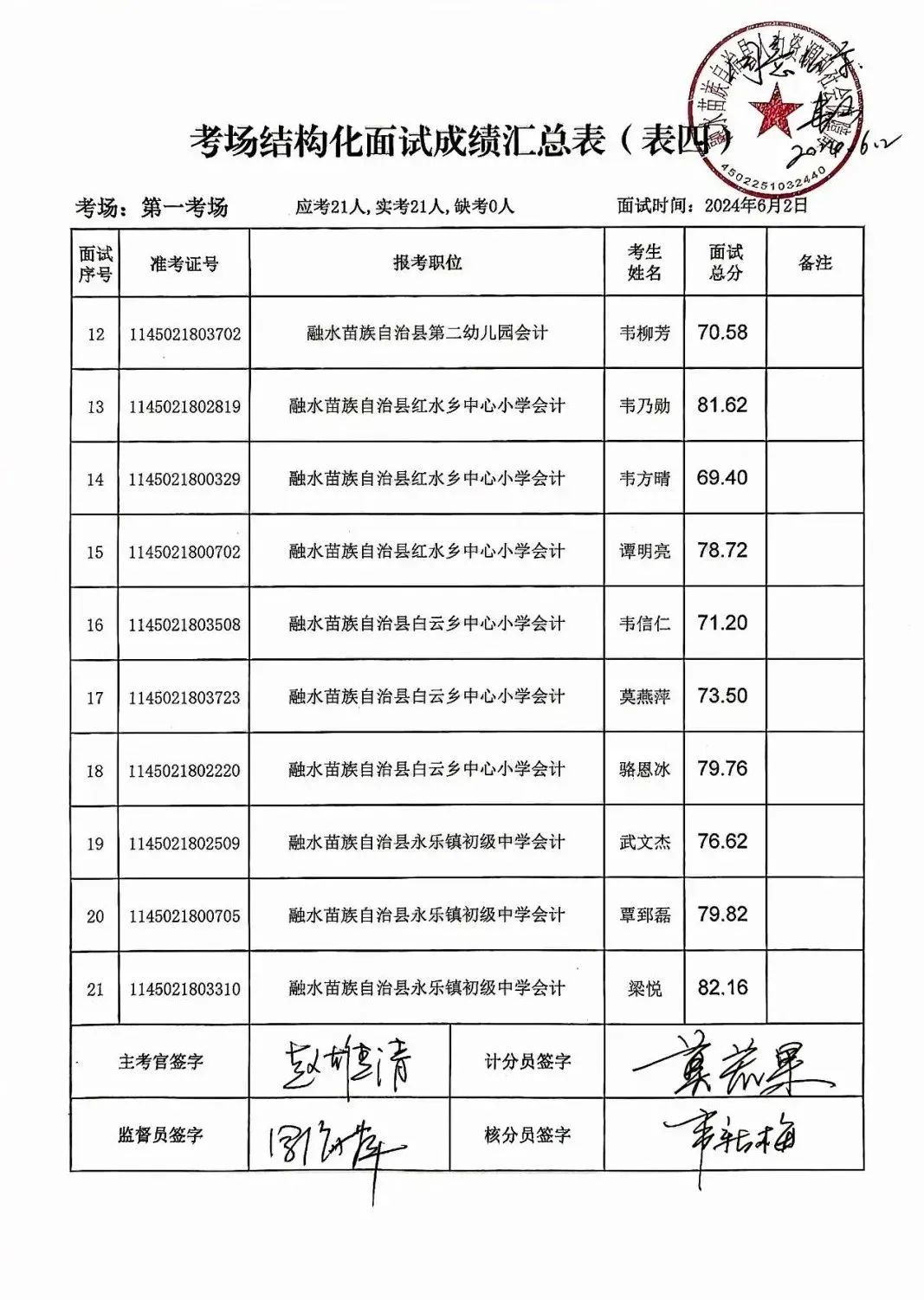 各位考生: 根据《2024年度柳州市事业单位公开考试招聘工作人员公告》和《2024年柳州市融水苗族自治县下属事业单位公开招聘工作人员面试公告》要求,现将融水事业单位公开考试招聘工作人员面试成绩公示如下: 一、融水苗族自治县民族小学师范校区考点:全县事业单位岗位,共设置9个考场。结构化面试,面试成绩满分100分, 60分为合格(成绩计算四舍五入,保留到小数点后两位)其中,因面试入闱人数不足或考生缺考等原因,面试时达不到1:3开考比例的,该岗位考生成绩须达到70分以上(含70分)。该岗位考生面试成绩公示如下: