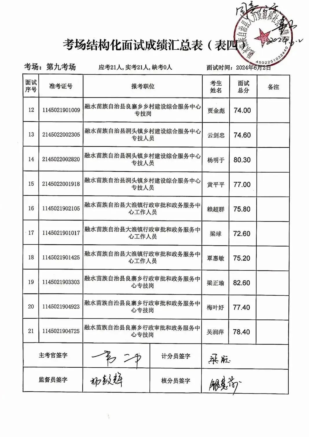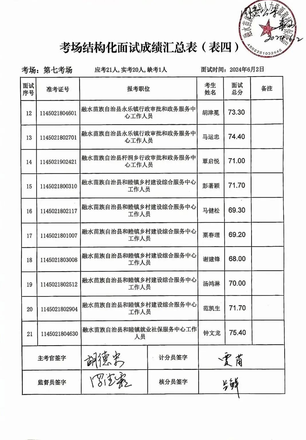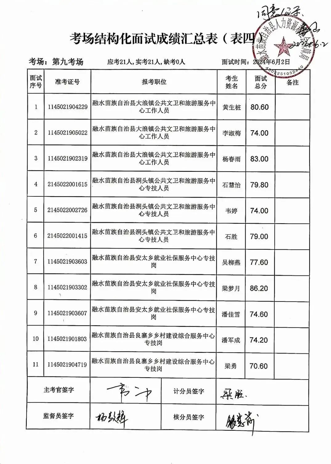 各位考生: 根据《2024年度柳州市事业单位公开考试招聘工作人员公告》和《2024年柳州市融水苗族自治县下属事业单位公开招聘工作人员面试公告》要求,现将融水事业单位公开考试招聘工作人员面试成绩公示如下: 一、融水苗族自治县民族小学师范校区考点:全县事业单位岗位,共设置9个考场。结构化面试,面试成绩满分100分, 60分为合格(成绩计算四舍五入,保留到小数点后两位)其中,因面试入闱人数不足或考生缺考等原因,面试时达不到1:3开考比例的,该岗位考生成绩须达到70分以上(含70分)。该岗位考生面试成绩公示如下: