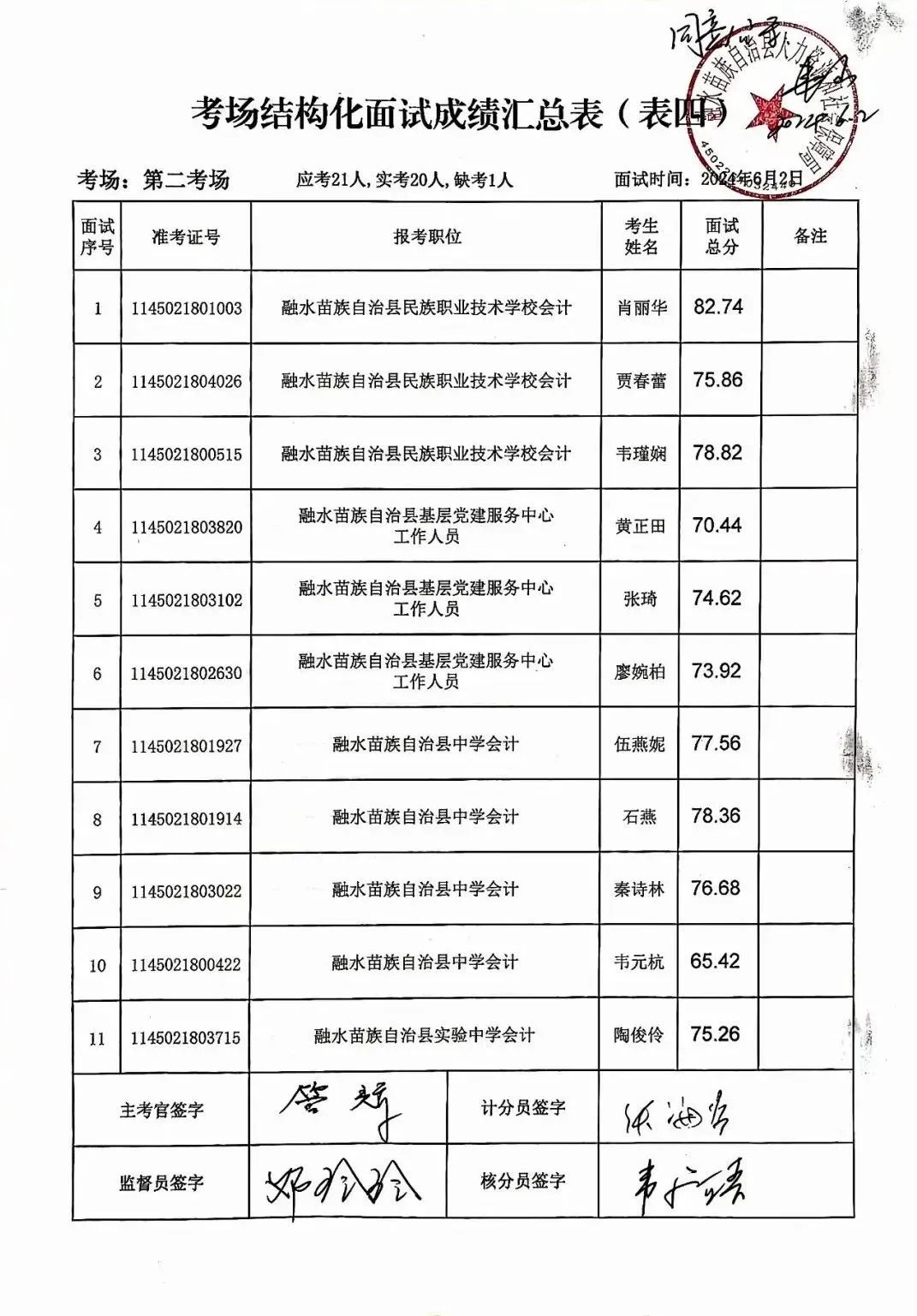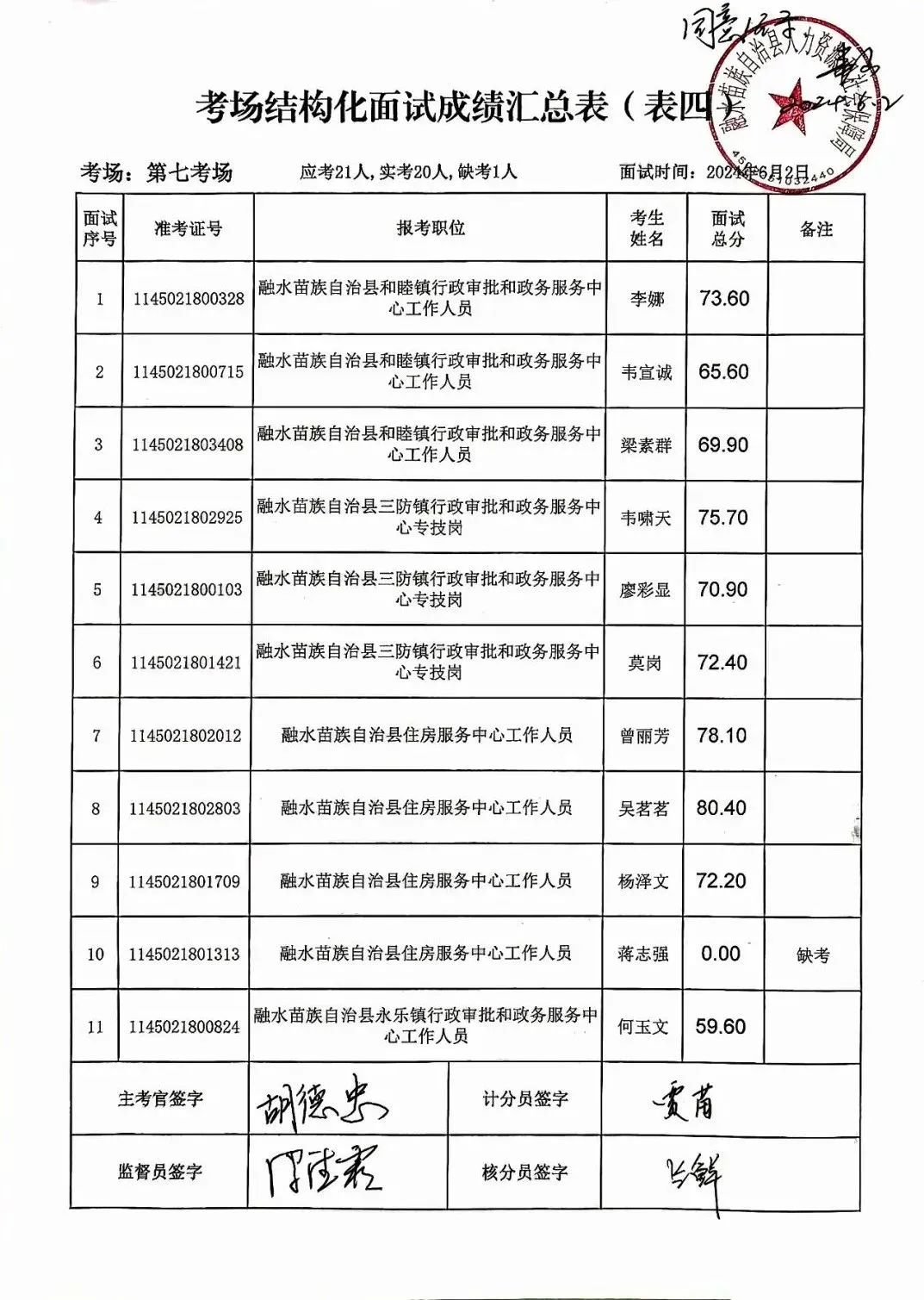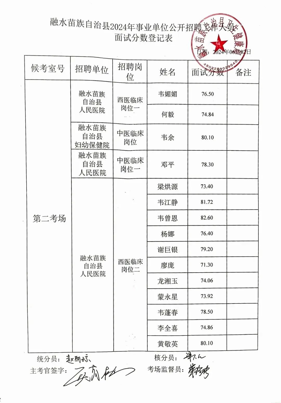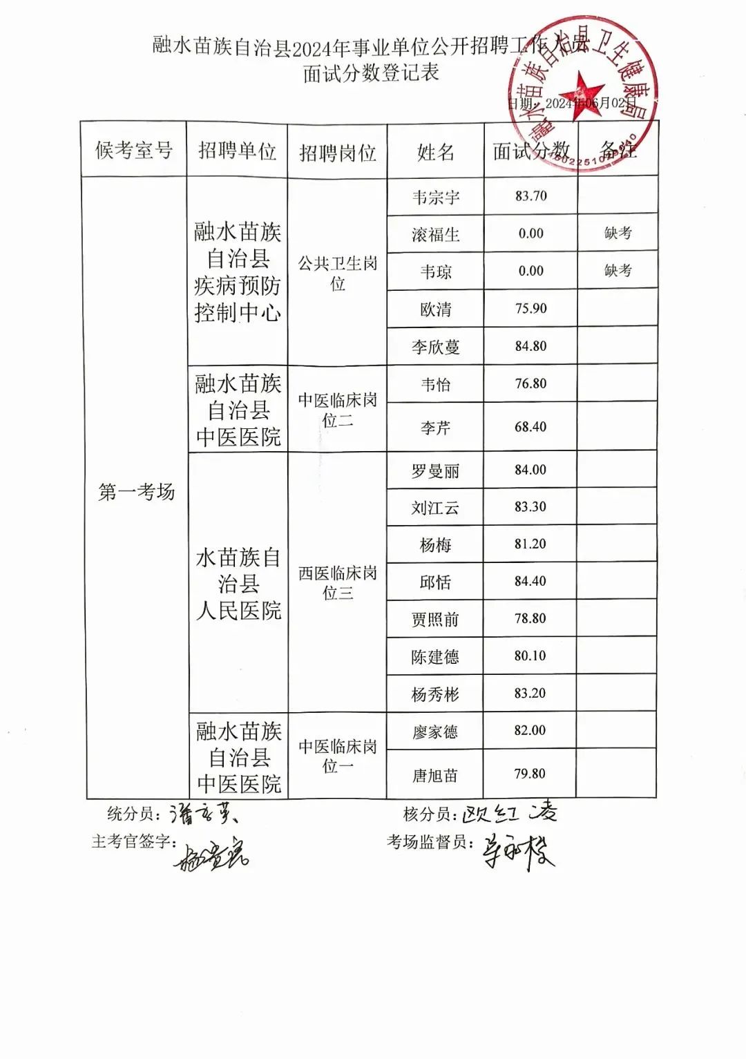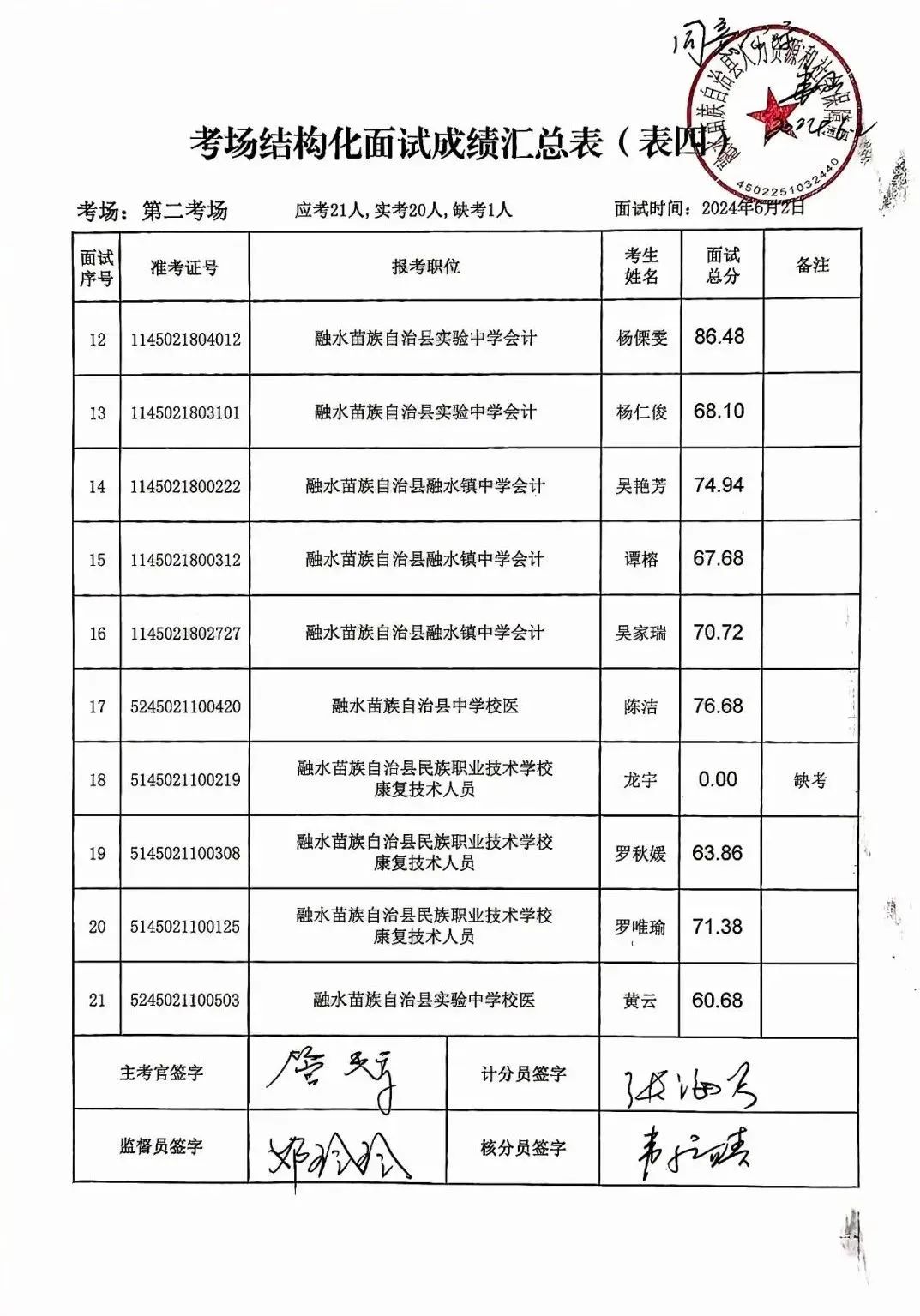 二、广西融水民族卫生学校考点:融水卫健系统岗位,共设置2个考场。专业结构化面试,面试成绩满分100分, 60分为合格(成绩计算四舍五入,保留到小数点后两位)其中,因面试入闱人数不足或考生缺考等原因,面试时达不到1:3开考比例的,该岗位考生成绩须达到70分以上(含70分)。该岗位考生面试成绩公示如下: