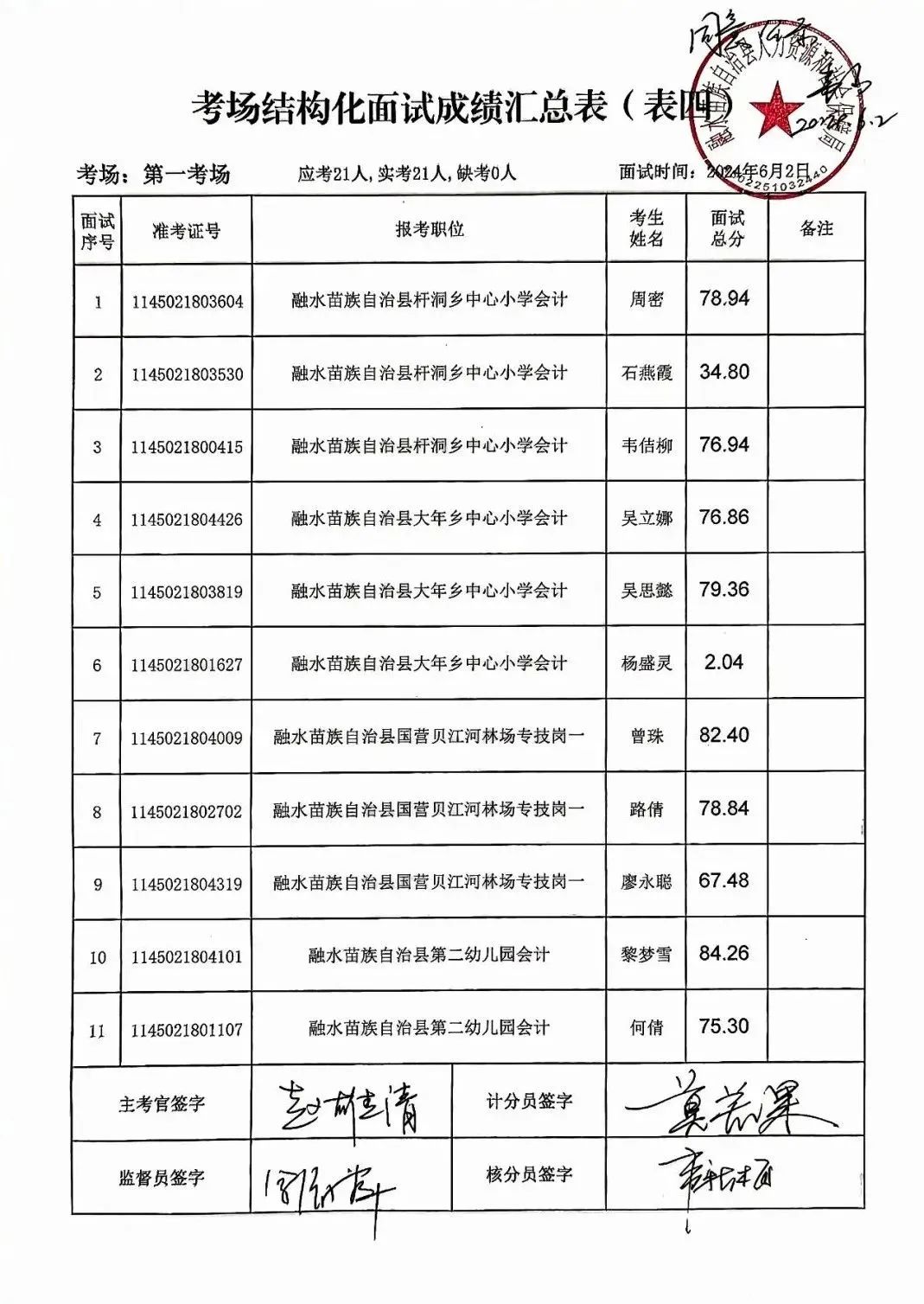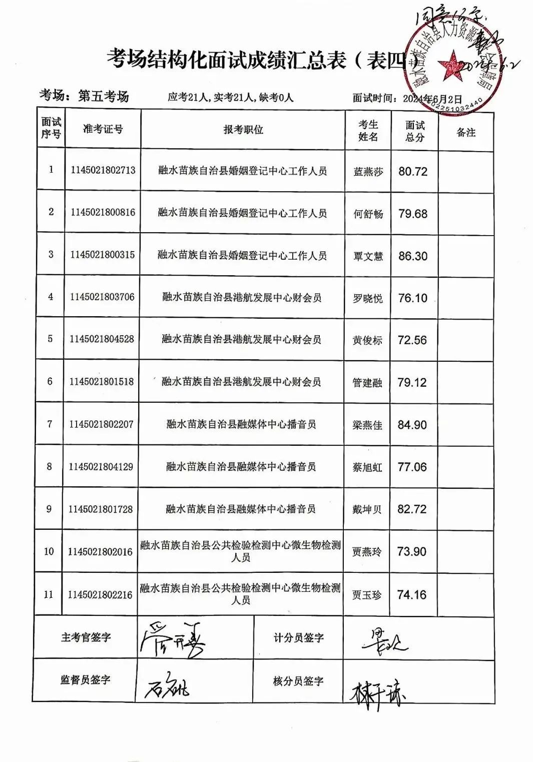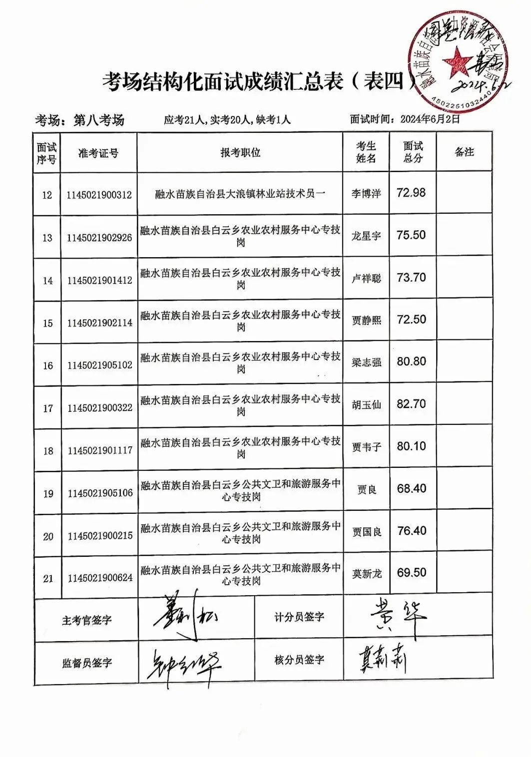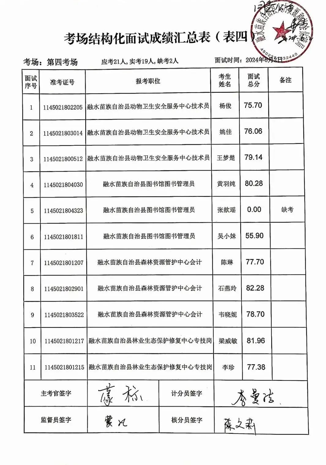 2024年度融水事业单位公开考试招聘工作人员面试成绩公示