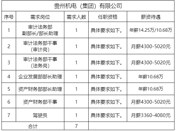 (一)招聘岗位:审计法务部副部长/部长助理 招聘人数:1人 岗位描述: 1. 协助机电集团领导正确执行国家法律法规,对公司的重大经营决策进行法律论证,出具法律意见。 2. 参与机电集团及下属子公司的兼并、收购、资产转让及招投标等重要经济活动,出具法律意见,处理相关法律事务; 3. 对机电集团运营中的各种潜在法律风险进行梳理、识别,并提出规避、化解方案; 4. 组织拟订、修订集团法律事务管理制度;制定或审核集团内部各项规章制度;对公司的经营管理、重大项目及合同进行审查与法律监督,并提供法律咨询;处理公司对外法律诉讼及仲裁事务等. 5. 制定集团公司审计制度及各项审计计划,审核会计资料及其他经济资料的真实性合法性和合理性。 6. 领导交办的其他工作。 任职资格: 1. 大学本科及以上学历,法律、法学相关专业; 2. 身体健康,能吃苦耐劳,服从工作安排,沟通能力强,爱岗敬业,具有团队协作精神; 3. 五年以上相关工作经验者优先,具备较强的责任心; 4. 家住贵阳,花溪、小河优先。 【注:此岗位为我公司中层管理岗,请应聘人员投递时仔细阅读岗位描述及任职资格,谢谢。】 待遇: 1. 薪资:副部长年薪14.25万(含五险一金)/部长助理年薪10.68万(含五险一金);试用期6个月; 2. 包中餐; 3. 周末双休,入职即缴纳五险一金。 (二)招聘岗位:审计法务部干事(审计岗) 招聘人数:1人 岗位描述: 1. 实施对集团及所属子公司的内部审计,按照审计业务流程和标准完成所分配的具体任务,揭示审计发现问题并提出审计建议。 2. 对所负责联系的子公司实施日常监督,及时收集整理经营管理信息,开展风险评估。 3. 利用会计、财务、管理等方面的知识,掌握相关的工作流程和规范,运用审计软件和技巧,从事公司、机构或组织的内部审计、外部审计、风险评估、资产评估等工作以确保其经营活动的合规性、准确性和可靠性。 4. 领导交办的其他工作。 任职资格: 1. 大学本科及以上学历,审计相关专业; 2. 身体健康,能吃苦耐劳,服从工作安排,沟通能力强,爱岗敬业,具有团队协作精神; 3. 两年以上相关工作经验者优先,具备较强的责任心; 4. 家住贵阳,花溪、小河优先。 待遇: 1. 薪资:月薪4300~5020(含五险一金);试用期三个月,薪资4300,转正后薪资5020; 2. 包中餐; 3. 周末双休,入职即缴纳五险一金。 (三)招聘岗位:审计法务部干事(法务岗) 招聘人数:1人 岗位描述: 1.根据公司当前情况,建立适合公司发展的法务工作流程; 2.负责为公司提供法律服务及咨询,为公司起草部分合同协议; 3.了解公司合同管理情况,优化合同审批和履行流程,审核合同; 4.监督公司重要合同洽谈及招投标等工作,提出相应法律意见,在过程中利用法律手段维护公司权益; 5.负责为公司重大项目提供法律支持,起草部分协议,; 6.负责处理公司内法律纠纷、法律问题,提出法律意见; 7.完成领导交办的其他工作。 任职资格: 1. 大学本科及以上学历,法学相关专业; 2. 身体健康,能吃苦耐劳,服从工作安排,沟通能力强,爱岗敬业. 具有团队协作精神; 3. 两年以上相关工作经验者优先,具备较强的责任心; 4. 家住贵阳,花溪、小河优先。 待遇: 1. 薪资月薪4300~5020(含五险一金);试用期三个月,薪资4300,转正后薪资5020; 2. 包中餐; 3. 周末双休,入职即缴纳五险一金。 (四)招聘岗位:企业发展部部长助理 招聘人数:1人 岗位描述: 1.参与集团战略发展规划的制订; 2.及时搜集行业相关的国家政策、行业相关项目扶持资金等信息,并根据企业实际情况编制可行性报告; 3.组织开展项目申报、专项资金申报等工作的实施及后续跟踪等工作,并根据实际情况做动态调整; 4. 根据企业的发展和实际运转情况,组织调研子公司各项管理工作的开展情况,编写调研报告。提出改进措施及实施方案,并在公司决策层的指导下,实施改进方案。 5. 完成领导交办的其他工作。 任职资格: 1、大学本科及以上学历,硕士研究生学历优先考虑,企业管理、经济学等相关专业; 2、身体健康,能吃苦耐劳,服从工作安排,沟通能力强,爱岗敬业、具有团队协作精神; 3、具备较强的责任心及优秀的沟通协调能力; 4、三年以上相关工作经验者优先;家住小河、花溪优先; 【注:此岗位为我公司中层管理岗,请应聘人员投递时仔细阅读岗位描述及任职资格,谢谢。】 待遇: 1、薪资:年薪10.68万(含五险一金),试用期6个月; 2、包中餐; 3、周末双休,入职即缴纳五险一金。 (五)招聘岗位:资产财务部部长助理 招聘人数:1人 岗位描述: 1.按照机电集团战略目标,落实、调整、完善配套财务计划,参与集团经济合同和重大经济事项的论证和审查,在企业发展部配合下负责机电集团投融资工作; 2.统筹开展机电集团资金请款、调配、拨付,监督机电集团大额资金支出,指导归口部门开展资金调配工作; 3.制定资产、财务等相关管理制度,不断更新及完善制度体系; 4.组织制订并实施机电集团年度融资计划,参与项目前期可行性研究报告财务审查工作,按照机电集团战略发展规划和项目投资情况测算资金需求,拟定并实施对应融资方案; 5.组织落实机电集团年度财务预算、决算工作; 6.根据国家税收、财务政策,梳理机电集团及下属公司享有财税优惠政策,落实机电集团税务筹划工作,监督指导下属公司税务筹划工作; 7.负责编制和实施机电集团本部担保计划及方案、保后跟踪管理,落实在保事项风险预警并制