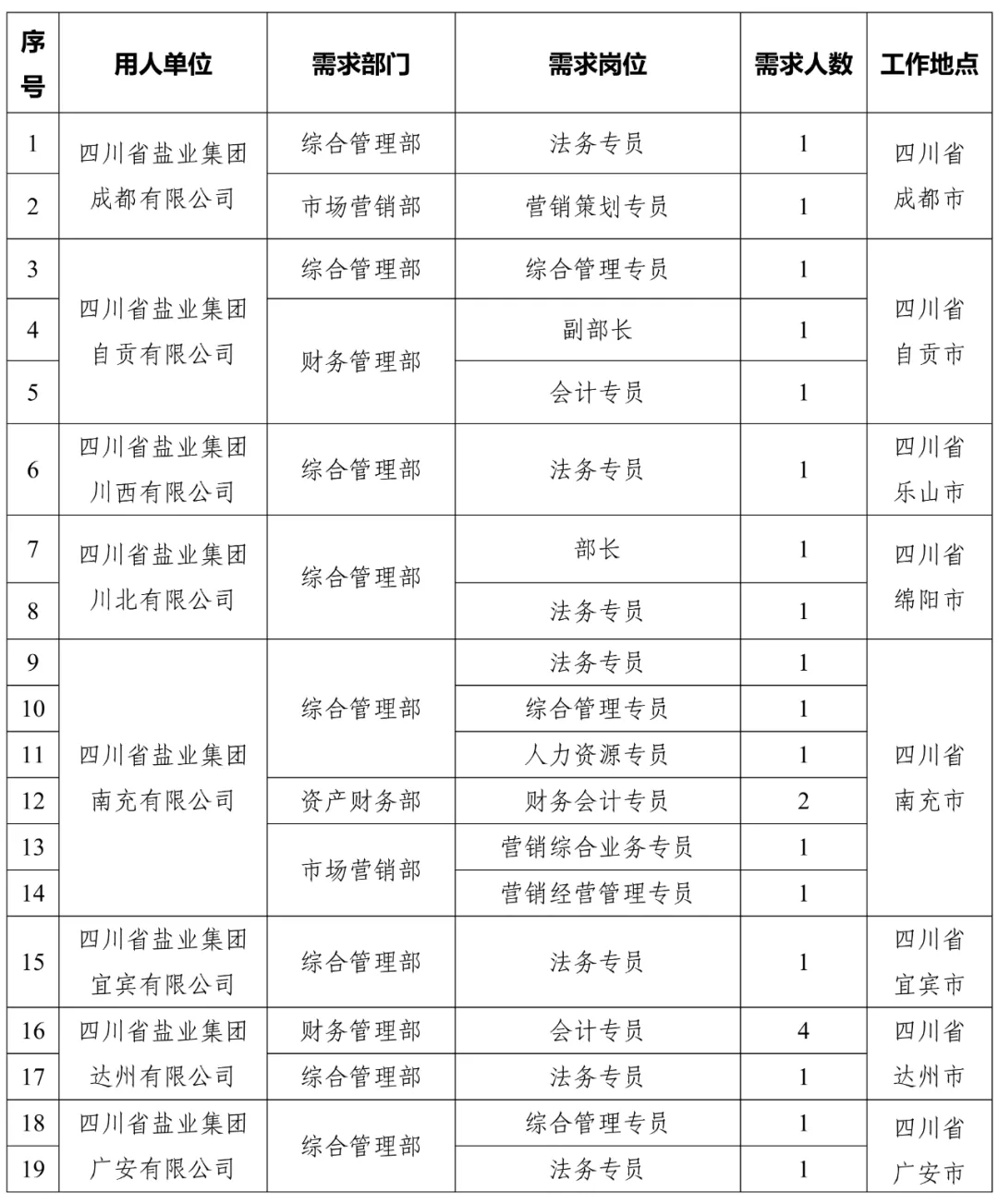 点 ☀川才观察,汇集川内国企、教师招聘信息,想要快速招到大量合适人才,获取新鲜招聘信息,找到好工作,请关注!请关注!【每天晚上18:30-19:30发布】 温馨提示:感谢您关注川才观察!因网络诈骗现象较多,花样百出,请提高警惕,谨防上当受骗!前往应聘面试或去某一地工作时,最好跟亲朋友好友告知一声去向,祝大家顺利找到好工作! 发布招聘信息【点击➯联系小编发布招聘信息】 四川省盐业集团有限责任公司 公开招聘公告 四川省盐业集团有限责任公司是四川省属大型国有企业,是集盐的生产、研发、批发、零售和物流配送为一体的产供销联合的省属国有企业,是国家食盐定点生产和定点批发企业,AAA级信用企业,公司下辖19家全资和参控股企业。为进一步充实力量,优化人才队伍结构,为公司高质量发展提供坚强的人才保障,拟面向社会公开招聘。现将招聘有关事项公告如下: ![]() 一、招聘岗位、人数、工作地点 本次拟招聘23名二级子企业员工,具体如下: ![]() ![]() 二、岗位基本条件、职责和任职条件 1.具有较高的政治素质,对党忠诚,拥护中国共产党的领导,坚持中国特色社会主义道路,讲政治,顾大局,遵纪守法,品行端正,有良好的职业素养和职业操守,勤奋敬业,敢于担当,有强烈的事业心和责任感。 2.具有团队意识,工作严谨细致,有吃苦耐劳精神,具备良好的语言表达和沟通协调能力,服从组织安排。 3.遵守廉洁从业有关规定、勤勉尽责、公道正派、注重自身作风形象并能维护公司形象、利益,严格保守商业秘密和工作秘密。 4.身体健康,具有良好的心理素质和能够正常履职的身体素质。 5.无刑事处罚等不良记录。 1.毕业于“985”、“211”或“双一流”高校的全日制硕士研究生; 2.博士研究生; 1.曾受过司法机关刑事处罚的; 2.涉嫌违法、违纪违规正在接受调查、审查的; 3.曾被开除党籍、开除公职、被辞退开除的; 4.法律法规、党纪政纪和有关政策另有规定不能被聘任为国有企业工作人员的; 5.被依法列入失信联合惩戒对象的; 6.有其它违反国家法律、法规行为的。 ![]() 三、招聘程序 ![]() 四、报名事宜 1.报名方式 根据招聘岗位要求与应聘者报考信息的匹配情况,择优确定笔试人员名单。 本次公开招聘考试包括笔试和面试,由四川省盐业集团有限责任公司统一组织,不指定考试范围,具体时间和地点另行通知。笔试后,以笔试成绩由高分到低分排序,按岗位计划招聘人数与进入面试人数不高于1:5的比例确定进入面试人选。 面试考核后,以笔试、面试的综合成绩排序,确定进入下一个环节人员。 ![]() 五、薪酬待遇 ![]() 六、应聘须知 2.本次公开招聘将短信通知进入各环节人员。报名时,应聘者应按要求填写联系电话,并保持通讯畅通。如因通讯不畅或本人其他原因不能按时参加考核的,视为自动放弃。凡未进入下一环节的人员,均不再另行通知。 3.根据报名情况,可对招聘计划进行适当调整。应聘者被录用后,按照“人岗相适”原则,服从组织安排。 4.本次招聘工作严格按照干部人事工作有关规定进行。川盐集团纪委全程监督,如发现违反干部人事纪律的现象,可向川盐集团纪委举报,举报电话:028-86785192。 5.公告未尽事宜,请与公司人力资源部联系。咨询电话:028-86782852。