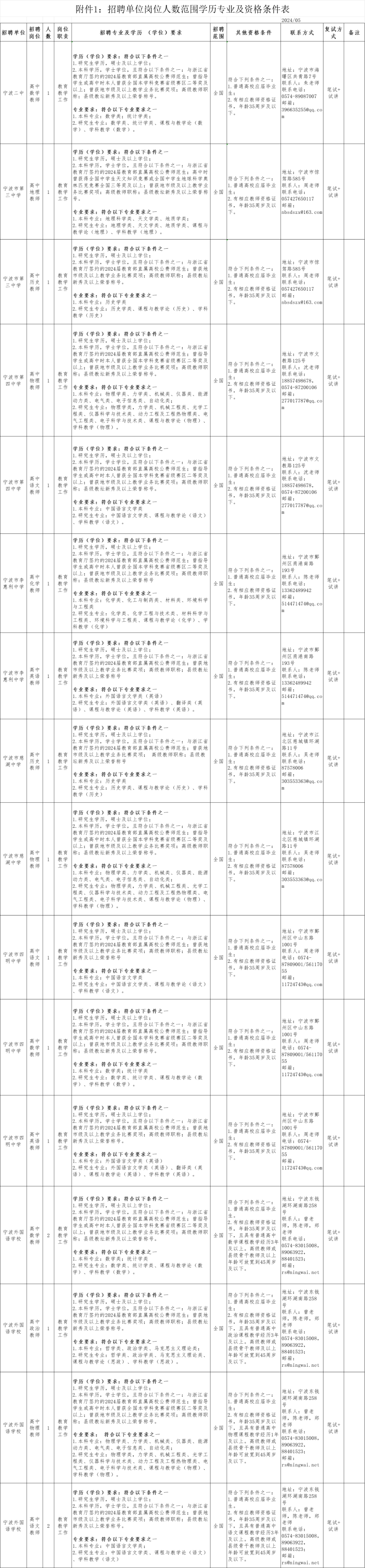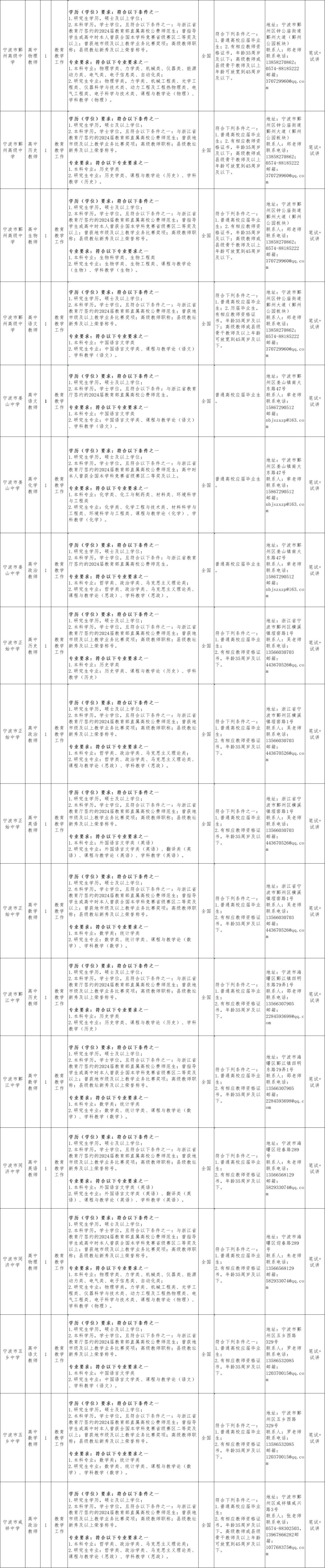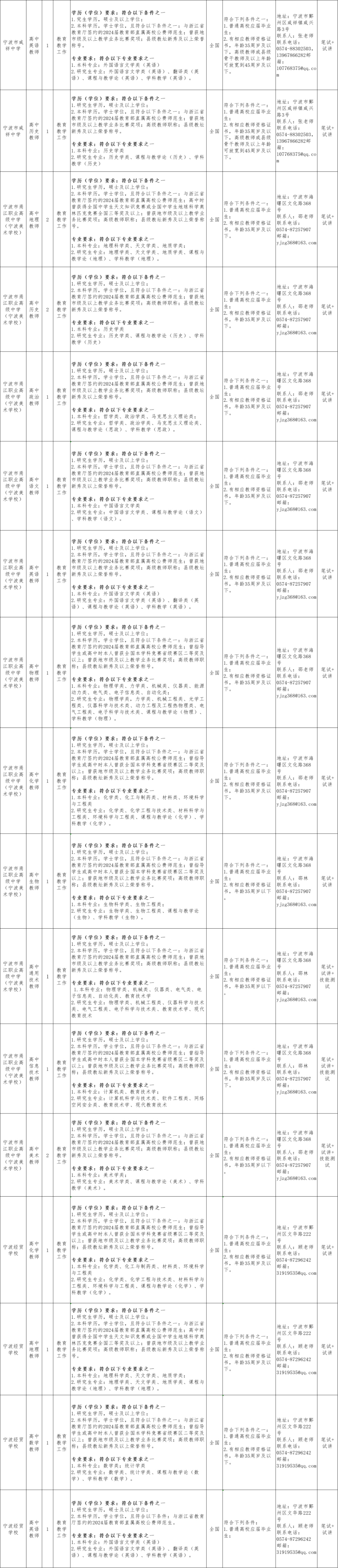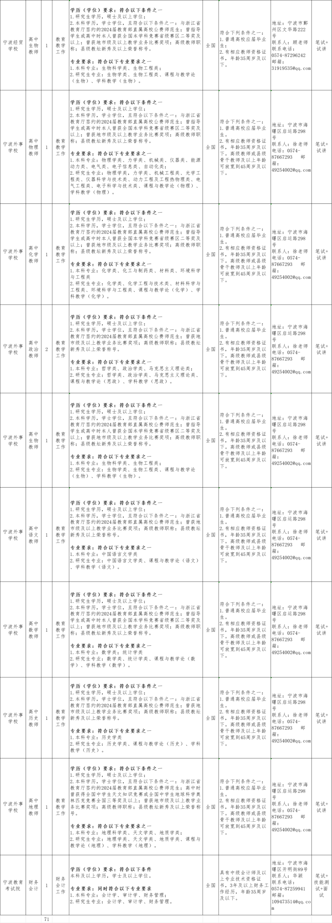 根据《宁波市事业单位公开招聘工作人员实施办法》和宁波市教育局《关于宁波市教育系统事业单位公开招聘工作人员的实施意见》的有关规定,宁波市教育局直属17所学校和1个单位决定面向全国公开招聘事业编制教师和工作人员共71名。现就有关事项公告如下: 一、招聘单位简介 此次拟公开招聘事业单位工作人员的单位为宁波市教育局直属事业单位,分类类别均为公益类,经费预算形式为全额拨款。 二、招聘原则和办法 招聘工作坚持公开、平等、竞争、择优原则,按照德才兼备的用人标准,采取公开报名、统一考试和择优聘用的办法进行,通过初试、复试、体检和考察等程序面向社会公开招聘事业编制教师。 三、招聘对象和条件 1. 遵守中华人民共和国宪法、法律和法规; 2. 遵守纪律、品行端正,具备良好的职业素质; 3. 具有招聘岗位所需的学历、学位、资历、专业、任职资格、职业(执业)资格及技能要求; 4. 具有适应岗位要求的身体条件; 5.教师资格证书要求:应届毕业生应聘教师岗位的,须在聘用一年内取得相应教师资格证书。(具体可见附件1) 6. 具备岗位所需的其他条件。 7. 浙江省山区26县和海岛县及宁波大市范围内尚在合同期内的教师需要提供所在学校同意报考证明。 四、招聘岗位 招聘岗位及具体条件详见附件1。 五、招聘办法和步骤 (一)报名与资格审查 1.网上报名:报名时间自公告发布之日至2024年6月19日。 (1)应聘人员通过宁波市教育考试院网站报名(报名页面链接http://nbeea.nbedu.net.cn/school/NeiRead.aspx?id=1973)。每位应聘人员限报一个岗位。 2.现场确认和报名 (1)现场确认和报名时间:6月21日(周五)下午13:00-16:00。 (2)现场确认和报名地点:各招聘学校(详见附件1)。 (3)现场确认和报名要求:应聘人员须携带报名材料到指定地点进行现场审核确认,招聘单位审查应聘人员的报考资格,应聘人员证件不全或证件与报考资格条件不相符的,向审查未通过者说明理由。有弄虚作假的,一经查实,将取消报考资格。 (4)所需材料:报名表1份(公告附件2,可下载后填写)、近期免冠1寸照片1张(贴报名表)、身份证、学历学位证书(研究生须同时准备本科学历学位证书),和报考岗位资格条件相关的其它所有资料:2024年应届毕业生需提供学生证和学校就业推荐表(属于2024年1月1日至2024年12月31日毕业的国(境)外留学人员可凭国(境)外学校学籍证明等)等;各招聘岗位要求的其他相关证书、证明原件和复印件等。 (5)应聘人数与招聘计划数之比不能低于3:1,在规定的报名时间内,符合报考条件的应聘人数和招聘计划数比例不足3:1的,将取消该岗位招聘,或按比例相应核减该岗位招聘人数。 (二)考试 应聘教师岗位的分初试和复试两个环节。当同一岗位的应聘人数与招聘计划数之比大于6:1时增加初试环节,当同一岗位的应聘人数与招聘计划数之比小于等于6:1时直接进入复试。 考试时间、地点由各招聘学校通知。应聘人员凭身份证,按照规定的时间和地点参加各环节考试,应聘人员未在规定的时间和地点参加考试的,视作放弃。 1.初试 初试采取面试方式,主要考察应聘人员的问题分析能力、语言表达能力、举止仪表等综合素养。总分100分,合格分60分。 初试后,根据初试成绩从高分到低分,按应聘人数与招聘计划数之比6:1的比例确定进入复试环节人员,不足比例的按实际人数确定,如有人员放弃,不予递补。初试成绩和进入复试环节人员名单、复试时间地点将在宁波市教育考试网公布。 2.复试 复试环节包括笔试、试讲、技能测试等形式,各招聘岗位复试的具体形式详见附件1 。 笔试内容为招聘岗位所必须具备的相关专业知识、教材教法、教学设计及综合公共知识等。笔试卷面总分为100分,合格分为60分。笔试后,教师岗位根据笔试成绩从高分到低分按1:3的比例确定试讲对象,财务会计岗位根据笔试成绩的40%和技能测试成绩的30%之和从高分到低分按1:3确定面试对象,不足比例的按实际人数进入,如有人员放弃,不予递补。 试讲为模拟课堂教学,主要考察应聘人员的课堂教学能力、专业知识等,技能测试主要考察实践操作技能。试讲、技能测试、面试每项总分为100分,试讲不足70分者、技能测试或面试不足60分者不列入体检、考察对象。 3.总成绩 总成绩采用复试成绩,采取笔试+试讲的岗位,总成绩为笔试成绩的40%和试讲成绩的60%之和,采取笔试+试讲+技能测试的岗位,总成绩为笔试成绩×40%+(试讲成绩×60%+技能测试成绩×40%)×60%。财务会计岗位的总成绩为笔试成绩×40%+技能测试成绩×30%+面试成绩×30%。 总成绩满分100分,按总成绩从高分到低分1:1的比例确定体检、考察对象,教师岗位不足70分者、财务会计岗位不足60分者不列入体检、考察对象。总成绩如有相同,按笔试成绩排序,笔试成绩也相同的加试结构化面试,加试成绩高的确定为体检、考察对象。 考试总成绩和进入体检、考察人员名单于考试结束7个工作日内在宁波市教育考试院网站公布。 (三)体检与考察 体检与考察由招聘学校(单位)负责组织实施。教师岗位体检按《浙江省教师资格认定体检标准及操作规程》执行,工作人员体检参照《公务员录用体检通用标准(试行)》有关规定执行,时间地点由招聘学校(单位)另行通知安排。考察内容包括思想政治素质、道德品行、业务能力、遵纪守法以及学习工作和报考期间表现等情况。体检
