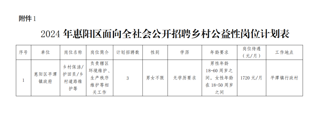 报名时间:2024年6月3日起开始报名,截至6月7日期间招满即停止报名,办公时间:工作日8:30-11:30、14:00-17:30。 报名地点:惠阳区平潭镇人民政府综合治理办公室 报名方式:现场报名,每人限报一个岗位。 报名须提交的资料: (1)属脱贫人口的,提交本人身份证原件和复印件一份,近期1寸照片和《惠阳区2024年乡村公益性岗位报名表》(附件2); (2)属就业困难人员的,提交本人身份证、《就业失业登记证》及其他相关证件的原件及复印件一份,近期1寸照片和《惠阳区2024年乡村公益性岗位报名表》(附件2)。 乡村公益性岗位安置就业,可按规定享受岗位补贴,补贴标准为每人每月不高于当地最低工资标准(2024年岗位补贴标准为每人每月1710元)。用人单位要为乡村公益性岗位人员购买意外伤害商业保险。