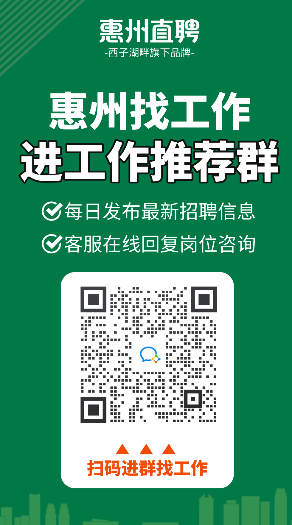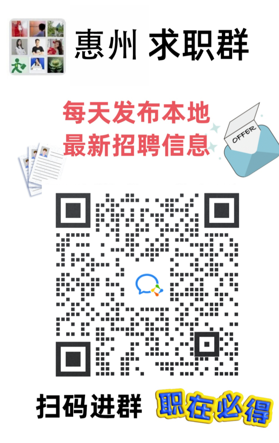 长按识别二维码,了解更多 / 找工作、换工作的赶紧加入 ↓↓↓ ● 惠州工作推荐群 ●