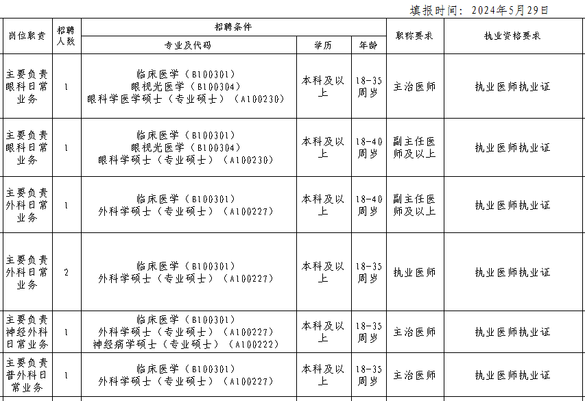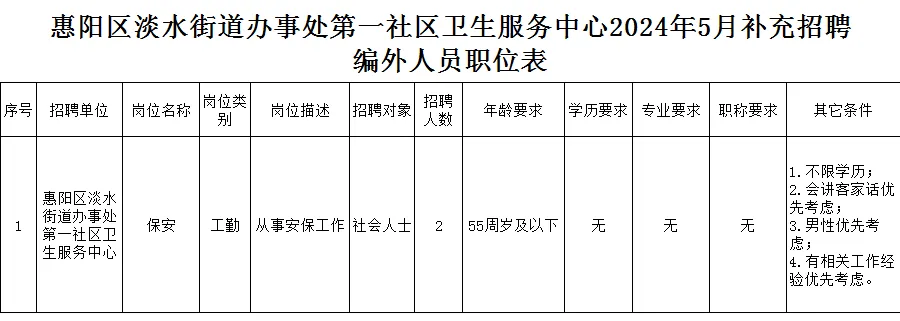 【可扫码进群】 获取公告原文、报名材料及附件 01 招聘人数:1人,性别不限,25周岁以下,全日制大专及以上学历,医学相关专业,应届毕业生。 02 招聘人数:1人,性别不限,25周岁以下,全日制大专及以上学历,护理学专业,应届毕业生。 03 招聘人数:1人,性别不限,30周岁以下,全日制大专及以上学历,康复治疗技术专业,取得康复治疗士及以上职称。 应聘者请于2024年6月5日(星期三)17:00前将简历、身份证、毕业证书(含第一学历及继续教育各阶段学历)、学位证书、专业资格证书等相关证件扫描件(PDF文档形式,文件名字修改为个人姓名)发送到惠城区小金口社区卫生服务中心行政办公室邮箱(1438717957@qq.com)报名(发送邮件标题务必注明报名岗位编号,否则视为无效报名)。中心办公室对应聘者资格进行审查,并确认人选,将以短信及电话进行通知。 聘用人员为编外临聘人员,不占用事业编制,待遇参照小金口社区卫生服务中心临聘人员标准。