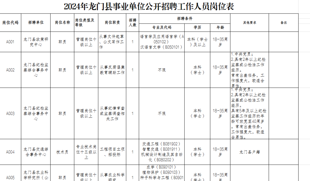 【可扫码进群】 获取公告原文、报名材料及附件 以上是部分岗位招聘截图 更多岗位请扫码进群查看 1.报名时间为:2024年6月4日-2024年6月11日,本次招聘实行网络报名。应聘人员请于2024年6月4日9:00至6月11日17:00登录网址:www.qgsydw.com或扫描二维码进入微信小程序(见附件2)登录“龙门县卫生健康局2024年公开招聘卫生专业技术人员信息管理系统(考生报名)”(以下简称“招聘系统”)报名,请按要求认真准确填写报名信息或上传相关报名材料,不接受现场报名。 (一)事业编制。获聘人员为事业单位编制人员,执行国家、省、县政策规定的待遇;实行试用期制度,试用期包含在聘用合同期限内。试用期满考核不合格的,取消聘用资格。