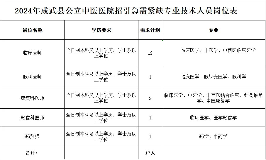 为进一步加大人才引进力度,加快人才梯队建设,为公立医院创新发展提供人才支撑,根据有关政策规定,经县委、县政府同意,决定面向省内外高等院校招引急需紧缺专业技术人员20名,现将有关事项公告如下:扫码回复 成武中医院 获取附件或联系方式 成武县公立中医医院是一所集医疗、科研、教学、预防保健、康复为一体的二级综合中医医院,设置床位200张,是成武县人民医院总医院成员单位,菏泽市中医医疗集团理事单位,山东省中医院医联体成员单位。医院科室齐全,设有急诊科、中医科、内科、外科、骨伤科、妇产科、儿科、针灸推拿科、康复科、五官科、皮肤科、ICU、麻醉科、治未病中心等16个临床科室,医学影像、检验、特检、超声、内镜等5个医技科室。我院牵头联合县人民医院中医科、13家乡镇卫生院国医堂(中医科)建设了全县统一的“医共体中医中心药房”,可实现中药饮片统一采购、审核、调配、煎煮、配送的五统一管理,保障药品质量和用药安全,提升中药煎药服务水平,满足人民群众多元化中医药服务需求。(一)具有中华人民共和国国籍,遵守中华人民共和国宪法和法律,拥护中国共产党领导和社会主义制度,品行端正,具有良好的思想政治素质和职业道德;(二)普通全日制大学本科及以上学历、学位(2024年全日制普通高校应届毕业生应聘的,须在2024年7月31日以前取得学历证书);(三)身体健康,具有符合履行岗位职责要求的身体条件和其他资格、技能条件;(四)以全日制大学本科学历应聘者,应为应届及择业期内未就业毕业生(具备医师资格证者不做应届及择业期要求,毕业年限可放宽至2018年);(五)全日制本科生年龄应在35周岁及以下、硕士研究生年龄应在40周岁及以下、博士研究生年龄应在45周岁及以下(自招聘简章发布之日起计算);(六)已与用人单位签订就业协议的2024年应届毕业生,应聘前与签约单位解除协议或经签约单位同意,可以应聘;(七)在职人员应聘的,须经有用人权限的部门或单位同意,并出具加盖部门或单位公章的同意报考证明。曾受过刑事处罚或曾被开除公职的人员、在读全日制普通高校非应届毕业生、现役军人以及法律法规规定不得聘用的其他情形人员不得应聘。在读全日制普通高校非应届毕业生不得用已取得的学历学位作为条件应聘。A类岗位:3名,不设具体岗位及岗位聘用人数。具体要求:①全日制硕士研究生及以上学历学位(根据《教育部办公厅等五部门关于进一步做好非全日制研究生就业工作的通知》(教研厅函〔2019〕1号)文件精神,2017年起,由国家统一下达招生计划的研究生,不限定全日制学历性质,但须持有省级高校毕业生就业工作部门和高等学校办理的就业手续);③最新一轮学科评估为 A-及以上专业全日制本科及以上学历学位。临床医学类、中医诊断学类、中医基础理论、中西医结合临床、中医内科学、中医外科学、中医骨伤科学、针灸推拿学、眼科学、耳鼻咽喉科学、中医五官科学、皮肤病与性病学等医疗相关专业。3.A类岗位资格审查合格人员全部参加面试。资格审查合格人数达不到招聘计划数的,相应予以取消或核减,取消或核减的岗位数将调剂到B岗临床医师岗位使用。B类岗位:17名,招聘岗位类别及人数如图: 报名采取电子邮箱投递或现场报名方式进行,推荐采取电子邮箱投递方式报名。每名报考人员只能应聘一个岗位。②国家承认的学历学位证书(2024年院校未发放毕业证、学位证的应届毕业生,需提供院校核发的就业推荐表,);③教育部学历证书电子注册备案表(2024届应届毕业生提供教育部学籍在线验证报告);④《2024年成武县公立中医医院招聘报名暨资格审查登记表》(自行下载打印后填写,见附件);采取电子邮箱投递报名的,报名时间从简章发布之日起到2024年6月3日上午11:00截止,请在规定时间内将报名所需材料(扫描做成一个PDF文件),通过电子邮件发送至:cwxglzyyyrsk@163.com邮箱,报名邮件统一命名为“应聘岗位+姓名+毕业学校”。采取现场报名方式报名的,须持报名所需材料原件及复印件,于笔试当天提前1小时到达笔试地点报名并同步进行资格审查。医院组织人员对电子邮箱报名人员提供的证件材料进行初审,审核结果通过电子邮件进行回复。对报考人员的资格审查工作贯穿于招聘工作的全过程,对恶意扰乱报名秩序或者提供虚假信息、伪造学历证明及其他有关证件获取考试、聘用资格的,一经发现,取消考试、聘用资格。网上初审时间:2024年5月25日上午10:00至2024年6 月 3日下午17:00。考试分为笔试和面试。B类岗位采取笔试+面试的方式进行,A类岗位的报考人员不参加笔试,只进行面试。笔试不设开考比例,根据实际报名人数组织笔试考试。笔试内容以招聘岗位专业要求相关的知识、技能为主,不指定考试大纲和教材。为保证新进事业单位人员基本素质,笔试设定最低合格分数线,根据岗位招聘人数和笔试情况确定。笔试成绩当天公示。笔试时间:2024年6月5日上午9:30-11:30笔试地点:济南市历下区经十路16369号,山东中医药大学千佛山校区教学楼301、302、304、307、311(参加笔试人员全部集合在教学楼301、302)。B类岗位的应聘人员笔试结束后,根据笔试成绩,在合格分数线以上从高分到低分按照1:3的比例确定进入面试范围人选;达不到比例的,按照合格分数线以上实际人数参加面试。最后一名如有数名考生笔