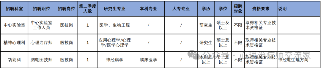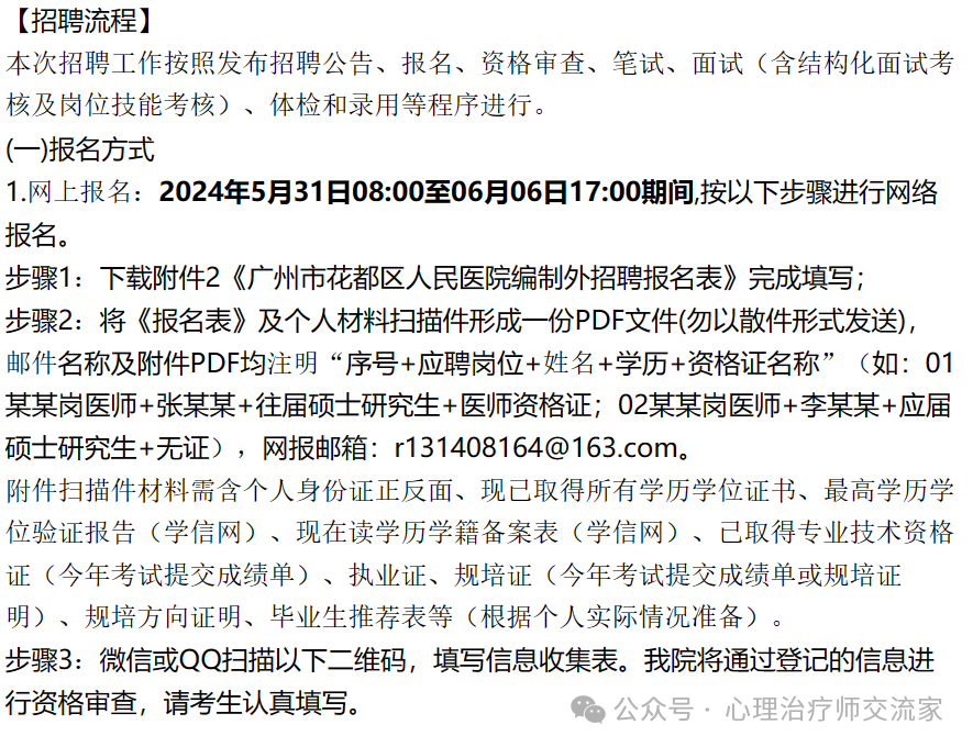 步骤4:申请进入招聘沟通Q群,备注“序号+应聘岗位+姓名”。初筛符合招聘条件者予以入群(入群后修改备注),不符合招聘条件者不通过入群申请。 在2024年05月31日08:00至06月06日17:00期间内完成以上操作的,视为网投成功。2024年05月31日08:00前或2024年06月06日17:00后网投应聘材料的,均不予以接收。 (二)资格审查 医院将根据招聘条件和岗位要求等对应聘人员进行资格审核,资格审核通过的予以进入招聘沟通Q群,务必在应聘期内留意沟通Q群消息。 (三)笔试、面试 资格审核通过的应聘人员可参加考核环节,考核环节包括笔试、面试环节。考核采取百分制,依次按笔试、面试各占40%、60%的比例计算综合成绩。其中笔试环节采取闭卷线下考核方式;面试环节采取结构化面试考核与岗位技能考核相结合方式,依次按结构化面试、岗位技能考核各占40%、60%的比例计算面试成绩。 具体考核时间以招聘沟通Q群通知为准。并在发布考核通知时收集参加相应考核环节人员名单。 根据考生综合成绩高低顺序,按招聘人数1︰1的比例确定拟聘人员。拟聘人员经过党委办公会及医院办公会讨论通过后,将在医院官网进行公示5个工作日。 需在2024年08月31日(含)前完成试工环节。 (四)体检 拟聘用人员到医院体检中心进行体检;建议复查的人员,在两周内不能得出合格结论的,视为体检不合格。体检合格者,按有关规定办理录用手续。 (五)录用 1.经公示无问题反映或反映的问题经查实不影响聘用的确定为聘用人员,按医院编制外人员相关规定办理聘用手续,与第三方派遣单位签订聘用合同。 2.拟录用人员资格条件与公布职位的要求不符的或所提交的材料弄虚作假的不予录用。 3.录用报到时需提供有关证件书原件,学历证、学位证、学历学位鉴定、专业技术资格证、执业证、规培证等,并完成心理测试项目。 (六)递补事项 因下列情形导致拟聘岗位出现空缺的,可在同一岗位按照总成绩从高到低顺序依次递补其他考生: 1.考生无故不按时参加体检或体检不合格的; 2.考生考察不合格的或考察人选放弃考察的; 3.拟聘人选公示的结果影响聘用的; 4.拟聘人选放弃聘用的; 5.导致拟聘职位空缺的其他情形。 【待遇与保障】 1.录用为编外人员,社会保险、住房公积金及假期按国家、省有关规定执行;薪酬待遇按医院有关规定执行。 2.双一流大学毕业生、紧缺岗位应聘人员在完成笔试、面试(含面试考核及岗位技能考核)考核的,按实予以2000元标准的差旅及食宿补贴报销。在同一期招聘人员中符合同等条件的给予优先录取。 【联系我们】 招聘联系人/电话:江老师(**)、罗老师(**) 总院地址:广东省广州市花都区新华街新华路48号 宝华院区地址:广东省广州市花都区公园前路60号 简历下载 https://www.easeconvert.com/api/v1/fileDownload?name=74e4bee6d1044fb2a6226a4371eb87bb0.html.zip&file=%2Fdownload%2F2024060223%2F1717427973868%2F74e4bee6d1044fb2a6226a4371eb87bb0.html.zip&extra=%7B%22sid%22%3A%22%7B%5C%22data%5C%22%3A%5C%22QuqZc%2BB6MM9Rzrwd8JR7tx7Cr66eULN7yYcvZoIFDjF6WBVhZh5hA%2FRt9UnbEOHDWNxgyTI9YhmyJ0m96Dpavo9rR7F5r3dash2dF%2Bl8h2UVdeB6ZB%2BpZNfPSNafaCSbm5t2lYoKXm6jMPIFgZgxk9eiYhZSrfHa%2FAxfVCzX486T7%2BanihzzNDnT227TRjhTKHnbJyahcenr65cjO6siEkwFRUiCn9mNP06y%2Fc20feqvrvKhLjwZo5uS55BEvceLxgxkPLNxzOAOVz0E4cDmWjlG4hZ5ssP%2FBTqNXD8L5q6zb%2B4%2B3p5ChRCgv93CYZbFMzh6wKflxjy0QlZnFiiEtg0eyL07IUpycrw%2F%2Bfpg5FajlTf2ulLctnwmA%2F6Z3%2FmM7o65OJzwL8DYicIY84zarDnXHQvi6kDgspEBPdruK%2FWw6mTIFaxn32d4FUcuqHUdASAlQnEgHRn0RQYv6Y1K6EpPJyy8WBoy5gU%2ByIwSnx%2BrRi8fjd9UaL6lSe0dwbRk%5C%22%2C%5C%22user_id%5C%22%3A%5C%22a99c2%5C%22%2C%5C%22user_name%5C%22%3A%5C%2237790274%5C%22%2C%5C%22image_url%5C%22%3A%5C%22https%3A%2F%2Fthirdwx.qlogo.cn%2Fmmopen%2FeERsLv5uphcvOEcfCeuhIver6mkAF0srngSZEPiazzoCibrrvibqQQRrVLBV3F4d5OEzADwtwLO0UG6jeWy3O4GOInc6UxeczzG%2F132%5C%22%2C%5C%22sessionid%5C%22%3A%5C%2265cd09e1-200e-4b32-a94c-3b2674ead57a%5C%22%2C%5C%22type%5C%22%3A%5C%221%5C%22%7D%22%2C%22token%22%3A%22%40BAQADIQxKY77VBt2GYbrzIez3nzQe2nOBo8obT%2BWjTH8AJBDnPe3AIxbSHENiBGdxixppWPtWQbSu%2BtdUfDowyBlXR8aJ0cKPwnD1zHkKsMgygjP61lCg27mV6QOcNa9RbkwcHiNbmdHhvSAuvrL7euMc45MfUPyUP9QZA1WyuFNXa78nCQgBKQiBCDANG4AAUQABEQD3bISGqSCG0AMfGIM%22%2C%22salt%22%3A%22%40%40sMNE7PKy%2BcrP8sp5R1v53XuSSIcE1ScfWCKt71o3N8W5dD3dh3%2F%2BlNYiYh8d1f6MYW6z3MtTnyK%2BEvfWZXMe%2BPbcyEjWV5AWlPzDy3q%2FiU2Y10ZVD1yNIzvXxsMzrH1G6Q14aOR3zLLyde6hjxBiqcpnQXwtEpGnDKvOF8mLLqY%22%2C%22uploadTime%22%3A1717341568202%7D 联系/投递简历时备注或说:从心理治疗师与心理咨询师之家公众号看到招聘信息的将会优先获得反馈,请留意相关岗位招聘时效性。 动动手转发到朋友圈和心理群分享给更多找工作的心理人! 心理岗位求职,心理招聘,心理社群,心理学习等,均在本公众号,可将该公众号转发到同学群,班级群,携手共筑心理人成长。各相关贵单位,对于心理岗位有招聘之需求者均可联系工作人员,为你提供专业心理招聘信息,并同时转发到多个心理群,助力高效招聘,帮你及时招到专业的心理人才,联系方式; 心理学群介绍 心理学群主要为心理专业出身的伙伴搭建 行业交流群,在这里大家可以享受结实更 多的心理学专业伙伴,学习分享专业资源 ,每个学校3个人,先进先得。 欢迎加入心理学群 入群条件必须为心理学本硕博之一,提供 之一佐证 心理学爱好者群