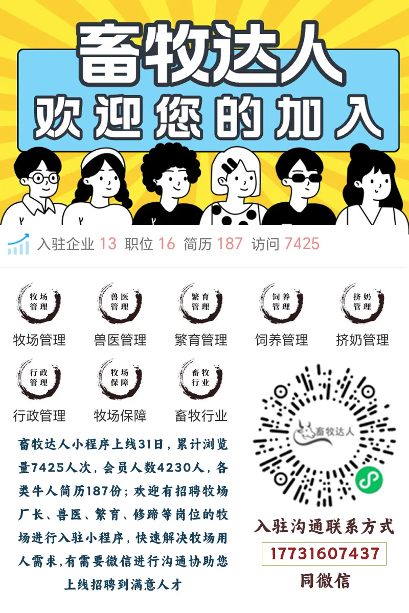 招聘两名兽医,有经验丰富,在大牛场干过技术水平较高,不喝酒,能长期干工作,工资7000到10000元。 地址:新疆阿勒泰 电话:133 6301 1938,赵 ![]() ![]() ![]() ![]() 2.招聘岗位:兽医兼繁育 陕西品晟鼎固畜牧有限公司人员招聘 职位:兽医兼繁育 工作地点:贵州 年龄:18周岁-50周岁 工作内容:1、负责所在牧场的技术服务工作,兽医、繁育等 2、负责牧场的防疫工作 3、监督牧场做好产后卫生保健工作,降低发病率 4、监督牧场环境卫生、饲草料供应及时、消毒等工作。发现问题及时上报 5、做好牛群配种信息及用药明细,每天报送公司信息部 6、严格按照本部门操作流程执行工作 7、协助主管其他日常工作等 任职要求: 1、具有兽医临床经验和动物繁育管理经验者优先考虑 2、对动物的健康有高度的责任感和关注 3、具有良好的沟通能力和团队精神 薪资:面议 联系方式:150 7943 8797 ![]() ![]() ![]() ![]() 3.招聘岗位:接产员,兽医助理,犊牛饲养员,挤奶工,后勤 廊坊市阿斯根农牧发展有限公司现诚聘:挤奶工,接产,兽医助理,犊牛饲喂、后勤人员若干名。公司免费提供食宿,可上保险,薪资待遇优厚。 地址:河北省廊坊市广阳区万庄石油采油四厂附近 联系电话:157 3163 6768 联系人:习女士 ![]() ![]() 求 职 信 息 ![]() ![]() 1. 求职岗位:繁育主配或副配 求职: 繁育主配或副配,繁育流程,配种,B超都会,大型牧场工作4年 要求:工资月结(工资可谈,工资拖欠勿扰)地点要求宁夏及宁夏周边,太远不考虑。 联系电话:185 0954 1854 (电话聊不清可加微信同号) ![]() ![]() ![]() ![]() 2. 求职岗位:繁育或兽医,三人 求职 兽医或繁育 畜牧兽医专业实习生,实习半年,要求牛场回餐,一共3个人。 电话:185 0955 8326 ![]() ![]() ![]() 一 招聘信息 1. 招聘岗位:兽医,接产员 大型肉牛繁殖场招聘:招接产员2人!要求必须是成手!年龄最好不超过45周岁,工作每周黑白班两班倒,每班2人,每月10日工资打卡,遇法定节假日提前发放,不拖欠。可缴纳五险,免费提供食宿。 地址:吉林省松原市查干花镇种畜场 联系人:程场长 电话:187 4387 6517 2.招聘岗位:驻场繁育 烟台大型饲料公司招聘 驻场繁育一名会打针输液 繁育流程 工资面议。交五险 一经录用立马上岗。 联系电话:136 9763 4913 3.招聘岗位:卧床工 招人:牧场需旋耕卧床以及运动场司机一名,工资4200--5000元 地址:平罗县红崖子乡牧场 联系电话:176 1474 3230 4.招聘岗位:挤奶工,挤奶班长 招聘: 挤奶班长1名 挤奶工;4名 三班倒,回餐,并列式挤奶设备28位 要求:熟手,18-45岁 宿舍标准双人宿舍,宿舍里有独立洗手间,沐浴 工资每月按时发放 资薪待遇电话详谈 地址:孙家滩鸽堂沟奶牛养殖园区 联系电话: 包站长:150 9558 5645 王场长:155 0083 5000 二 求职信息 暂无 免责声明: 1、本刊所登招聘、求职信息,均为对方自行提供。内容的真实性合法性由提供者负责,本刊对此不承担责任。 2、出现以下情况,本刊核实后将不予刊登其招聘信息。 (1)招聘企业出现信息不实、拖欠工资等不良问题; (2)求职者虚报简历,真实情况与所登信息不符者。 3、招聘求职信息均由本刊联系整理,如需转载请注明出处。 点击蓝字 关注我们 AUTUMN |