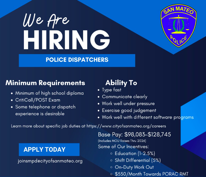 湾区华人资讯网5月29日报道(记者Tracy)湾区圣马特奥市(San Mateo)警方发布公告宣布招聘公共调度员,中级公共调度员被聘用即可获1.5万美元奖金,想要进入公共安全领域的民众勿错过机会。 为解决人手紧缺的问题及鼓励更多合资格的人士进入执法部门,圣马特奥市警局为有经验的中级公共调度员一职推出奖励机制,一旦被聘用即可获得1.5万美元的招聘奖励。 中级公共调度员月薪在8244至9825美元万之间,初级公共调度员月薪在7485至8922美元美元之间。警局指出,公共调度员有补贴及加班费等。