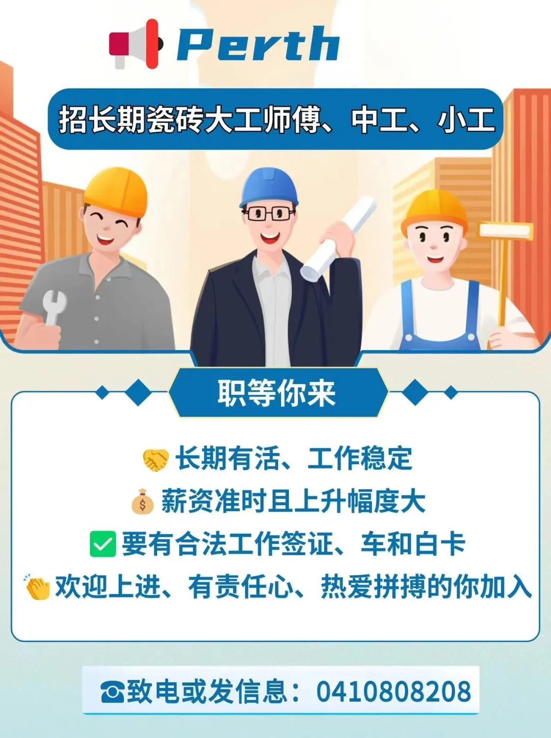 📢Perth招长期瓷砖工大师傅、中工、小工。