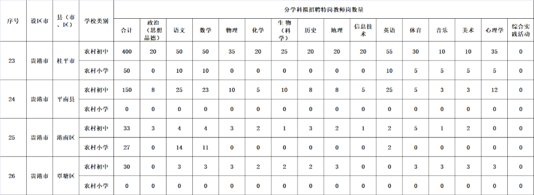 按照国家和自治区有关部署,为加强农村教师队伍和中等职业学校教师队伍建设,2024年继续实施“农村义务教育阶段学校教师特设岗位计划”(以下简称“义教特岗”)和“中等职业学校教师特设岗位计划”(以下简称“中职特岗”)。现就做好2024年特岗教师招聘工作有关事项通知如下:(一)义教特岗。面向全区52个县(市、区)设岗,计划招聘农村中小学特岗教师3903名。各设岗县(市、区)分学科岗位招聘计划详见《2024年“义教特岗”教师招聘计划表》(附件1)。(二)中职特岗。面向全区11个县(市、区)设岗,计划招聘中等职业学校特岗教师58名。各设岗县(市、区)分学科(专业)岗位招聘计划详见《2024年“中职特岗”教师招聘计划表》(附件2)。(一)政治素质好,热爱社会主义祖国,拥护党的各项方针、政策,热爱教育事业,有强烈的事业心和责任感,品行端正,遵纪守法。符合《中华人民共和国教师法》《教师资格条例》等法律法规规定的普通话水平、身体条件和心理条件。符合新时代中小学教师职业行为十项准则要求,无刑事犯罪记录和其他不得聘用的违法记录。(二)义务教育阶段要求本科及以上学历,以师范类专业为主,小学阶段可适当招聘师范高等专科学校毕业生;中职学校要求本科及以上学历。年龄不超过30周岁(截至报名首日未满31周岁)。普通高校往届本科、师范类专科毕业生需具有相应的教师资格证书;2024年应届本科、师范类专科毕业生是否取得教师资格证书不作为报考条件要求。(三)报名人员应同时符合教师资格条件要求和招聘岗位要求。应聘中等职业学校、初中岗位的考生,所学专业与拟任教学科原则上应一致;应聘小学岗位的考生,没有对应专业岗位的考生,按文理科报考小学语文或小学数学岗位。报考英语、音乐、美术、体育岗位的考生,所学专业必须与岗位学科一致。(四)应聘中等职业学校岗位的考生,具有中级及以上专业技术职务或技师及以上职业资格的企业人员,或者是在相关行业领域享有较高声誉、具有丰富实践经验和特殊技能的“能工巧匠”,同等条件下优先,年龄可放宽至35周岁以下(截至报名首日未满36周岁),学历可放宽至专科。(五)参加过“大学生志愿服务西部计划”且有从教经历的志愿者和参加过半年以上实习支教的师范专业毕业生同等条件下优先。支持鼓励符合条件的退役军人到中小学任教,可综合考虑服役年限等因素对退役军人相应放宽年龄限制。因犯罪受过刑事处罚的人员,被开除中国共产党党籍的人员,被开除公职的人员;被依法列为失信联合惩戒对象人员。在事业单位和特岗教师招聘中被认定有违纪违规行为且被记入诚信档案库,目前仍在惩戒期的人员;服务期未满的定向培养人员、特岗教师;在职在编公职人员;现役军人;法律法规规定的其他情形。本次招聘报名及资格审查采取网络方式进行,不设现场报名,不收取报名费。符合条件的应聘者登录广西特岗教师招聘网(网址:http://tgjszp.gxeduyun.edu.cn),按要求如实填写报名信息,包括本人基本信息和报考岗位信息等。2.资格审查:各设岗县(市、区)在网上对应聘人员进行资格审查。资格审查工作于2024年6月19日完成。(1)报考人员应对在网上提交信息的真实性负责,凡弄虚作假者,一经查实,即取消考试资格或聘用资格,所造成的损失和责任由其本人承担。(2)报考人员只能选择一个县(市、区)的一个职位进行报名;不能用新、旧两个身份证同时报名,报名与考试使用的身份证必须一致。(3)已与设岗县(市、区)达成就业意向的毕业生必须在上述时间范围内在网上报名(未在网上报名的,视为自动放弃应聘处理)。3.资格复审:招聘前对报考人员必须进行资格复审,主要验证报考人员的身份证、毕业证、学位证、教师资格证、职业资格证及其他个人求职材料。复审不合格者,取消应聘资格。4.招聘方案:各设岗县(市、区)教育、人力资源社会保障等部门,面向通过资格审查人员,联合制定招聘方案,并及时公布方案。是否安排笔试环节,由各县(市、区)确定,自治区不作统一要求。面试将着重考核应聘人员的思想政治素质、道德品质修养、业务能力、遵纪守法情况等。边远艰苦贫困地区和急需紧缺专业的特岗教师招聘,可以结合实际情况适当降低开考比例或不设开考比例。符合规定条件的,可以采取面试、直接考核等方式,划定成绩合格线。5.体检:各市、县(市、区)教育局组织本辖区拟聘人员的体检工作。体检标准参照公务员录用体检标准执行。体检费用由报考人员承担。对体检不合格的,不得聘用。空缺的名额,可以按成绩排名顺序依次递补。6.公示:各设岗县(市、区)的拟聘人员名单必须按程序予以公示,公示期不少于7个工作日。7.招聘要求:各设岗县(市、区)必须严格按照《关于印发〈广西壮族自治区事业单位公开招聘人员实施办法〉的通知》(桂人社发〔2011〕155号)和《关于印发〈广西壮族自治区事业单位公开招聘工作人员面试工作规则(试行)〉的通知》(桂人社发〔2012〕79号)精神招聘特岗教师。整个招聘工作必须按照“公开、公平、自愿、择优”的原则进行,严格执行有关政策规定,接受监督部门和社会各界的监督,严禁在招聘工作中徇私舞弊,弄虚作假。对违反规定的单位和个人,一经查实,将按规定严肃处理。1.公布名单:经公示无异议,由设岗县(市、区)人民政府公布聘用人员名单,并