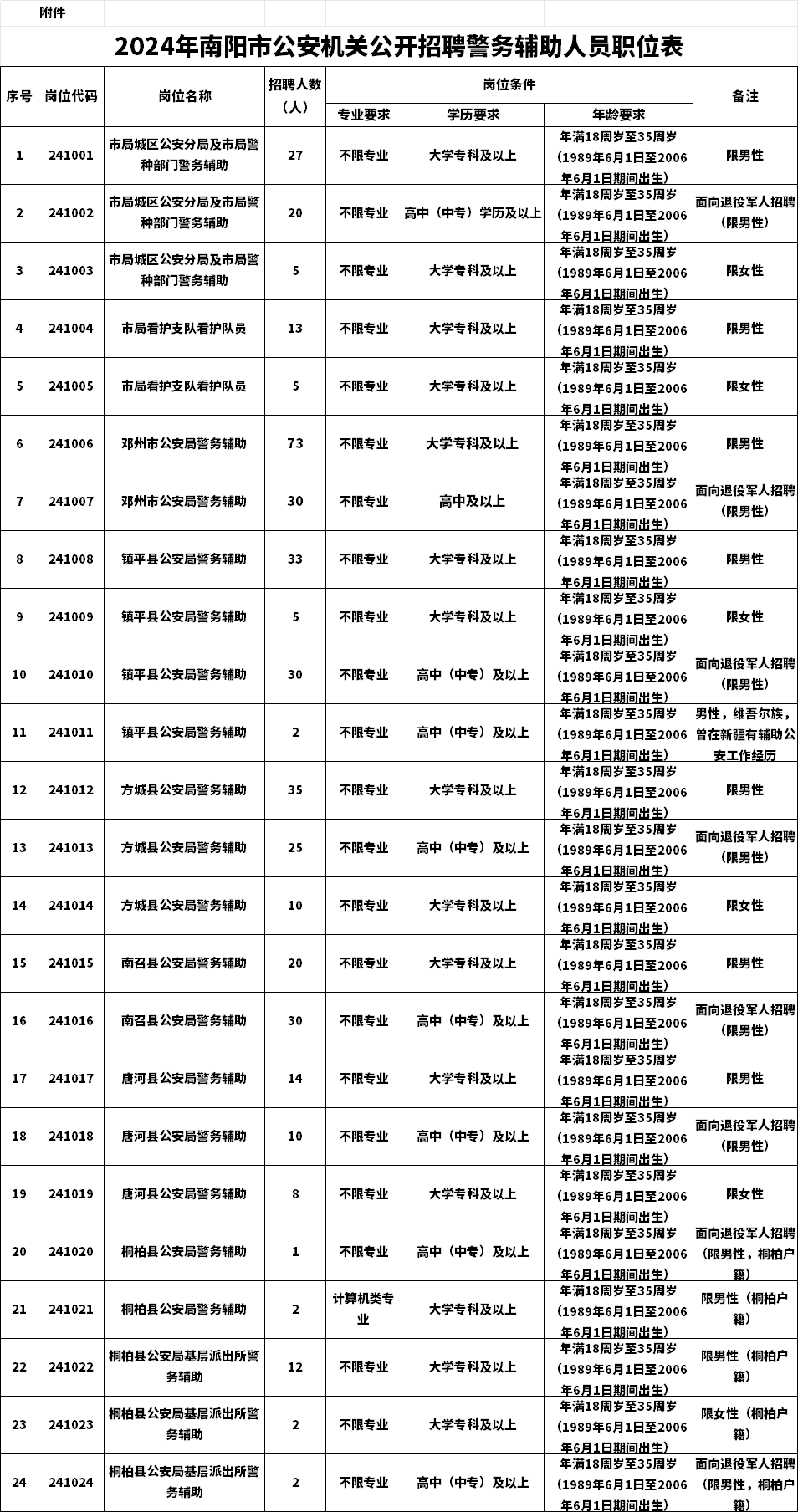 【南阳—招警】 根据工作需要,南阳市公安机关面向社会公开招聘警务辅助人员414名,相关招聘事项公告如下: 一、招聘计划 招聘警务辅助人员414名,男性379人(其中退役军人148人)、女性35人,具体情况如下(招聘具体职位见附件): (一)南阳市公安局招聘70人(含看护队员18人),男性60人(含退役军人20人,看护队员13人)、女性10人(含看护队员5人)(招聘岗位为市局各分局、局直警种部门及看护支队); (二)邓州市公安局招聘辅警103人,招聘人员均为男性,其中退役军人30名(招聘岗位为邓州市公安局所属单位); (三)镇平县公安局招聘辅警70人,男性65人(含退役军人30人)、女性5人(招聘岗位为镇平县公安局所属单位); (四)方城县公安局招聘辅警70人,男性60人(含退役军人25人)、女性10人(招聘岗位为方城县公安局所属单位); (五)南召县公安局招聘辅警50人,招聘人员均为男性,其中退役军人30人(招聘岗位为南召县公安局所属单位); (六)唐河县公安局招聘辅警32人,男性24人(含退役军人10人)、女性8人(招聘岗位为唐河县公安局所属单位); (七)桐柏县公安局招聘辅警19人,男性17人(含退役军人3人)、女性2人(招聘岗位为桐柏县公安局局直单位和所属派出所)。 二、招聘资格条件 (一)具有下列资格条件的人员可以应聘报名: 1.具有中华人民共和国国籍; 2.拥护中华人民共和国宪法,遵守国家法律、法规和社会公德,政治坚定,品德端正; 3.自愿从事警务辅助工作,具有忠诚奉献、吃苦耐劳精神,服从组织分配; 4.年满18周岁以上、35周岁以下(1989年6月1日至2006年6月1日期间出生); 5.具有国家承认的大学专科及以上学历;退役士兵文化程度可放宽至高中(中专);具备报考岗位所需的基础理论和专业知识,聘用后能够按照用人单位要求及时到岗工作; 6.具备履行职责所需的身体条件,身体健康、体型端正,无残疾、无纹身、无传染病、无色盲,双侧矫正视力均在4.8以上; 7.具备履行岗位所需的心理素质和工作能力; 8.具备拟聘用职位要求的其他资格条件; 9.法律、法规规定的其他条件。 (二)具有下列情形之一的不得应招报考: 1.本人受过刑事、行政处罚或涉嫌违法犯罪尚未查清的; 2.家庭成员被判处死刑或者正在服刑的; 3.本人或家庭成员参加非法组织、邪教组织或者从事其他危害国家安全活动的; 4.曾被开除中国共产党党籍、开除中国共产主义青年团团籍、在高等教育期间被开除学籍、被机关事业单位开除公职或辞退的; 5.曾从事警务辅助人员或者看护队员工作辞职的,或因曾违反公安机关管理规定被解除劳动合同的; 6.有较为严重个人不良信用记录的; 7.法律、法规规定不适合从事警务辅助工作的其他情形。 (三)同等条件下优先招聘以下人员: 1.烈士遗属、因公牺牲军人和因公牺牲人民警察的配偶子女; 2.见义勇为积极分子和先进个人; 3.警察类或政法类院校毕业生; 4.具有岗位所需要的特殊专业技能人才; 5.国家和省规定的其他优先聘用情形。 三、招聘程序 本次招聘按照网上报名、资格审查、笔试、体能测评、面试、体检、考察政审、公示、聘用等程序进行。招聘公告将通过南阳市人力资源和社会保障局网站(http://rensheju.nanyang.gov.cn)、南阳市人事考试网(http://www.nyrsksw.com)、南阳市公安局网站(http://ga.nanyang.gov.cn)发布。 (一)网上报名 1.报名申请 本次招聘考试,采取网上报名方式进行。2024年6月 7日9:00至6月12日18:00.报名者登录南阳市人事考试网(http://www.nyrsksw.com),点击“2024年南阳市公安机关公开招聘警务辅助人员报名入口”进入网上报名系统,按要求提交报名申请并上传本人近期免冠正面证件电子照片(红底、蓝底、白底均可)。报名申请被接受后,请牢记报名密码,身份证号码和密码是报考者查询报名资格审查结果、网上缴费、下载打印资格审查表和准考证等事项的重要依据,请妥善留存。 2.报名要求 报考人员只能选择一个专业岗位进行报名,多报者无效,报名与考试时使用的有效居民身份证必须一致。报考者报名前,要仔细阅读相关要求,提交的报考申请信息应当全面、真实、准确、有效;要全面了解职位要求,报考岗位要与自身情况一一对照,自行判断是否具备相应资格条件,理性、慎重选择报考职位,避免误报、错报。因误报、错报职位或提交虚假信息所产生的一切后果,由报考者本人承担。 (二)资格审查 1.资格初审 报考人员报名后,招聘单位根据招聘资格条件对报考者填报的信息进行资格初审。报考人员可在填报信息后及时登陆原报名网站查询是否通过资格审查。通过报考资格初审人员,不能再报考其他职位;报考申请尚未进行初审或未通过报考资格初审的人员,可以改报其他职位。报考资料不全或电子照片不符合要求的,报考者应及时补充或更换,并按要求再次提交审查。 2.网上缴费 考生在提交报名申请后,请及时登录报名系统,查看是否通过报考资格初审,通过报考初审的即可缴费,笔试考务费每人30元,请考生登陆报名网站缴纳。网上缴费截止时间为2024年6月13日18:00.未按期缴费的视为自动放弃。缴费完成后,考生须自行打印《2024年南阳市公安机关公开招聘警务辅助人员报名资格审查表》两份,招聘中在资格确认时要提供该材料以验证考生报名情况。 3.调整招聘职位 各职位的拟招聘人数与报名人数的比例原则上设定为1:3.达不到1:3的,该职位招聘名额递减或取消。对拟聘用职位被取消的报