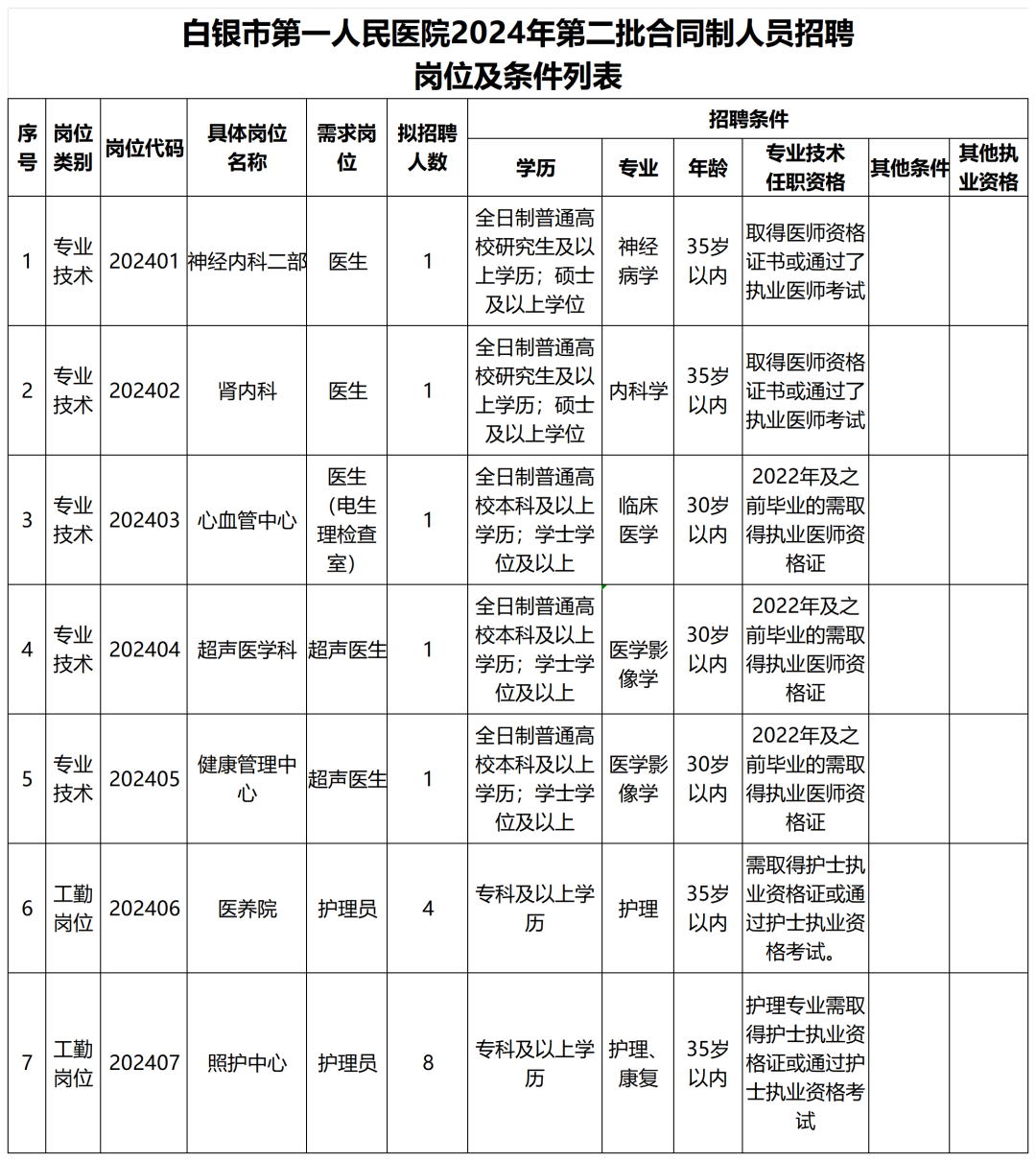 甘肃中医药大学第三附属医院·白银市第一人民医院是一所集医疗、教学、科研、急救、预防、康复、职业病防治、健康体检于一体的三级甲等综合性公立医院,是本地区唯一一所市属综合公立医院。医院为解决人员不足问题,拟组织实施公开招聘,现将有关事项公告如下。 01 招聘岗位及数量。 ![]() 02 招聘岗位条件的具体学历、专业及其它资格条件以岗位表要求为准。年龄在35周岁及以下为1988年6月30日以后出生,年龄在30周岁及以下为1993年6月30日以后出生。 (二)拥护中国共产党的领导,热爱祖国,遵守宪法和法律,品行良好,德才兼备,爱岗敬业,具有奉献精神。 (三)报考人员不限户籍和生源。 (四)五官端正,身体、心理健康,具备正常履行职责的身体条件。 (五)有下列情形之一的不得报名: 1.在各级人事考录招聘考试中因违纪违规行为被记入诚信档案且记录期限未满的人员,被依法列为失信联合惩戒对象的。 2.受过刑事处罚、受到党纪政纪处分期限未满或因违纪违规被开除党籍、公职及辞退解聘的人员。 3. 现役军人,普通高校在读的全日制非2024年应届毕业生,已被机关事业单位录(聘)用的在编人员,服务期内各类订单、定向、项目人员。 4. 法律、法规规定不得招聘为事业单位工作人员的其他情形人员。 03 本次招聘工作采用现场报名方式。 (一)报名时间:2024年6月3日上午8:00—11:30,下午14:30--16:30。 (二)报名地点:白银市第一人民医院人事科(行政楼6楼)。 (三)报名所需材料: 招聘工作领导小组办公室根据公告中报考岗位所要求的资格条件,对报考者进行资格审查。报名时,提供证件包括:应届生提供学校推荐函、成绩单、三方协议、身份证等原件和复印件;往届生提供毕业证、学位证(本科生)、《教育部学历证书电子注册备案表》、身份证及其它所需材料原件和复印件。提供近期正面免冠2寸彩照3张,一份填写好的《白银市第一人民医院公开招聘合同制人员报名登记表》(见附件2)。 要求考生提交的报考申请材料真实、准确。报考人员提供虚假报考申请材料的,一经发现,即取消报考资格。报考人员提供准确、有效的联系方式。 04 (一)考试时间及地点:以准考证为准 (二)考试方式:招聘考试按专业知识测试和面试答辩的形式进行。专业知识测试成绩在不低于60分的基础上,按照从高至低顺序,以招聘人数1:3比例确定进入面试环节。面试成绩低于60分一票否决,最终成绩为专业知识测试和面试答辩的总和,专业知识占60%,面试占40%。 (三)招聘人数达不到1:3比例的,专业成绩80分及以上者进入面试环节,总成绩达到80分及以上者予以录用。 (四)用人单位与拟聘人员现场签订三方协议。 05 (一)体检:考试结束后进行,人事科组织拟聘人员进行体检。体检不合格者,可复检一次,复检仍不合格的,取消考察资格;对于体检过程中,弄虚作假或者隐瞒真实情况致使体检结果失真的体检者,不予聘用。 (二)资格复审:在考察中,用人单位对拟聘人员的岗位要求基本条件和资格的原件进行复审。已参加工作者,需提供与原单位解除劳动合同证明 。 (三)考察:考察以考生提供的院校证明及调取核查个人档案相结合的方式进行。对考察中个别存在疑问的考生,我院将联系相关单位进一步查证。考察中发现提供虚假材料、填报虚假信息的应聘人员、未取得“毕业证”“学位证”和(或)“岗位表中要求的条件”人员不予聘用。 06 应聘人员属于合同制人员,按照《白银市第一人民医院合同制人员管理办法》管理。 07 联系电话:0943-8811974 白银市第一人民医院 2024年5月29日 ![]() 附件: 图文:木子 排版:木子 来源:白银市第一人民医院 |