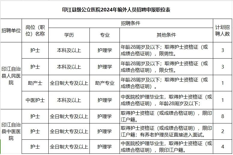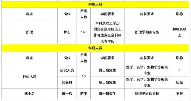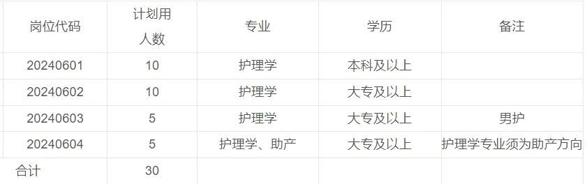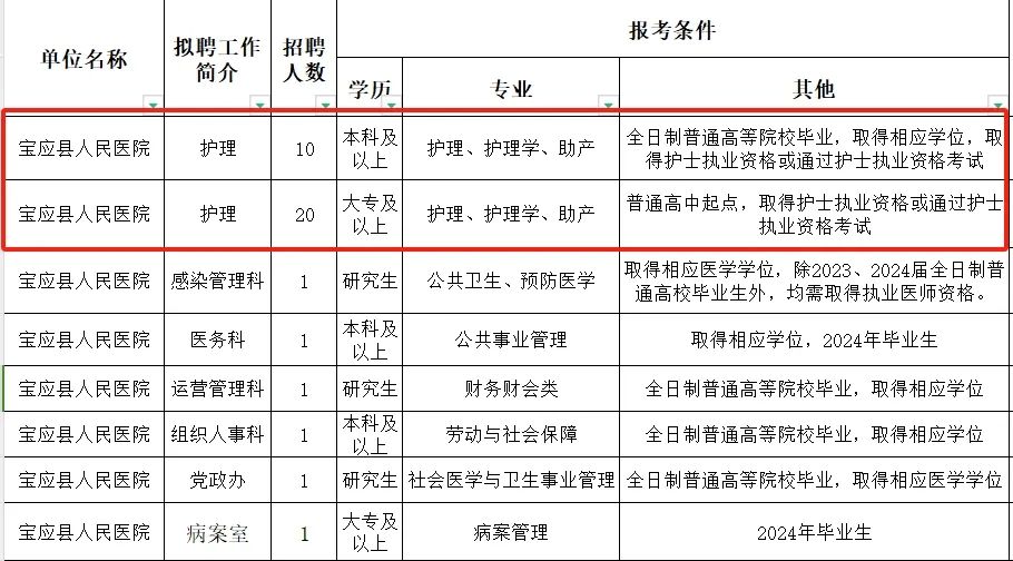 ![]() 各位护理小伙伴, 你是否正在找工作呢? 新的护理岗位招聘信息, 小编每日分享给你! 2024年上海市中医医院 招聘护理人员140名 一、招聘岗位及要求 1、遵纪守法,身心健康,具有良好的思想政治素质和道德品质,具有工作责任心、职业道德、团结协作和奉献精神。 2、具备岗位所需的专业能力和技能,临床人员须持有执业医师证及住院医师规范化培训合格证。 3、服从医院及科室在院区之间的工作安排和调配。 4、具有三甲医院工作经验及科研能力强者优先。 二、报名时间及方式 1、报名时间:公告发布之日起报名,招满为止! 2、报名方式:采用网络报名方式 (1)根据自身实际情况,认真仔细填写表单,表单链接:https://www.chaojibiaoge.com/U/url/ofo6t5ad,或扫二维码填报,请勿重复递交。 (2)如遇到无法投递时,还可通过邮箱投递个人简历电子版,详细资料如下: ①各阶段学习、实习、工作经历,医生请注明规培医院+基地名称+规培时间+出站时间。 ②学历证明、毕业生推荐表和成绩单、校级以上荣誉证书、英语四六级等证书。 ③职称资格。 ④科研成果等。 以上请发至邮箱: szyrsc2019@163.com 邮件主题中注明应聘岗位、姓名、学历、毕业院校。 请勿重复投递简历,招聘信息在职位满额前一直有效。 3、联系电话:徐老师,56639828*62235/51238 2024年淮南市第一人民医院 招聘护理人员30名 一、招聘岗位及要求 1、学历要求:经全国普通高等学校招生统一考试入学的普通高校毕业生。 2、年龄要求: (1)应届毕业生:大专学历不超过24周岁,本科学历不超过25周岁。 (2)具有工作经历大专学历不超过26岁,本科学历不超过27岁;3年及以上三甲医院工作经历,年龄放宽至30周岁。 公开招聘人员岗位表中涉及年龄计算方式如下,如不超过24周岁即为2000年1月1日以后出生(含)。 二、报名时间及方式 1、报名时间:2024年6月3日至6月7日16时。 2、报名方式:采用网络报名。 安徽理工大学人才招聘系统:https://rczp.aust.edu.cn。 应聘者需实名注册,并在规定期限内报名,每位应聘者限报本批次一个岗位,多报者所报各岗位均视为无效申报。 报名者需要提交的材料: (1)2024年安徽理工大学第一附属医院公开招聘报名表(附件1); (2)一寸免冠照片(电子版,300×420像素,300DPI,以本人姓名命名); (3)本人身份证(正反面电子版); (4)毕业证书和学位证书,其中2024年应届毕业生提供经就读学校签署意见盖章且填写完整的毕业生就业推荐表(须于2024年8月31日前提供招聘岗位所要求的学历、学位证书),如未按时取得,直接予以解聘。 (5)护士资格证书、学籍在线验证报告、英语四六级证书和获奖证书等其它材料。应届毕业生未取得护士资格证书须在2024年12月31日之前取得,如未按时取得,直接予以解聘。 (6)三甲医院工作经历证明材料(可提供聘书、劳动合同或工作证明)。 考生所填信息必须真实无误,凡因弄虚作假或虽通过资格审查但实际与报考条件规定不符的,一经查实,即取消考试、录聘资格。 3、联系电话:安徽理工大学第一附属医院 人力资源部0554-3320707。 2024年6月宝应县人民医院 招聘护理人员30名 一、招聘岗位及要求 应聘人员与事业单位工作人员有夫妻关系、直系血亲关系、三代以内旁系血亲关系、近姻亲及其他须回避的亲属关系的,不得应聘具有直接上下级领导关系的管理岗位,以及《事业单位人事管理回避规定》要求回避的岗位。 现役军人,国民教育序列普通高校在读非2024届毕业生,不得报考。 二、报名时间及方式 1、报名时间:2024年6月1日09:00—6月8日16:00 2、报名方式:本次考试采用网上报名或现场报名的方式。 (1)现场报名地点:宝应县人民医院组织人事科(宝应县新城路1号)。 (2)网上报名:报考考生将《2024年6月宝应县人民医院公开招聘专业技术工作人员报名登记表》(以下简称《报名表》,详见附件2)电子档及岗位要求的相关证明材料电子版投递至对应报考单位邮箱bryrsk@163.com。 3、联系电话:0514-88200260,人事科。 2024年印江自治县公立医院 招聘护理人员22名 一、招聘岗位及要求 1、具有中华人民共和国国籍; 2、拥护中国共产党的领导,热爱祖国,热爱社会主义,遵纪守法,具有良好的品行; 3、报考年龄要求:年龄在18周岁以上(2006年5月31日及以前出生)、35周岁以下(1988年6月1日及以后出生); 4、身体健康、五官端庄、具备履行岗位职责的身体条件,无不良嗜好; 5、具有拟报考职位所需的专业资格条件及其他条件。 二、报名时间及方式 1、报名时间:2024年6月6日-7日(上午8:30-12:00,下午12:30:-18:00)(共两天) 2、报名方式:采取现场报名的方式进行。 3、报名地点:县卫生健康局一楼人力资源股 报考人员须仔细阅读《招聘公告》并签署报名诚信报考承诺书,现场进行资格初审。凡提供虚假材料的,一经查实,取消进入下一个环节的资格。 4、报名交费:报名人员将资格审查合格的资料和报名表统一交“缴费处”登记,缴纳100元考试考务费后,即报名成功。 5、联系电话: 0856-6239331(县卫生健康局人力资源股) 0856-3903000转8051(县人民医院组织人事科) 0856-6228765(县中医医院人事科) 2024哈尔滨市阿城区人民医院 招聘合同制护士20名 一、招聘岗位及要求 1、具有中华人民共和国国籍,遵守中华人民共和国宪法、法律,拥护中国共产党。 2、热爱卫生健康事业,严格遵守职业道德规范。 3、高中起点全日制大专及以上护理专业(含助产专业)学历要