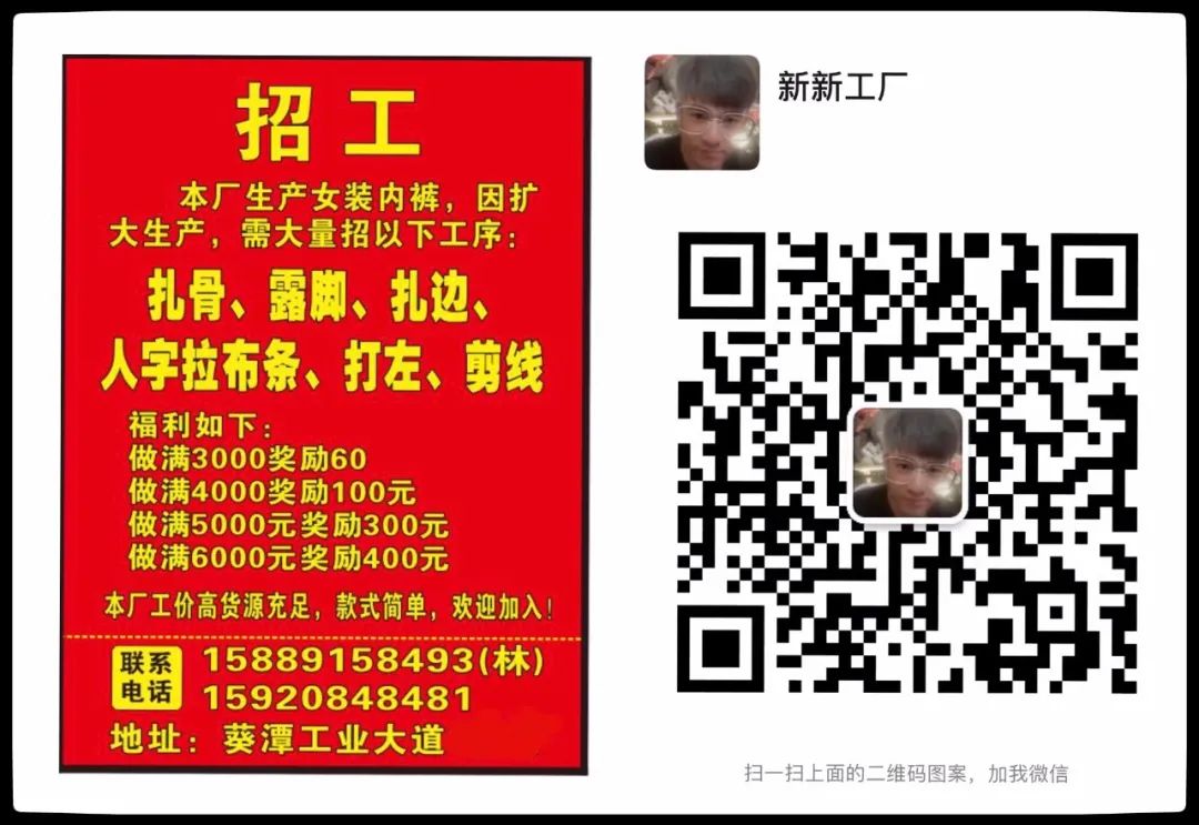 需要发布此类信息的请添加微信号:aluan0663 01 招聘信息 葵潭康德路服装厂 招聘 平车工多名 缝车多名 砍车1名 拉边车工1名 招聘内容 本厂长期生产-缝拉砍货-T恤-简单版,工价高-工资准时发-配合加班-车间每个款号都上千件货,不常换版,带无线网络,车间有空调,熟手优先, 缝车工不会可学,会的可临时。 现需招聘以下工序: 平车工…多名 缝车工…多名,不会可学,会做可临时 砍车…1名 拉边车工1名 可带车回家做,能自订自缝 另招加工厂多个! 地址:葵潭荔枝综合市场康德路51号 02 招聘信息 广州招聘电商仓库人员 优势:团队都是90后、 办公氛围融洽、 晋升空间大可往运助调岗!只想拿固定工资不想吃苦上进的勿扰! 岗位职责:负责日常仓库退货件处理、 整理仓库、 打包发货等售后处理退件问题。 任职要求:有责任心、 做事手脚灵活利索、 适应能力强对生活工作有积极乐观向上的态度。 工作时间:中午12:00-晚上11:00 (当天工作范围事情做好、 即可下班。) 工作要求:18-28岁 (男生、女生) 需:3-5人 薪资待遇:工资4500-6000包住不包吃 (月休两天、不休有补贴300元) 工作地点:广州金沙洲【联一创意园】 联系电话:13430089197 或长按下面二维码添加微信咨询: 03 招聘信息 深圳猪脚饭招聘熟手 工作要求:会切做过的 工作待遇:4500-5000,包吃住 工作时间:一天10小时 联系电话:19925197318 联系电话:13450031720 地址:深圳福永 04 招聘信息 葵潭男装平脚裤 内裤制衣厂 穿标、安纶头(3名) 压线、砍脚、拉脚、扎边 扎骨多名、拉脚、穿标 右刀头(多) 扎骨可以外发 招聘内容 工价高,货源充足。 地址:葵潭玄武管区南华街。 05 招聘信息 汕头生鲜果蔬 招聘水果男工多名 招聘女工多名 招聘猪肉师傅两名 招聘水果男工多名 待遇:包吃住,工资5000元至7000元加提成 招聘女工多名 待遇:包吃住,工资4500元至5500元加提成 招聘猪肉师傅两名 工作要求:熟练卖货能力强的! 工作待遇:包吃住,工资7000至9000,工资不是问题! 以上工作要求:有团队精神,服从安排,尽心尽职的优先,有工作经验的优先考虑,只要你真心付出,就会有丰厚的收获。 工作地址:汕头龙湖区 老板是葵潭人,具体请私下详谈! 黄生联系电话:17728432680 或长按下面二维码添加微信咨询: ![]() 06 招聘信息 葵潭四角裤厂招聘信息 本厂生产四角内裤,长年货源充足,现需招聘以下工序: 一、四针六(两名) 二、坎脚(一名) 三、五边 七边扎骨(多名) 四、扎边(两名) 另外诚邀扎骨加工厂长期合作 地址:葵潭康德路50号(荔枝市场) 联系电话:13826289619 微信同步:13826289619 或长按下面二维码添加微信咨询: 07 招聘信息 广州招聘打包发货一名 招聘处理售后一名 工作要求:年龄限制17到22岁,超过年龄勿扰。 帮忙打包,打下手的,不会可以学的; 处理售后的,有经验最好,不会可以慢慢学。 工作待遇:工资4500,半年后加500,不包吃住,补贴有一千(有个小房,地方小,对住不嫌弃可以住) 工作地址:广州白云梅花园 具体请长按下面二维码添加微信咨询: 08 招聘信息 葵潭吉成学校附近裤头厂 招聘扎橡筋、洛头、拉圆脚 (生手可学) 本厂长年生产中低档女装内裤,货源充足,布料好做,长年一个款,现诚聘: 扎橡筋 扎橡筋 扎橡筋 洛头 洛头 洛头 拉圆脚 拉圆脚 拉圆脚(生手可学) 地址:葵潭镇吉成学校隔壁 联系电话:13714787223 或长按下面二维码添加微信咨询: 09 招聘信息 葵潭男装平角内裤厂 招聘扎骨、压线 (生手可学) 工价高,货源充足 常年不换款 欢迎生熟手加入! 具体请私下详谈! 厂址:葵潭龙湖 联系电话:18934094312 微信同号:18934094312 或长按下面二维码添加微信咨询: 10 招聘信息 深圳生活超市 招聘蔬菜2名(熟手) 待遇:4500-6000 具体待遇请私下详谈! 工作地扯:深圳市龙岗坂田 联系电话:13580164165 微信同步:13580164165 或长按下面二维码添加微信咨询: 11 招聘信息 葵潭超嗨兔外卖招聘 因业务需要,现招以下岗位: