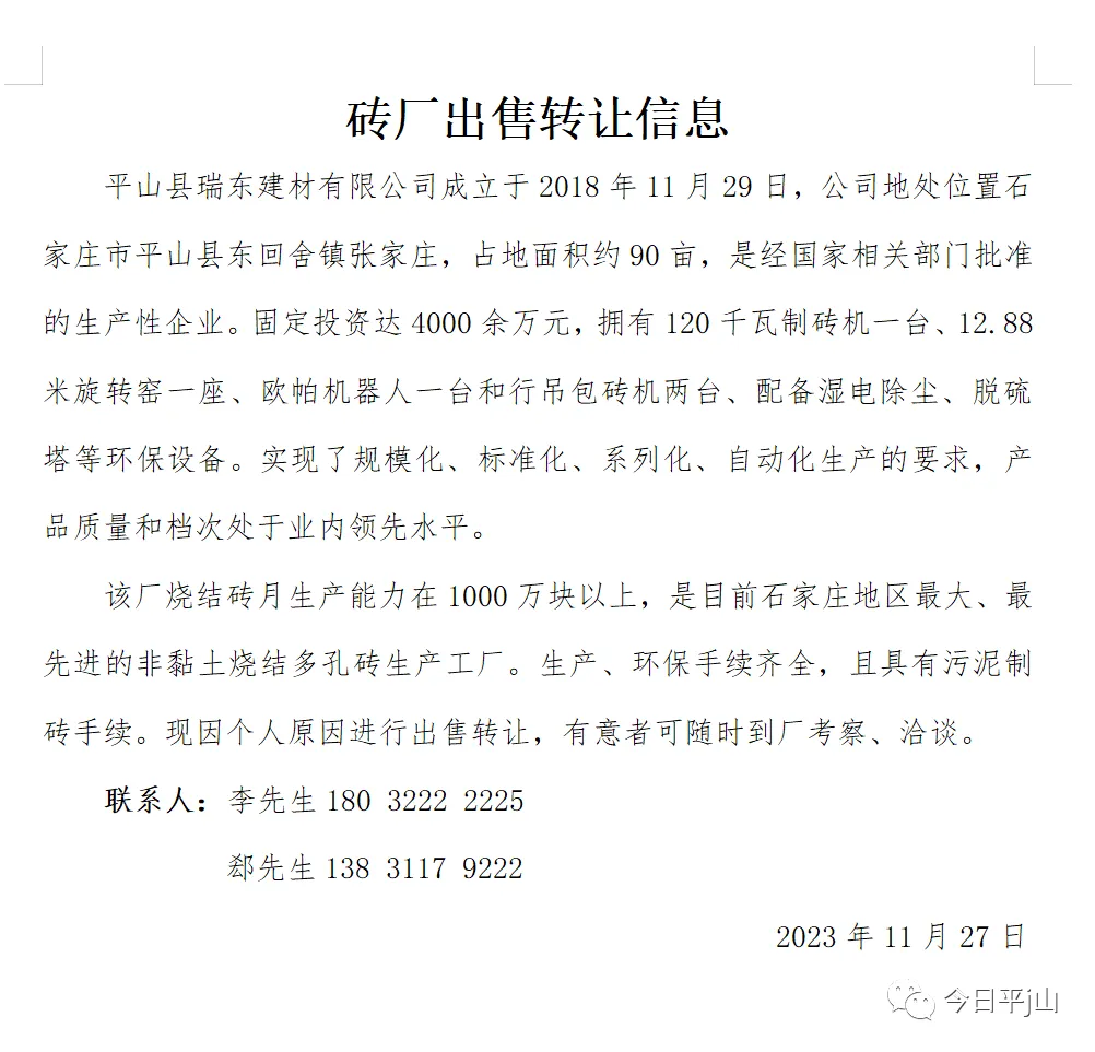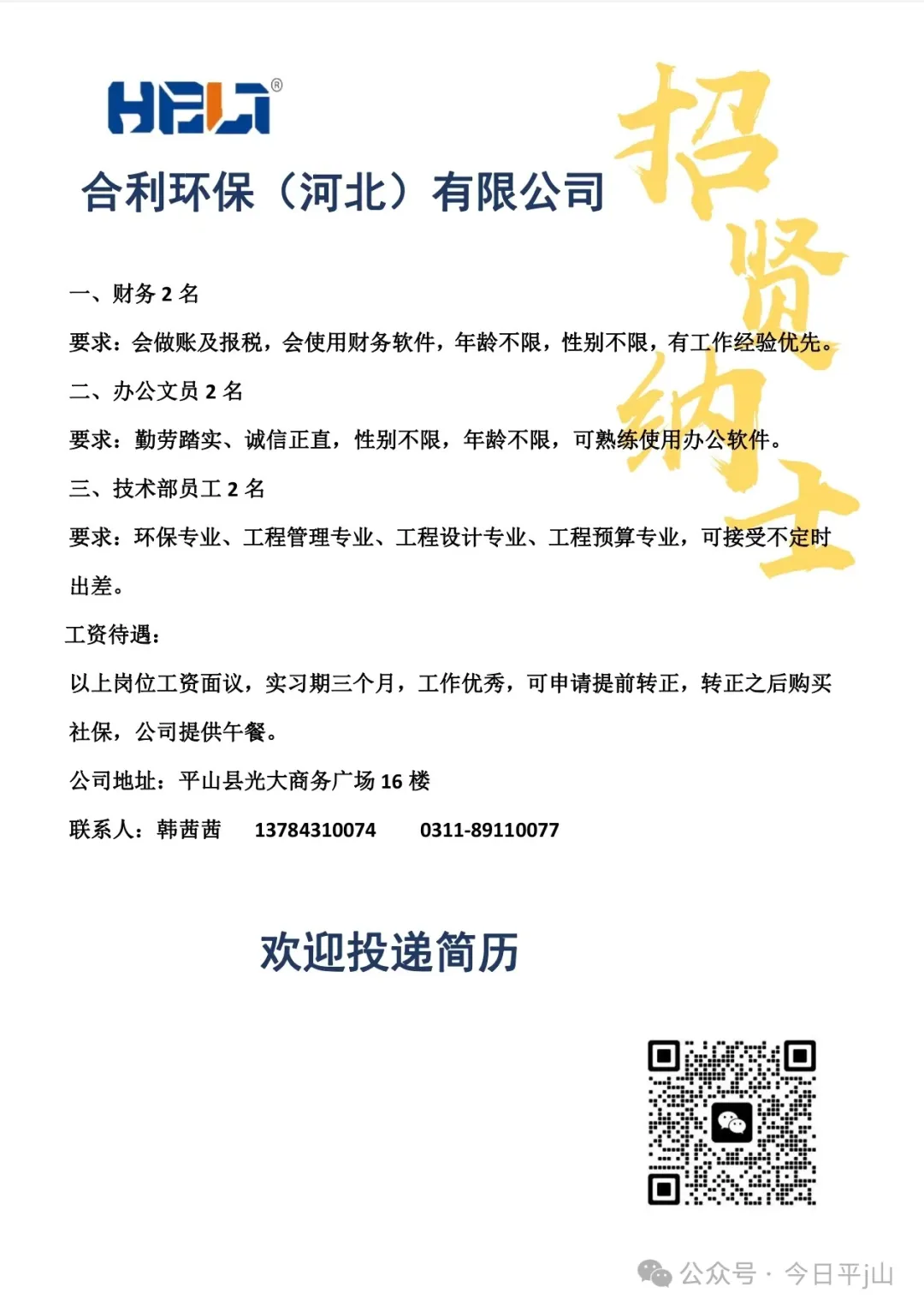 ▲汽车配件,招聘内勤,1名,要求女30-40岁会操作电脑,送货员2名,有责任心,善于沟通交流,有志同道合的来18931842344▲平山最大二手空气能仓库,批发零售各种型号二手空气能,所有机子都经过质量检测才可以销售给客户。售后放心使用▲出租库房,县城南下高速第一个路口,电话15930114841,15511361738▲招聘慧姐老北京烧饼找面点师傅一名工资面议,有意者联系电话:17717117721 地址:平安家园二期斜对过慧姐老北京烧饼▲合利环保(河北)有限公司是一家专业从事烟气环保治理企业,本公司专业承接各类大.中.小型布袋除尘器及脱硫.脱硝的设计.制作.安装.等业务,欢迎新老客户前来咨询选购。公司地址:石家庄市平山县工业区联系人:韩经理 联系电话:0311-89110999 18703318887▲出租,出售丽水湾清一5大车库电话:17733877222▲招聘:1、市政工程、道路工程技术员各一名,懂测量,能熟练使用GPS等测量放点工具,能熟练对接甲方各种签证,有经验者优先;2、园林或者林业专业工程师若干名,主要负责工地施工技术及对接监理和甲方,工作地点平山县域范围内,工资面议。联系人:邢女士,联系电话15831119640邮箱:h414292727@qq.com简历可以先发邮箱▲出售全新扬子35变频空调1699,50圆柱柜机3380全国联保6年,平山县城免费送货安装。可以旧换.冰箱 电视 洗衣机 均有活动,地址:消防队东红绿灯往北200米路西扬子电器。电话(微信)13582617808,82825008▲求购成立一年半以上贸易公司 联系电话 16631188886▲出售转让或合作石家庄平山蛋托厂,手续齐全,有意请联系18332055550刘▲奶茶技术手把手包教包会,让你自己开店无忧,转让全套奶茶设备只要全力以赴就会变的简单✨ 联系电话:15081839734(微信同号)▲求租:平山县城周边厂房长40米—50米 联系电话:031182932775 ▲招聘公告:本公司招聘办公室资料员,学历大专以上,年龄38周岁以下,熟悉word,excel等相关办公软件操作,有项目资料员经验者优先,工作地点平山县费城国际。有意者联系王女士,联系电话15373083082招聘车险客户经理10名,高中以上学历,双休节假日休地址:平山县转盘365广场2楼,联系人及电话:马垚180313627231、丛台酒业务员2名(1名为厂家业务),有相关酒饮销售经验者优先,要求会开车。2、全职会计1名,有快消品公司工作经验者优先。工资待遇面谈。面试地址:平山县供销大楼北酒鬼酒烟酒店▲招聘:柏东三楼女装专柜急招;导购员2名,有经验者优先;工资底薪➕ 提成➕ 奖金。 联系电话:15284314646▲疫情过后,平山要结婚的宝宝们抓紧预定啦!本店承接录像,跟妆,婚庆,婚车,演出等,需要的详询18132000071同微信