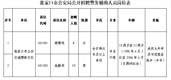 根据工作需要,张家口市公安局委托张家口市金桥人力资源开发服务中心面向社会公开招聘警务辅助人员(辅警),现将有关事项公告如下:坚持德才兼备、以德为先的用人标准,按照公开、公平、择优的原则实行公开招聘工作。本次共计招聘警务辅助人员28名,凡应聘人员将按照招聘条件要求报名,本次招聘辅警岗位主要用于交警一线执勤工作。应聘人员可通过以下方式查询招聘信息:“张家口市公安局网站”,“张家口公安”微信公众号;张家口市金桥人力资源开发服务中心网站,“张家口金桥人力资源开发服务中心”微信公众号。2、拥护中华人民共和国宪法,遵守法律法规,品行端正;3、身心健康,体貌端正,无残疾,无口吃,无色盲色弱,无纹身,无明显疤痕,无传染病,无吸毒史,无抑郁史及精神心理问题,直系亲属无精神病史,无被开除或辞退经历,具有履行职责的身体条件和工作能力;4、男性身高不低于175厘米,女性身高不低于165厘米,体重在标准体重85%-125%之间,标准体重(千克)=身高(厘米)-110;5、自愿从事公安辅警工作,热爱交管工作,具有忠诚、奉献、吃苦耐劳的精神,遵守工作纪律,保守工作秘密,服从组织分配;7、本人未与其他单位签订任何劳动合同或确立劳动关系;(1)本人或者家庭成员参加非法组织、邪教组织或者从事其他危害国家安全活动的;(3)编造、散布有损国家声誉、反对党的理论和路线方针政策、违反国家法律法规信息的;(7)被开除公职、开除军籍或者因违法违规被辞退解聘的;(8)从事警务辅助工作合同期未满擅自离职、开除、辞退、退工的;(10)国家和省规定的其他不适宜从事警务辅助工作的。此次招聘辅警共计28名,男性20名,女性8名。年龄在18周岁至25周岁(1998年6月3日至2006年6月3日期间出生),全日制大专及以上学历,退役士兵学历可放宽至高中(中专),报名时须在工作简历中注明服役时间。具体详见《张家口市公安局公开招聘警务辅助人员岗位表》,现役军人、在校在读学生均不得报考。应届毕业生须于2024年7月底前毕业取得学历。本次招聘采用网上报名和资格初审的方式。报名截止前2天报名人数比较集中,请尽量避开报名高峰期,以提高报名效率。报名网址:http://110.249.194.218:90/报名时间:2024年6月11日9:00至2024年6月13日17:00。缴费时间:2024年6月11日9:00至2024年6月14日17:00。1.考生开始报名前,须完全了解本次招聘公告和拟应聘岗位条件,认真阅读并同意《报考诚信承诺书》,按步骤进行具体操作。2.网上报名实行严格的自律机制,必须承诺履行《报考诚信承诺书》,对提交审核的报名信息的真实性负责,在资格复审时,凡发现网上填报的信息与实际情况不一致的,取消应聘资格。3.网上报名须用有效的二代《居民身份证》申请“报名号”,并预选应聘岗位,获取“报名号”和“初始密码”后才能登录报名系统,进行填表和提交审核,报名号是登录报名系统的唯一标识,密码可修改,均保管好。4.按照《填表说明》规范填写或选择表项,按报名系统要求上传彩色免冠照片,否则将被报名系统自动拒绝。报考信息通过审核后才能进行交费操作,交费成功即完成报名。5.考生“提交审核”后信息将被锁定,在未反馈审核结果前不能修改。一般情况下,审核员24小时内会在报名系统上回复审核结果。“审核未过”的,可根据提示的未过原因,修改信息并重新提交审核;“审核通过”的,将不能再修改报名信息,进入交费程序。请考生尽量不要选择最后时刻报名,以避免因报考条件不符或填报信息不完整等原因“审核未过”而错失改报机会。6.应聘考生务必牢记报名和交费截止时间、考试时间等重要信息,凡是在规定时间内未完成相关操作的,将被视为自动放弃。同时,报名和考试期间务必保管好个人的证件和信息,因个人原因造成丢失、被他人盗用和信息被恶意篡改而影响报名和考试的,责任自负。7.报名交费通过网上付费,每人报名考务费100元。未按期缴费者视为自动放弃报考。享受城乡最低生活保障家庭、原农村建档立卡贫困家庭的应聘人员可减免报名考务费。具体流程为:先行报名缴费→提交审核材料→审核通过→退费。符合减免条件的应聘人员,请于笔试结束前将以下相关证明扫描件发送到指定邮箱(zjksjqscb@126.com)。(1)享受城乡最低生活保障家庭的提供户籍所在地的县、区级民政局出具的低保证明及有效期内低保证。(2)原农村建档立卡贫困家庭的提供县、区级乡村振兴部门出具的原建档立卡户证明及扶贫手册。经审核符合减免条件的,报名考务费将于笔试结束后10个工作日内返还至考生缴费支付宝账户。体能测评准考证打印时间:2024年6月20日-2024年6月21日。体能测评项目为:纵跳摸高、10米×4往返跑、1000米跑(男性)、800米跑(女性)。(二)笔试准考证打印时间:2024年6月27日至2024年6月28日。笔试内容为《行政职业能力测验》和《公共基础知识》,考试时间为120分钟,满分为100分。笔试成绩占综合成绩的50%。笔试成绩公布后,根据笔试成绩由高到低按照拟招聘人数1:2比例参加资格复审。招聘人数1:2比例内,末位成绩并列的考生全部进入资格复审。若参加笔试人数低于拟招聘人数1:2比例时,参加笔试且取得成绩的考生全部进入资格复审。资格复审是将应聘人员报名时所填报的信息进行现场审核,须出具以下证件和材料的原件及复印件1份:身份证、毕业证、户口本(户主页及