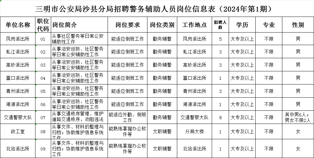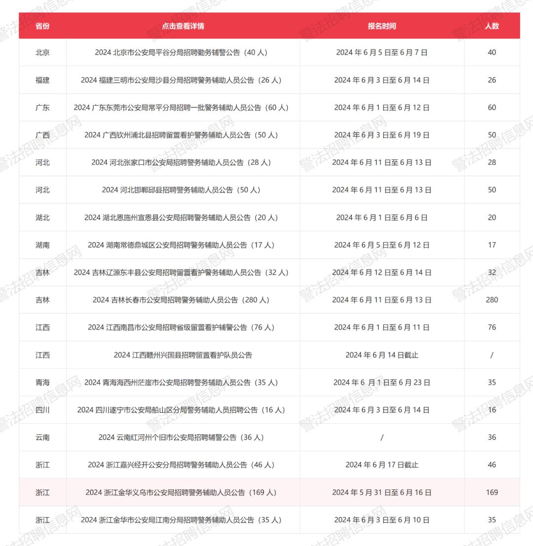 识别上方二维码关注 回复“0603”查看完整公告 2024北京市公安局平谷分局招聘勤务辅警公告(40人)为适应平谷公安工作发展,根据工作需要,北京市公安局平谷分局面向社会公开招聘勤务辅警。现将有关事项公告如下: 一、招聘人数及岗位职责 本次计划招聘勤务辅警40名(其中男性36名、女性4名)。 岗位职责:巡逻值守、治安检查以及维护国家重大活动和大型群众性活动安全秩序等维护社会治安工作;疏导交通,劝阻、纠正交通安全违法行为,采集交通违法信息等维护交通秩序工作;查缉毒品、盘查堵控等预防、制止违法犯罪工作;接报案、受案登记、接受证据、涉案信息采集录入、案事件现场秩序维护,以及在公安机关办案场所、监管场所看管监控违法犯罪嫌疑人、保管涉案财物等案事件办理处置工作;接受处理群众求助、救助受伤受困人员、开展宣传教育等工作;国家和本市规定可以由勤务警务辅助人员协助开展的其他工作。 二、报考条件 (一)具有中华人民共和国国籍。 (二)拥护中国共产党领导,拥护中华人民共和国宪法,遵守国家法律法规,品行端正。 (三)具有北京市平谷区户籍。 (四)自愿从事勤务辅警工作,具有忠诚、奉献、吃苦耐劳的精神,服从组织分配。 (五)具备良好的力量、速度、耐力、灵敏和柔韧性等身体素质,能通过体能测试,具有在复杂、多变和危险的环境中处置事件的能力。 (六)具有国家承认的大专及以上学历(报名前取得毕业证书,2024年应届毕业生应在2024年7月份以前取得毕业证)。 (七)年龄在18-35周岁(1988年5月至2006年5月之间出生)。 (八)具有机动车驾驶证。 (九)有下列情形之一的不得聘用为勤务辅警: 1.曾连续六个月以上在国(境)外留学、工作、生活,在国(境)外期间经历和政治表现难以考察的; 2.因犯罪受过刑事处罚或者涉嫌犯罪尚未结案的; 3.受过行政拘留处罚或者因涉及赌博、毒品、卖淫、嫖娼等其他治安管理处罚的; 4.被依法列为失信联合惩戒对象的; 5.被开除公职、开除军籍的; 6.按照国家和本市规定不得聘用为警务辅助人员的其他情形。 勤务辅警的招聘实行回避制度。公安民警和职工的配偶、直系血亲关系、三代以内旁系血亲关系以及近姻亲关系,除另有规定以外,原则上不得被招聘到该民警、职工同一部门,或者有直接管理、直接利害关系的岗位工作。 三、招聘程序 (一)报名和资格审核 1.报名时间:2024年6月5日至6月7日上午9:00-11:30,下午14:00-17:00。 2.报名地址:平谷区保安公司,大发路3号。 因工作场地有限,不提供停车位,请选择公共交通工具出行。 3.报名注意事项: 请报名人员下载并填写附件“报名表”(报名表为上下联,上下联两部分均需填写),并附本人近期一寸白底免冠证件照电子版,注:报名表需填好后打印上交报名。 报名及资格审核时,需携带填写好的报名表、身份证、户口本、驾驶本、国家承认的学历证书、学信网《教育部学历证书电子注册备案表》(2024年应届毕业生报名时未取得毕业证书的需学校出具2024年毕业证明),以上证件需原件及复印件,户口本复印件需复印首页及本人页。资格审核不合格的报名人员,不能参加招聘考试。 通过资格审核的报名人员,审核人员会在报名表上填写报名号并加盖齐缝章。现场盖章后,上联由招聘单位留存,下联由报名人员留存,请报名人员务必妥善保管,切勿遗失。考试时,该报名表将作为入场的重要凭证。报名号为此次招聘工作的唯一身份标识。 (二)笔试 笔试为综合能力测验,本次考试无指定培训机构和参考用书。 1.报名后根据报名情况具体确定笔试日期。笔试的时间、地点、考场及座位情况将在平安绿谷微信公众号进行公布,请考生时刻关注。 2.报考人员应按照确定的时间、地点参加考试。参加考试时,必须携带本人身份证、已加盖招聘单位齐缝章的报名表考生联。 3.报考人员应保证个人报名信息的真实性,禁止使用虚假信息报名,如有发现经查实直接取消考试及聘用资格。 4.笔试当天告知成绩公告时间和方式。成绩公布后,按笔试成绩由高到低排序,分别按照实际招聘人数1:3的比例确定面试名单。 5.笔试总成绩为100分,由招聘部门研究划定合格分数线,未达到合格分数线的人员,不能进入面试。 (三)面试 面试时间、地点在平安绿谷微信公众号查询。面试总成绩为100分,合格分数线为60分。 (四)成绩公示 本次考试分为笔试和面试两部分,笔试、面试均以百分制计算。考试综合成绩笔试占50%、面试占50%。笔试、面试成绩均达到合格分数线的,分别按照综合成绩排名的1:1.5比例确定人员进入体能测试、心理测试、体检与考察环节。考生可在平安绿谷微信公众号查询考试成绩。 (五)体能测试、心理测试、考察、体检 1.招聘部门组织进入后续环节人员进行体能测试、心理测试、考察、体检。项目标准参照招录人民警察有关规定执行,体检和心理测试费用由考生自理。 2.体能测试、心理测试、考察、体检任意一项不合格的,不能聘用,空缺岗位按综合成绩从高到低依次递补。 (六)公示与聘用 北京市公安局平谷分局对各项测试和考察、体检合格人员,根据计划招聘人数和综合成绩排名,确定拟聘用人员(若综合成绩相同且超出招聘计划人数时,按笔试成绩排名进行排序,若笔试成绩仍相同,采取加试方式确定排名),并在平安绿谷微信公众号进行公示,公示期5个工作日。公示期