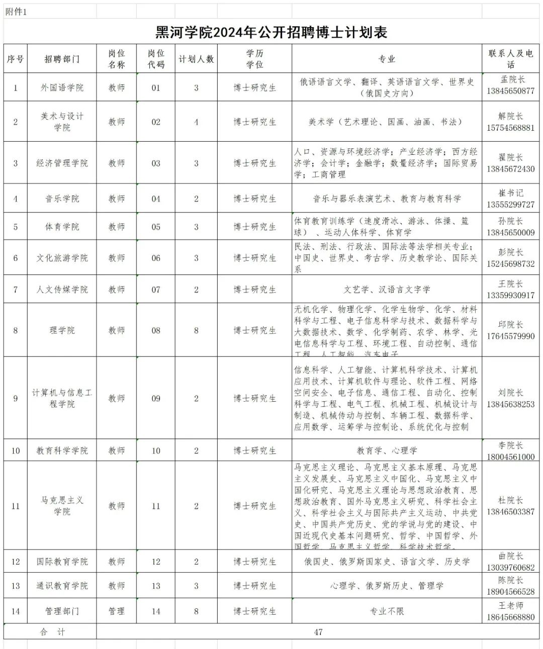 | 黑河学院2024年公开招聘博士公告根据《黑龙江省事业单位公开招聘人员暂行办法》(黑办发﹝2006﹞32号)、《黑龙江省事业单位公开招聘工作人员实施细则》(黑人社发﹝2014﹞63号)、《关于进一步做好省直事业单位公开招聘工作的通知》(黑人社发﹝2015﹞32号》和《关于全面下放省直事业单位公开招聘管理权限的通知》(黑人社发﹝2015﹞66号)等文件规定,经学校研究决定,面向社会公开招聘博士,现将有关事宜公告如下: 一、学校简介 详见黑河学院网站主页(http://www.hhhxy.cn/)“学校概况”。 二、招聘计划 《黑河学院2024年公开招聘博士计划表》(附件1) 三、招聘原则 学校招聘工作坚持公开、公平、竞争、择优的原则。 四、招聘基本条件 (一)具有中华人民共和国国籍,坚持中国共产党的领 导,政治立场坚定,热爱党的教育事业。遵守国家宪法、法律、教育法规和教师职业道德。 (二)忠诚党的教育事业,爱岗敬业,具有奉献精神、协作精神和创新精神。 (三)符合我校学科、专业建设需要,具有岗位所需的专业知识、能力、经历及身体条件。 (四)具有博士研究生学历、学位,年龄一般在40周岁(1983年5月27日以后出生<含>)及以下。 (五)符合招聘岗位的学历和专业要求的应聘人员须在2024年12月31日前获得报名岗位要求的博士毕业证和学位证。 (六)港澳台地区和国外院校博士,须有教育部留学服务中心的学历学位认证书。 (七)下列人员不得报名: 1.曾受过刑事处罚的人员、曾被开除中国共产党党籍和公职的人员。 2.受党纪政纪处分且处分在影响期内未解除的人员。 3.在各级公务员和事业单位工作人员招考中被认定有舞弊等严重违反录用纪律行为且尚在记录期的人员。 4.被依法列为失信联合惩戒对象人员。 5.法律法规规定不得录用为事业单位工作人员的其他情形的人员。 五、招聘程序 (一)报名 应聘人员填写《黑河学院公开招聘博士人员登记表》(附件2),将个人简历、身份证、博士研究生学历学位证书、硕士研究生学历学位证书、本科学历学位证书扫描件及其它能够证明本人工作能力和水平的材料(有过学生干部经历的要把相应材料一并提供;应届毕业生另须提供学习成绩单、在校生证明)一并发送hhxyrsk@163.com。发送邮件主题及附件命名格式为XXX大学XXX专业XXX同志应聘XXX职位材料。 报名时间:从公告日至2024年11月25日 (二)资格审查 1.学校对应聘人员进行资格审查,通过电子邮件或电话向应聘人员反馈审查结果。 2.资格审查通过的应聘人员现场确认时需提交下列相关材料: (1)考生携带身份证,网上打印的应聘人员基本情况表(一式两份),到指定地点进行现场资格确认。 (2)各类证书原件及复印件1份(需提供本科及最高学历、学位证书;应届毕业生由毕业院校出具应届毕业生证明,内容包括:姓名、性别、出生日期、所在学院、所学专业、毕业时间、毕业生就业推荐表)。 (3)主要科研成果的原件及复印件1份(含论文、著作、获奖和课题等)。其中SCI、SSCI、EI收录论文需提供检索证明,明确标注大类分区;科研项目需提供立项通知书及证明个人参与名次的相关材料。 (4)其他招聘计划中必备条件的相关支撑材料原件及复印件。 六、考试 本次招聘采取面试方式。 (一)面试采取百分制计分方式,根据不同招聘岗位的需要分别进行试讲、答辩等考核方式。面试成绩低于60分者为不合格,不予录用。 (二)学校将根据报名情况组织两次面试,上半年面试时间为2024年6月24日-30日,下半年面试时间为11月25日-30日。 (三)考试总成绩=面试成绩,在黑河学院官方网站“公告”栏公示3个工作日。 (四)按考生总成绩由高分到低分等额确定体检和考核人选。 七、考核 学校统一对拟聘人员进行考核,考核内容为思想政治表现、道德品质、业务能力、工作实绩和档案情况等,并对资格条件进行复审。 八、体检 学校统一对拟录用人员进行体检,体检不合格者不予聘用。体检标准参照修订后的《公务员录用体检通用标准(试行)》。 九、公示与聘用 按照考试、体检和考核结果,经学校研究,校长办公会审批后,在黑河学院网站主页(http://www.hhhxy.cn/)“公告”公示7个工作日。公示期满无异议者,与学校签订事业单位聘用合同,按照有关规定履行聘用手续。 十、待遇 对录用的人员,学校将依据《黑河学院高层次人才引进暂行办法(修订)》(黑院政发﹝2018﹞15号)落实事业编制,发放安家费、住房补贴、学位津贴,提供科研启动经费,享受相应待遇。 十一、联系方式 联系人:戴老师 王老师 咨询电话: 0456-6842104; 0456-6840266; 13091760919; 18645668880 监督电话:0456-6842287(学校纪委办公室) 监督邮箱:HHXYJWBGS@126.com 通信地址:黑河学院人事处(黑龙江省黑河市学院路1号) 邮编:164300 本公告由黑河学院人事处负责解释。 附件: 1.黑河学院2024年公开招聘博士计划表 2.黑河学院公开招聘博士人员登记表