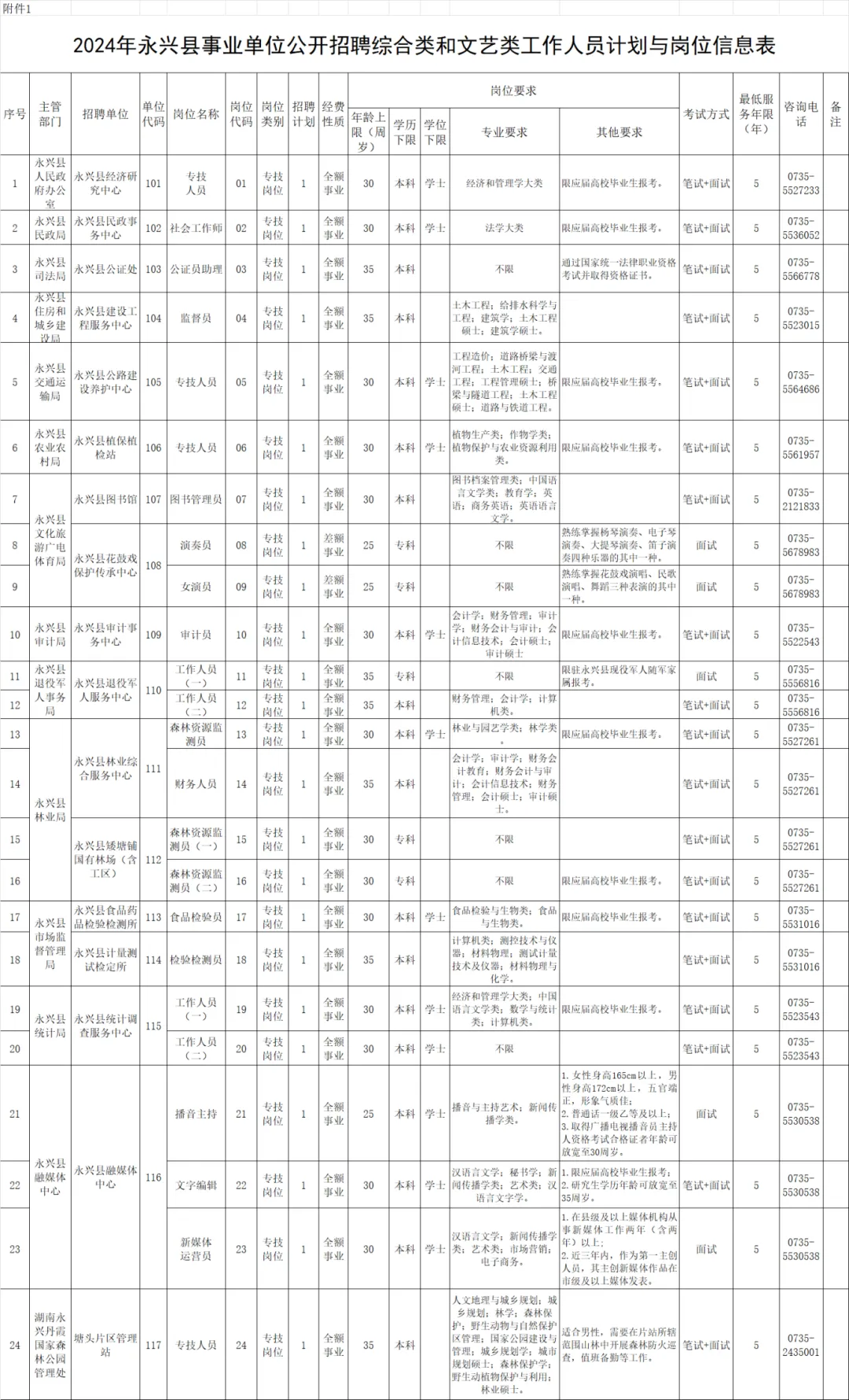 | 各位郴州的父老乡亲们,大家好,这里是郴州便民信息,一个属于郴州人自己的便民公众号! 根据《事业单位人事管理条例》(国务院令第652号)、《关于事业单位公开招聘岗位条件设置有关问题的通知》(人社部规〔2017〕17号)、《关于进一步做好军人随军家属就业安置工作的通知》(军政〔2022〕54号)、《关于支持戏曲传承发展的意见》(湘政办发〔2016〕24号)、《关于进一步严格程序规范事业单位公开招聘工作的通知》(湘人社发〔2014〕34号)、《湖南省事业单位公开招聘人员办法》(湘人社发〔2019〕1号)、《关于进一步规范我省事业单位公开招聘考试工作的通知》(湘人社函〔2021〕37号)和《关于进一步改进事业单位公开招聘工作的实施意见》(郴组〔2016〕11号)等文件精神,经永兴县委、县政府同意,2024年永兴县事业单位面向社会公开招聘综合类工作人员19名、文艺类专业技术人员5名,现公告如下: 一、招聘计划 1.计划招聘事业单位综合类工作人员19名、文艺类专业技术人员5名。各招聘单位具体招聘岗位、招聘计划人数及资格条件等详见《2024年永兴县事业单位公开招聘综合类和文艺类工作人员计划与岗位信息表》(附件1,以下简称“《计划与岗位信息表》”)。