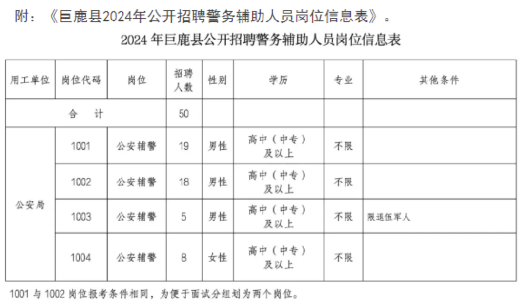 2024年邢台巨鹿县公开招聘50名警务辅助人员公告 具有国家承认的高中(中专)及以上学历(含2024年普通类高校应届毕业生); 本次招聘共计50名,其中男性42名,女性8名。 报名时间:2024年6月7日9:00至12日17:00。