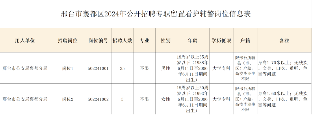2024年邢台市襄都区公开招聘40名专职留置看护辅警公告 具有国家承认的大学专科或以上学历 报名时间:2024年6月11日9:00至6月13日17:00。