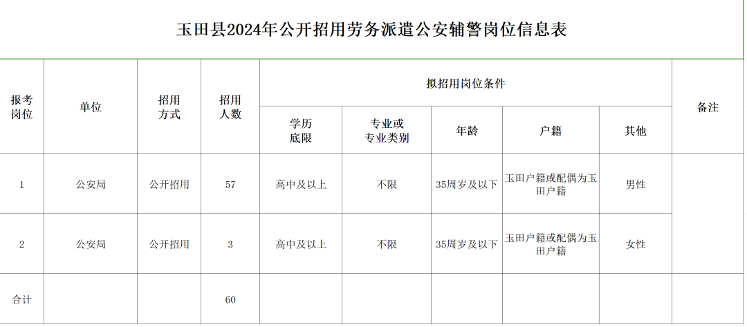 2024年唐山市玉田县公开招用劳务派遣公安辅警60人公告 公开招用劳务派遣公安辅警60人, 其中男性57人,女性3人。 学历要求:高中及以上学历 报名时间:2024年6月10日9:00至6月14日17:00